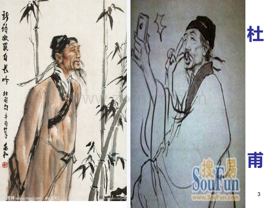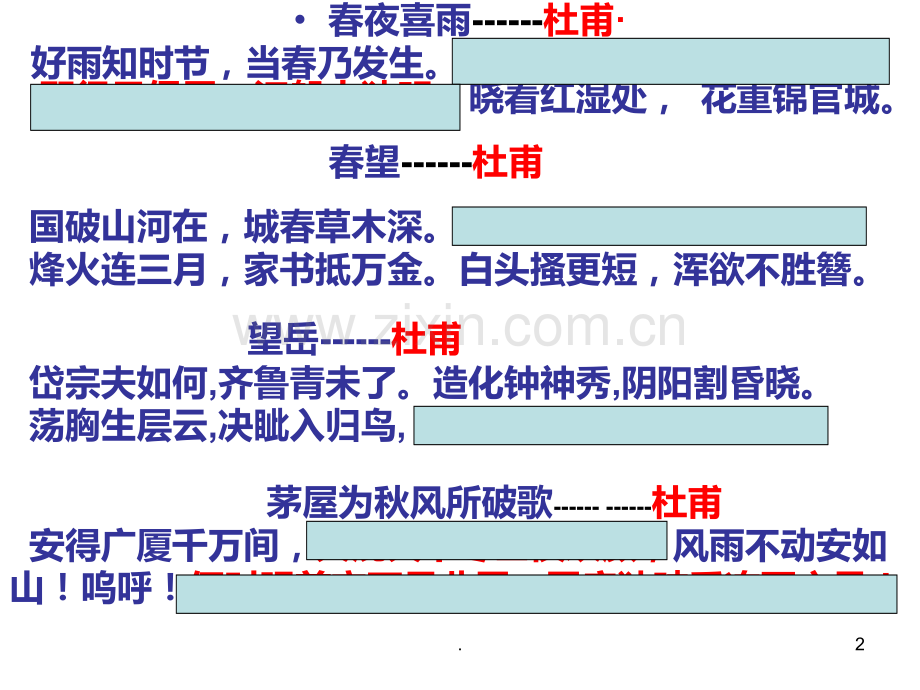 旅 夜 书 怀杜 甫 江苏省淮阴中等专业学校 刘冬梅1.春夜喜雨-杜甫 好雨知时节,当春乃发生。随风潜入夜,润物细无声。野径云俱黑,江船火独明。晓看红湿处,花重锦官城。望岳-杜甫 岱宗夫如何,齐鲁青未了。造化钟神秀,阴阳割昏晓。荡胸生层云,决眦入归鸟,会当凌绝顶,一览众山小。春望-杜甫 国破山河在,城春草木深。感时花溅泪,恨别鸟惊心。烽火连三月,家书抵万金。白头搔更短,浑欲不胜簪。茅屋为秋风所破歌-杜甫 安得广厦千万间,大庇天下寒士俱欢颜,风雨不动安如山!呜呼!何时眼前突兀见此屋,吾庐独破受冻死亦足!2.杜 甫3.旅夜书怀 杜 甫 细草微风岸,危樯独夜舟。星垂平野阔,月涌大江流。名岂文章著,官应老病休。飘飘何所似,天地一沙鸥。4.教学目标 1、学会通过知人论世的方法鉴赏诗句;理解诗歌的内容。2、理解本诗寓情于景的艺术特色。3、理解诗歌中抒发的宦游疲倦、漂泊孤苦的悲凉苦闷之情。5.1、通过“旅”字看背景6.旅:是旅居之意。杜甫在唐代宗广德二年(764)的春天携家人自阆州折回成都,入严武幕。本来有这位好朋友的帮助,他满可以在成都住下去,却不料严武在第二年四月忽然死去。他不得不再次离开成都,乘舟东下,经嘉州(乐山)、戎州(宜宾)、渝州(重庆)、忠州(忠县),于九月到达云安(四川云阳)。旅夜书怀就是在这次旅行中写的。这一年,杜甫已满53岁,杜甫的思想:穷年忧黎元,叹息肠内热.他一直患有肺病和风痹,不时发作。两年前,当安史之乱初平时,他曾有返回长安或洛阳的打算,但因地方军阀乘机作乱及其他原因未能如愿。这回严武之死,他决心离开四川,转作潇湘之游,其实也是不得已而为之,因此,一路上心情十分沉重,不知一生漂泊何时才是个尽头。这首诗就集中的表现了他这种心情。7.2 2、通过“夜”字察实景8.夜:指作者写作这首诗的时间是在夜晚。诗句有:细草微风岸,危樯独夜舟。星垂平野阔,月涌大江流。思考:首先首联颔联描写了哪些景物?这些景物有什么特点?这些构成了一幅怎样的画面(意境),抒发作者什么情感?(小组讨论作答)9.意境细草微风岸,危墙独夜舟。孤立突兀的危樯和孤独的小舟对抗着漫漫长夜细草:微风:阔岸:危樯:孤夜:独舟:意象画面孤弱的细草在无边的风里飘摇不定 寂静凄冷情感漂泊无依孤独寂寞10.星垂平野阔,月涌大江流。低垂的星空:辽阔的平野:涌动的月影:浩荡的大江:星空低垂愈显原野辽阔无边明朗的月空下江水汹涌澎湃奔流不息星盏衬托着无边荒凉的平野一轮明月映照在水中,随着江水的流动而浮荡着意象画面意境雄浑阔大 情感孤苦 伶仃无依无靠 11.3、通过“书怀”悟实情12.名岂文章著,官应老病休。飘飘何所似,天地一沙鸥。如何理解颈联“名岂文章著,官应老病休”的含义?(提示:变成陈述句,联系学过的诗体会作者思想回答。)明确:我的名声是因为文章而显著,做官不是因为年老多病而退休。这是反话,立意很含蓄。诗人素有远大的政治抱负“在望岳和茅屋为秋风所破歌中可以看出一二),但这种理想长期被压抑而不能施展,以此声名竟因文章而著,这实在不是他的心愿。杜甫此时虽年老多病但休管是因为被排挤。这里说反话其实内心希望“因建功立业而出名;希望到老病才休官,而非现在受排挤”。这句话揭示了杜甫政治失意是他漂泊孤寂的根本原因。13.尾联“飘飘何所似,天地一沙鸥。”用了什么手法?有什么效果?(方法步骤:一叙、二析、三评。)叙述:比喻作者把自己比着天地间一只孤独的 沙鸥。有一种自伤漂泊之感,更显孤独和凄凉之情.也体现诗人初离官场的自在感,解脱感。评价:分析:14.译文岸上的细草在微风的吹拂下,发出瑟瑟的声响。江上只有一只孤舟,依岸而宿。诗人就舟而居。遥望原野,远处天与地似乎相接了,天边的星宿也仿佛下垂得接近地面。大江之中,江水浩浩荡荡东流,一轮明月映照在水中,随着江水的流动而浮荡着。名声难道应因为文章而显著吗?做官应因为年老多病而退休。“我”在这世间漂泊,恰似那在广阔天地飞翔的一只沙鸥罢15.总结:通过课文题目了解诗歌内容 1 1、通过“旅”字看背景 2 2、通过“夜”字察实景 3 3、通过“书怀”悟实情由近到远,由下到上,借景抒情,寓情于景,情景交融,反衬(以乐景衬哀情),直抒胸臆,比喻 。艺术手法:16.关于格律诗:律诗属于格律诗。因为格律诗是在古体诗的基础上发展形成的,所以又称之为近体诗。所谓格律诗就是在形式上要遵守一定的“格”。就每首诗的句数而言,分为绝句和律诗:绝句为四句,共两联,分为第一联和第二联;律诗为八句,共四联,依次称为首联、颔联、颈联和尾联。就每句的字数而言,分为五言和七言两种:五言即每句五个字;七言即每句七个字。就语言形式而言,律诗的颔联和颈联必须对仗,首尾两联一般不作对仗要求;绝句的两联一般也不作对仗要求。就音韵而言,每首诗偶数句的末尾的字(即韵脚)必须押韵。起句(第一句)可以押韵,也可以不押韵;起句不押韵的为正格,押韵的为偏格。17.孤雁 杜甫孤雁不饮啄,飞鸣声念群。谁怜一片影,相失万重云。望尽似犹见,哀多如更闻。野鸭无意绪,鸣噪自纷纷。1、从体裁看,这首诗是格律诗中的 ()言律诗,它由4联8句组成,每联都有特定的称谓;这首诗的对仗联有()。2这首诗描写了失落的孤雁叫唤、追赶雁群的形象,其形可悯,其志可嘉。以第二或第四联为例,分析