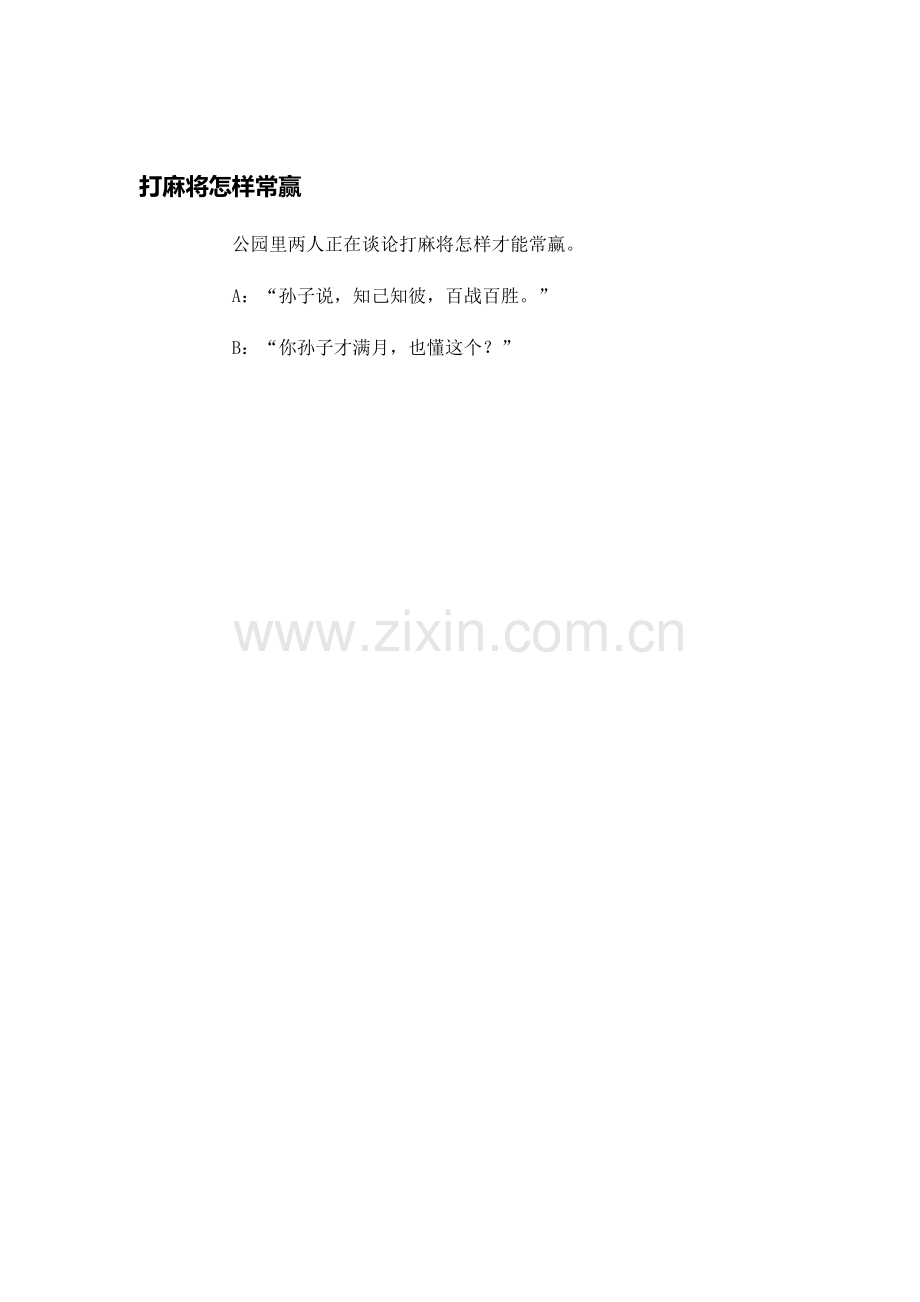 打麻将怎样常赢   公园里两人正在谈论打麻将怎样才能常赢。   A:“孙子说,知己知彼,百战百胜。”   B:“你孙子才满月,也懂这个?”