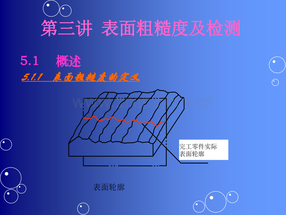 第三讲第三讲 表面粗糙度及检测表面粗糙度及检测5.1 5.1 概述概述5.1.1 5.1.1 表面粗糙度的定义表面粗糙度的定义完工零件实际表面轮廓表面轮廓 波纹度轮廓波纹度轮廓宏观形状轮廓宏观形状轮廓实际表面轮廓实际表面轮廓零件表面几何形状误差及其组成成份表面粗糙度轮廓表面粗糙度轮廓5.1.2 5.1.2 表面粗糙度的影响表面粗糙度的影响1.1.影响零件的耐磨性。影响零件的耐磨性。2.2.影响配合性质的稳定性。影响配合性质的稳定性。3.3.影响零件的疲劳强度。影响零件的疲劳强度。4.4.影响零件的抗腐蚀性。影响零件的抗腐蚀性。5.5.影响零件的密封性。影响零件的密封性。6.6.对零件的外观、测量精度、表面光学性对零件的外观、测量精度、表面光学性能、导电导热性能和胶合强度等也有着能、导电导热性能和胶合强度等也有着不同程度的影响。不同程度的影响。5.2.1 5.2.1 基本术语基本术语5.2 5.2 表面粗糙度评定参数及其数值表面粗糙度评定参数及其数值1.1.取样长度取样长度l指指测测量量或或评评定定表表面面粗粗糙糙度度时时,所所规规定定的的一一段段基基准准线线的的长长度度用用l表示。表示。目的目的:限制、减弱波纹度、形状误差的影响限制、减弱波纹度、形状误差的影响至少包括五个峰值,五个谷值,并为标准长度。至少包括五个峰值,五个谷值,并为标准长度。0.08,0.25,0.8,2.5,8.02.2.评定长度评定长度Ln由由于于零零件件的的表表面面粗粗糙糙度度不不一一定定很很均均匀匀,在在一一个个取取样样长长度度上上往往往往不不能能合合理理反反映映某某一一表表面面粗粗糙糙度度特特征征,需需在在表表面面上上取几个取样长度。取几个取样长度。Ln=5l中线lnlllll取样长度和评定长度 3.3.轮廓最小二乘中线轮廓最小二乘中线m mlryi最小二乘中线表面粗造度轮廓的最小二乘中线 4.4.轮廓算术平均中线轮廓算术平均中线m m算术平均中线 lrF1F2FiF1F2Fi表面粗造度轮的算术平均中线5.2.2 5.2.2 评定参数及数值评定参数及数值1.1.轮廓算术平均偏差轮廓算术平均偏差RaRa轮廓算术平均偏差Ra的确定Raxynyiy1y2 近似为2.2.微观不平度十点高度微观不平度十点高度RzRz在在取取样样长长度度内内个个最最大大的的轮轮廓廓峰峰高高y ypipi平平均均值值与与5 5个个最最大大轮轮廓谷深廓谷深y yvi vi平均值之和。平均值之和。3.3.轮廓最大高度轮廓最大高度RyRy在在取取样样长长度度内内,轮轮廓廓的的峰峰顶顶线线和和谷谷底底线线之之间间的的距距离离。峰峰顶顶线线和和谷底线平行于中线且分别通过轮廓最高点和最低点。谷底线平行于中线且分别通过轮廓最高点和最低点。Ry=Ypmax+Yvmax4.4.轮廓单峰平均间距轮廓单峰平均间距S S5.5.轮廓微观不平度的平均间距轮廓微观不平度的平均间距SmSm6.6.轮廓支撑长度率轮廓支撑长度率t tp p7.7.表面粗糙度参数值表面粗糙度参数值5.3 5.3 表面粗糙度代号及标注表面粗糙度代号及标注5.3.1 5.3.1 表面粗糙度的基本符号表面粗糙度的基本符号a a为为基基本本符符号号,表表示示表表面面可可以以用用任任何何方方法法获获得得;b b表表示示表表面面是是用用去去除除材材料料的的方方法法获获得得的的;c c表表示示表表面面是是用用不不去去除除材材料的方法获得的。料的方法获得的。abc5.3.2 5.3.2 表面粗糙度的代号表面粗糙度的代号a a1 1,a a2 2 粗粗糙糙度度幅幅度度参参数数代代号及其数值(号及其数值(mmmm););b b 加加工工要要求求、镀镀覆覆、涂涂覆覆、表面处理或其他说明等;表面处理或其他说明等;c c 取取样样长长度度(mmmm)或或波波纹纹度(度(mmmm););d d 加工纹理方向符号;加工纹理方向符号;e e 加工余量(加工余量(mmmm););f f 粗粗 糙糙 度度 间间 距距 参参 数数 值值(mmmm)(e)bc/fa1a2d5.3.3 5.3.3 表面粗糙度的标注表面粗糙度的标注 标注时将其标注在标注时将其标注在标注时将其标注在标注时将其标注在可见轮廓线、尺寸界线、引出线或可见轮廓线、尺寸界线、引出线或可见轮廓线、尺寸界线、引出线或可见轮廓线、尺寸界线、引出线或它们的延长线上它们的延长线上它们的延长线上它们的延长线上,符号的,符号的,符号的,符号的尖端尖端尖端尖端必须从材料外指向被注必须从材料外指向被注必须从材料外指向被注必须从材料外指向被注表面。表面。表面。表面。高度参数:当选用高度参数:当选用高度参数:当选用高度参数:当选用RaRaRaRa时,只需在代号中标出其参数值,时,只需在代号中标出其参数值,时,只需在代号中标出其参数值,时,只需在代号中标出其参数值,“RaRaRaRa”本身可以省略;本身可以省略;本身可以省略;本身可以省略;当选用当选用当选用当选用RzRzRzRz或或或或RyRyRyRy时,参数和参数值都应标出;时,参数和参数值都应标出;时,参数和参数值都应标出;时,参数和参数值都应标出;当允许实测值中,超过规定值的个数少于总数的当允许实测值中,超过规定值的个数少于总数的当允许实测值中,超过规定值的个数少于总数的当允许实测值中,超过规定值的个数少于总数的16%16%16%16%时,应在图中标注上限值和下限值,时,应在图中标注上限值和下限值,时,应在图中标注上限值和下限值,时,应在图中标注上限值和下限值,当所有实测值不允许超过规定值时,应在图样上标注当所有实测值不允许超过规定值时,应在图样上标