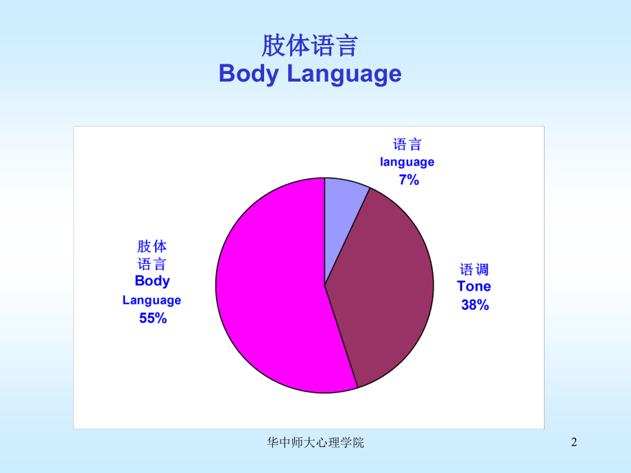 单击以编辑母版标题样式,单击以编辑母版文本样式,第二级,第三级,第四级,第五级,华中师大心理学院,*,肢体语言(PPT),肢体语言,Body Language,2,华中师大心理学院,我们如何理解这些肢体语言?,3,华中师大心理学院,每个在社会上闯久了懂得人际沟通的人,都具有一种特殊的敏锐,也就是从最细微的地方观察对方:他有没有偷偷看手表,,他有没有用手摸脖子后面,,他会不会在坐着的时候抖腿,,他握手时,手上是不是又湿又泠,,他说话时敢不敢看着我的眼睛,,4,华中师大心理学院,1、,肢体语言的定义,。2、,解析肢体语言。,3、,工作中的行为礼仪。,4、,如何领会客户的肢体语言,。,讲座内容,5,华中师大心理学院,人在言行、交际中会自觉或不自觉地加入自己的手势、表情、身体动作和眼神等肢体语言以强调或表达自己的主观意愿,谓之,肢体语言,。,6,华中师大心理学院,我们的肢体有那些语言?,心理学家认为一个有效的沟通者应学会,“,倾听,”,和理解下列非言语行为:(,1,)躯体行为;(,2,)面部表情;(,3,)声音特征;(,4,)手势;(,5,)人际距离;(,6,)个人的总体印象。,下面我们根据已有的一些研究和我们的实践体会,对其中的几个方面分别进行论述。,7,华中师大心理学院,1,、躯体行为:,8,华中师大心理学院,奥巴马与英国外交大臣米利班德坚定地握手,两人的手紧坚握住,并面对镜头露齿而笑。,9,华中师大心理学院,奥巴马在与印度总理辛格握手时,保持了一定的距离。,10,华中师大心理学院,2,、面部表情,头部,眼睛、眉毛,嘴巴,11,华中师大心理学院,头,侧向一旁说明对谈话有兴趣。,头挺得笔直说明对对方的谈话持中立态度。,低头说明对对方的谈话不感兴趣或持否定态度。,点头同意,摇头否定,昂首,骄傲,垂头,沮丧,侧看不服,12,华中师大心理学院,眉目传情、暗送秋波,眉毛一挑,你做的很好,眼睛,眼睛是心灵之窗。人的一切情绪、,态度,和感情的变化,都可以从眼睛理显示出来。,13,华中师大心理学院,嘴和眼一样都有传情达意的作用。在社交活动中,谈话时尽量少努嘴和撇嘴,因为这样的动作容易流露出不屑的意味,而显得不够有涵养。,站立、静坐或握手时,嘴可以微闭,不要露出牙齿,如果能保持微笑就更完美了。,嘴,14,华中师大心理学院,15,华中师大心理学院,16,华中师大心理学院,17,华中师大心理学院,18,华中师大心理学院,19,华中师大心理学院,20,华中师大心理学院,21,华中师大心理学院,22,华中师大心理学院,23,华中师大心理学院,24,华中师大心理学院,9.11,事件、南斯拉夫,25,华中师大心理学院,肢体语言的通性,26,华中师大心理学院,肢体语言的通性,27,华中师大心理学院,用适当的语调和语速,简明扼要地与别人进行交流。声音不要过大,亲切、柔和,面带微笑。尊敬别人,不要打断别人的谈话。,举例:,王熙凤:未见其人,先闻其声,我自己,政客,3,、语音、语调,28,华中师大心理学院,4,、手势,1.,善用你的手势,2.,观察并模仿活跃于政界或商界,充满自信,精力充沛的演说家。,3.,你的手势要大方、丰富以及具有美感。,4.,手势传达的政治含义,29,华中师大心理学院,欢迎韩国总统李明博时,奥巴马与他紧紧拥抱。李明博紧紧抓住奥巴马的肩膀,奥巴马则轻拍李明博的背。,联想到大猩猩,30,华中师大心理学院,亲密空间(约小于,0.45,米):只有感情亲密的人才被允许进入,亲人、情侣,个人空间(约,0.45m-1.2m),:亲切友好,只有相当亲近的人才能进入,亲人、熟人,社交空间:(约,1.2m-36m,),正式社交、外交,近社交空间:(约,1.2m-2.1m,),熟人、陌生人,公开空间,(大于,36m,),演讲,5,、,距离产生美。,距离(沟通空间),31,华中师大心理学院,6,、个人的综合印象,实际上,非言语性行为所传递的信息远不止上面所说的几种情况。,当人处平静止和无声状态时,,不同的站、坐、倚的姿式也会传递一定的信息。,当人站立或坐下时,,与他人之间所具有的距离也可使你发现不同的人,行为各异。因为在同一种文化背景中,人与人之间的距离可以划分出亲密区、个人区、社会区和公共区。,总之,,某人与你所保持的距离可能反映了他对同性(异性)的某种态度,反映了他对你的看法,反映了他本人的教养与社交经验、习惯等内容。,32,华中师大心理学院,头部:眼光平视,不要东张西望。,双手:不要交叉抱于胸前或放入口袋,,可自然垂放,可叠握,置于身前。,双脚:略分,两脚呈“,V”,字型分开,,体重均匀分部于两脚。,身体:挺胸收腹,腰部用力,膝盖要直。,表情:面露自然的微笑。,工作中的礼仪,站姿,33,华中师大心理学院,时刻谨记良好的姿势需注意以下四点:,收肩(要放松)、收腹、提臀、挺胸。,工作中的礼仪,站姿,34,华中师大心理学院,很多人忽略站立的时候,手千万别双手同时放在腰部以下的地方,尤其是拍照的时候,一个字“呆”。,服务员,35,华中师大心理学院,头部:眼光平视,不要东张西望。,手、脚:手放在膝盖上。女士的双手交叉放在,膝盖上。双脚要并拢。避免一些不恰当的腿部动作,如:抖动、敲击地面等。,身体:脊背要挺直,臀部坐在椅子的三分之二处。,表情:面露自然的微笑。,工作中的礼仪,坐姿,36,华中师大心理学院,头部:眼光平视,不要东张西望。,身体:双肩自然下垂,挺胸、收腹但不要过度。,腿、脚:走路时脚尖向前并保持膝盖屈伸自如。步履轻盈,步幅适中。,表情:面露自然的微笑。,工作中的礼仪,走姿,37,华中师大心理学院,当你给别人指示方向