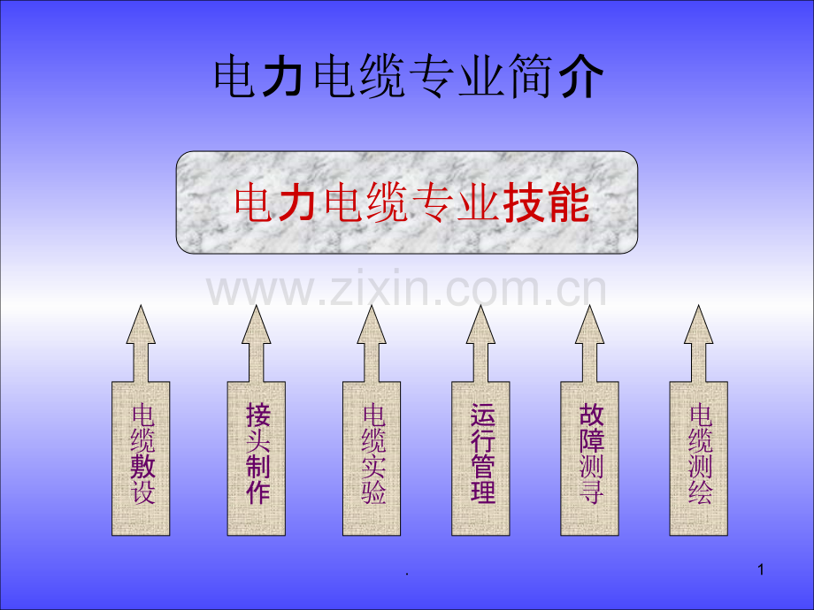 电力电缆专业技能电力电缆专业简介电缆敷设接头制作电缆实验运行管理故障测寻电缆测绘1.电缆的敷设特种特种类电缆专业类电缆专业2 2.授课内容一、电缆的敷设方式及其选用条件和技术 要求二、电缆的敷设方法1、电力电缆的运输与保管2、电力电缆敷设的工器具3、电力电缆敷设技术要求和质量控制3 3.一、电力电缆的敷设方式 及其选用条件和技术 要求4 4.电缆的敷设方式和选用原则 直直 埋埋 敷敷 设设排排 管管 敷敷 设设沟沟 道道 敷敷 设设隧隧 道道 敷敷 设设桥桥架架桥桥梁梁敷敷设设水水 底底 敷敷 设设竖竖 井井 敷敷 设设1 电缆的条数 2 地势3 建筑物的密集程度 4 地上下障碍物的多少5 5.电力电缆敷设方式共同基本要求1、电缆线电缆线路最高与最低点路最高与最低点间间的位差控制要求的位差控制要求电压(千伏)1 3电缆护层结构无 铠 装有 铠 装铠装或无铠装铅包铝包23-2520米28-3025米18-2015米8-105米铠装或无铠装6 1020 35注:注:注:注:1 1、上表主要指油浸、上表主要指油浸、上表主要指油浸、上表主要指油浸纸绝缘电缆纸绝缘电缆纸绝缘电缆纸绝缘电缆敷敷敷敷设设设设最大允最大允最大允最大允许许许许位差。位差。位差。位差。2 2、超、超、超、超过过过过此此此此规规规规定,改定,改定,改定,改选选选选其他其他其他其他电缆电缆电缆电缆如:不滴流浸如:不滴流浸如:不滴流浸如:不滴流浸渍纸绝缘电缆渍纸绝缘电缆渍纸绝缘电缆渍纸绝缘电缆或塑料或塑料或塑料或塑料绝缘电缆绝缘电缆绝缘电缆绝缘电缆。3 3、必要、必要、必要、必要时时时时也可采用堵油中也可采用堵油中也可采用堵油中也可采用堵油中间间间间接接接接头头头头。6 6.2、各种各种电缆线电缆线路最小弯曲半径控制要求路最小弯曲半径控制要求D为电缆外径7 7.3 3、电缆线电缆线路路电缆电缆支撑点控制要求支撑点控制要求 电电电电 缆缆缆缆 支支支支 撑撑撑撑 点点点点 距距距距 离离离离 单单单单位:位:位:位:mmmm8 8.4、防机械防机械损损坏要求坏要求 电缆电缆电缆电缆引引引引进进进进隧道工井建筑物、穿隧道工井建筑物、穿隧道工井建筑物、穿隧道工井建筑物、穿过过过过楼板、楼板、楼板、楼板、墙墙墙墙壁壁壁壁时时时时需穿保需穿保需穿保需穿保护护护护管,其管,其管,其管,其内径内径内径内径为电缆为电缆为电缆为电缆外径的外径的外径的外径的1.51.51.51.5倍。倍。倍。倍。电缆电缆电缆电缆从地下或从地下或从地下或从地下或电缆电缆电缆电缆沟引出至沟引出至沟引出至沟引出至电电电电杆或杆或杆或杆或设备时设备时设备时设备时 ,距地面,距地面,距地面,距地面2 2 2 2米需穿保米需穿保米需穿保米需穿保护护护护管或加保管或加保管或加保管或加保护护护护装置,保装置,保装置,保装置,保护护护护管埋入地面不小于管埋入地面不小于管埋入地面不小于管埋入地面不小于100mm100mm100mm100mm。5、电缆电缆敷敷设设防火要求防火要求 6、电缆电缆敷敷设设出出线线方向要求方向要求 9 9.7 7、机械敷、机械敷设设最大最大牵牵引力控制要求引力控制要求电缆最大允许牵引强度表 牵引方式 牵 引 头 钢丝网套 受力部位 铜芯 铝芯 铜套 铝套 塑料套允许牵拉强度 7 0 4 0 10 40 7单位:N/mm2注:当采用钢丝绳牵引时,高压及超高压电缆总牵引力不宜超过30kN1010.8 8、电缆电缆电缆电缆敷敷敷敷设侧压设侧压设侧压设侧压力控制要求力控制要求力控制要求力控制要求 11、电缆电缆敷敷设设防水、防潮控制要求防水、防潮控制要求 10、电缆电缆敷敷设设防防应应力控制要求力控制要求 9、电缆电缆敷敷设设速度控制要求速度控制要求 1111.1212、机械敷、机械敷设设温度控制要求温度控制要求注:1 外加热 5-10 保温72h,25 保温24-36h。2 电流加热 电缆表面温度不低于5,油浸纸电缆表面温度不高 于 25-45。1212.1313、电缆电缆电缆电缆敷敷敷敷设设设设减小减小减小减小牵牵牵牵引阻力控制要求引阻力控制要求引阻力控制要求引阻力控制要求 15、电缆电缆敷敷设设其他要求其他要求 14、电缆电缆敷敷设联动设联动控制要求控制要求 1313.直埋敷设v应用范围 工期短;投工期短;投工期短;投工期短;投资资资资少;施工工少;施工工少;施工工少;施工工艺简单艺简单艺简单艺简单。易腐。易腐。易腐。易腐蚀蚀蚀蚀;易受外;易受外;易受外;易受外 力破坏。适用于中低力破坏。适用于中低力破坏。适用于中低力破坏。适用于中低压电缆压电缆压电缆压电缆敷敷敷敷设设设设于于于于农农农农田、人行道、田、人行道、田、人行道、田、人行道、绿绿绿绿化化化化 带带带带等地方。等地方。等地方。等地方。1414.1515.v技术要求 1 1 1 1、应选应选应选应选有有有有铠铠铠铠装装装装电缆电缆电缆电缆,注意路径的土壤酸碱度。,注意路径的土壤酸碱度。,注意路径的土壤酸碱度。,注意路径的土壤酸碱度。2 2 2 2、电缆电缆电缆电缆直埋的深度由地面直直埋的深度由地面直直埋的深度由地面直直埋的深度由地面直电缆电缆电缆电缆外皮,外皮,外皮,外皮,10kV10kV10kV10kV及以下及以下及以下及以下0.70.70.70.7米、米、米、米、35kV35kV35kV35kV1 1 1 1米;米;米;米;电缆电缆电缆电缆引入建筑物或与障碍物交叉引入建筑物或与障碍物交叉引入建筑物或与障碍物交叉引入建