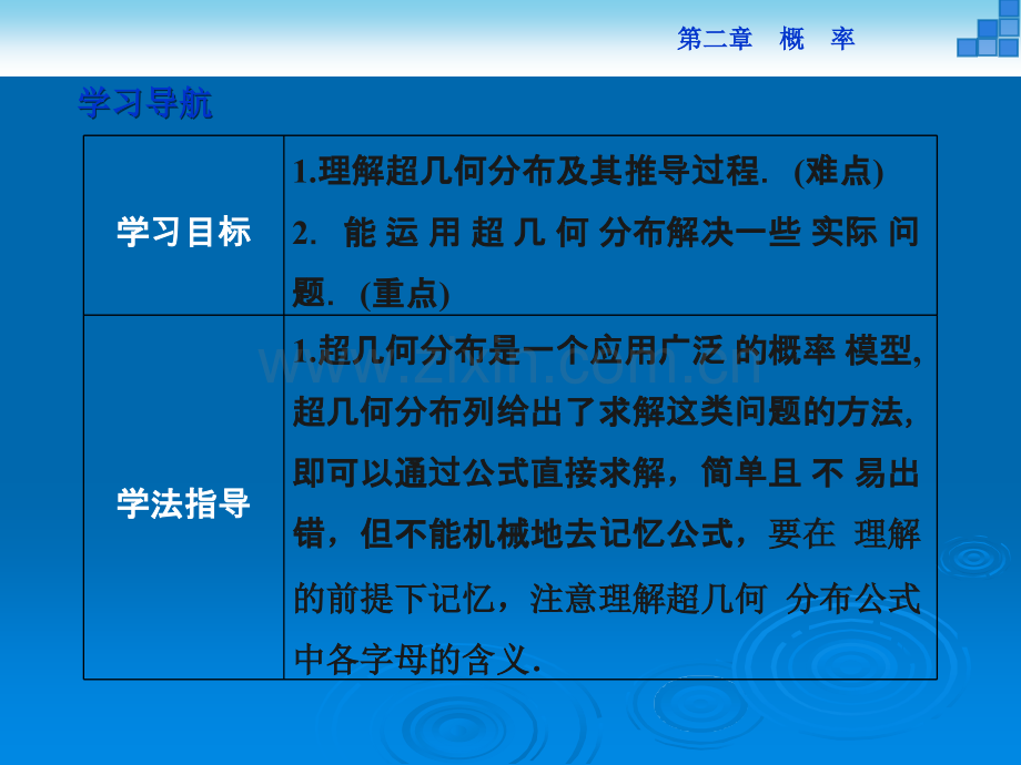 2超几何分布超几何分布第二章概率第二章概率学习导航学习导航学习导航学习导航第二章概率第二章概率学学习习目目标标1.理解超几何分布及其推理解超几何分布及其推导过导过程程(难难点点)2能能 运运 用用 超超 几几 何何 分分布解决布解决一些一些 实际实际 问问题题(重点重点)学法指学法指导导1.超几何分布是超几何分布是一个一个应应用广用广泛泛 的的概概率率 模型模型,超超几何分布列几何分布列给给出了求解出了求解这类问题这类问题的方的方法法,即即可以通可以通过过公式直接求解公式直接求解,简单简单且且 不不 易易出出错错,但不能机械地去但不能机械地去记忆记忆公式公式,要,要在在 理解理解的前提下记忆,注意理的前提下记忆,注意理解超解超几几何何 分分布公式布公式中各字母的含义中各字母的含义第二章概率第二章概率学法指学法指导导2许许多不放回抽多不放回抽样样的的实实际问际问题题,可可 以以 通通 过过化化归为归为超几何分布超几何分布,并运用它并运用它简简捷捷求求 解解凡凡类类似于似于“在含有在含有次次 品品 的的产产 品中品中取部分取部分产产品品,问问所取出的所取出的产产品中次品件数品中次品件数”的的问问 题题,都属都属于超几何分布的模型于超几何分布的模型.超几何分布超几何分布AC超几何分布列超几何分布列 某校高三年某校高三年某校高三年某校高三年级级级级某班的数学某班的数学某班的数学某班的数学课课课课外活外活外活外活动动动动小小小小组组组组中有中有中有中有6 6名男生名男生名男生名男生,4 4名女生,从中名女生,从中名女生,从中名女生,从中选选选选出出出出4 4人参加数学人参加数学人参加数学人参加数学竞赛竞赛竞赛竞赛考考考考试试试试,用,用,用,用X X表示其表示其表示其表示其 中的中的中的中的男生人数求男生人数求男生人数求男生人数求X X的分布列的分布列的分布列的分布列(链链链链接教材接教材接教材接教材P P3939例例例例1)1)方法方法方法方法归纳归纳归纳归纳解答此解答此解答此解答此类题类题类题类题目的关目的关目的关目的关键键键键在于先分析随机在于先分析随机在于先分析随机在于先分析随机变变变变量是否量是否量是否量是否满满满满 足超足超足超足超 几何分几何分几何分几何分布布布布,如果如果如果如果满满满满足超几何分布的条件足超几何分布的条件足超几何分布的条件足超几何分布的条件,则直接利用超几何分布概率公则直接利用超几何分布概率公则直接利用超几何分布概率公则直接利用超几何分布概率公式来解式来解式来解式来解当然当然当然当然,本例也可通本例也可通本例也可通本例也可通过过过过古典概型解决古典概型解决古典概型解决古典概型解决,但利用超几何分布但利用超几何分布但利用超几何分布但利用超几何分布概率公式概率公式概率公式概率公式简简简简化了化了化了化了对题对题对题对题目的具体分析目的具体分析目的具体分析目的具体分析,因此要因此要因此要因此要简单简单简单简单一些一些一些一些利用超几何分布模型求相利用超几何分布模型求相应应事件的概率事件的概率 在一个口袋中有在一个口袋中有在一个口袋中有在一个口袋中有3030个球个球个球个球,其中其中其中其中红红红红球球球球1010个个个个,其余其余其余其余为为为为白球,白球,白球,白球,这这这这些球除些球除些球除些球除颜颜颜颜色不同外完全相同游色不同外完全相同游色不同外完全相同游色不同外完全相同游戏戏戏戏者一次从中摸出者一次从中摸出者一次从中摸出者一次从中摸出5 5个球,个球,个球,个球,摸到摸到摸到摸到4 4个个个个红红红红球就中一等球就中一等球就中一等球就中一等奖奖奖奖,那么,那么,那么,那么获获获获一等一等一等一等奖奖奖奖的概率有多大?的概率有多大?的概率有多大?的概率有多大?(链链链链接教材接教材接教材接教材P P4040例例例例2)2)超几何分布的超几何分布的综综合合问题问题(链链链链接教材接教材接教材接教材P P4242习题习题习题习题2 22 T2 T2 2)方法方法方法方法归纳归纳归纳归纳解决本解决本解决本解决本题时应题时应题时应题时应注意以下几点:注意以下几点:注意以下几点:注意以下几点:(1)(1)通通通通过过过过古典概型概率公式列出方程求出甲班学古典概型概率公式列出方程求出甲班学古典概型概率公式列出方程求出甲班学古典概型概率公式列出方程求出甲班学 生数是整个生数是整个生数是整个生数是整个题题题题目的关目的关目的关目的关键键键键点点点点,体体体体现现现现了方程思想与概率知了方程思想与概率知了方程思想与概率知了方程思想与概率知识识识识的的的的结结结结合;合;合;合;(2)(2)分析分析分析分析题题题题意意意意,得出得出得出得出X X服从超几何分服从超几何分服从超几何分服从超几何分 布是第二布是第二布是第二布是第二 问问问问的的的的 切入点切入点切入点切入点,比比比比利用古典概型求解要利用古典概型求解要利用古典概型求解要利用古典概型求解要简单简单简单简单一些;一些;一些;一些;(3)(3)概率知概率知概率知概率知识识识识与其他知与其他知与其他知与其他知识识识识的的的的结
