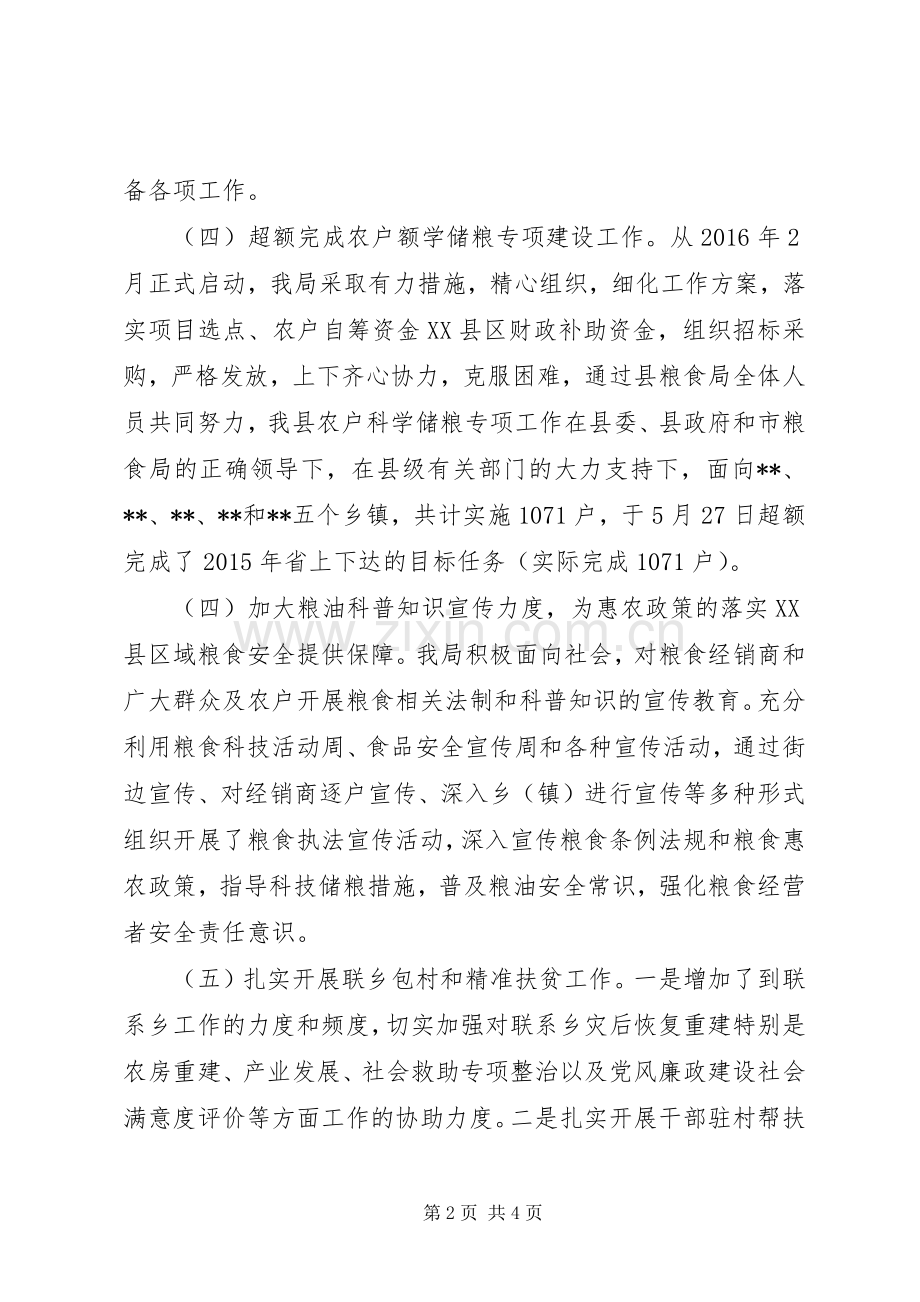 (四)超额完成农户额学储粮专项建设工作。从2016年2月正式启动,我局采取有力措施,精心组织,细化工作方案,落实项目选点、农户自筹资金XX县区财政补助资金,组织招标采购,严格发放,上下齐心协力,克服困难,通过县粮食局全体人员共同努力,我县农户科学储粮专项工作在县委、县政府和市粮食局的正确领导下,在县级有关部门的大力支持下,面向**、**、**、**和**五个乡镇,共计实施1071户,于5月27日超额完成了2015年省上下达的目标任务(实际完成1071户)。