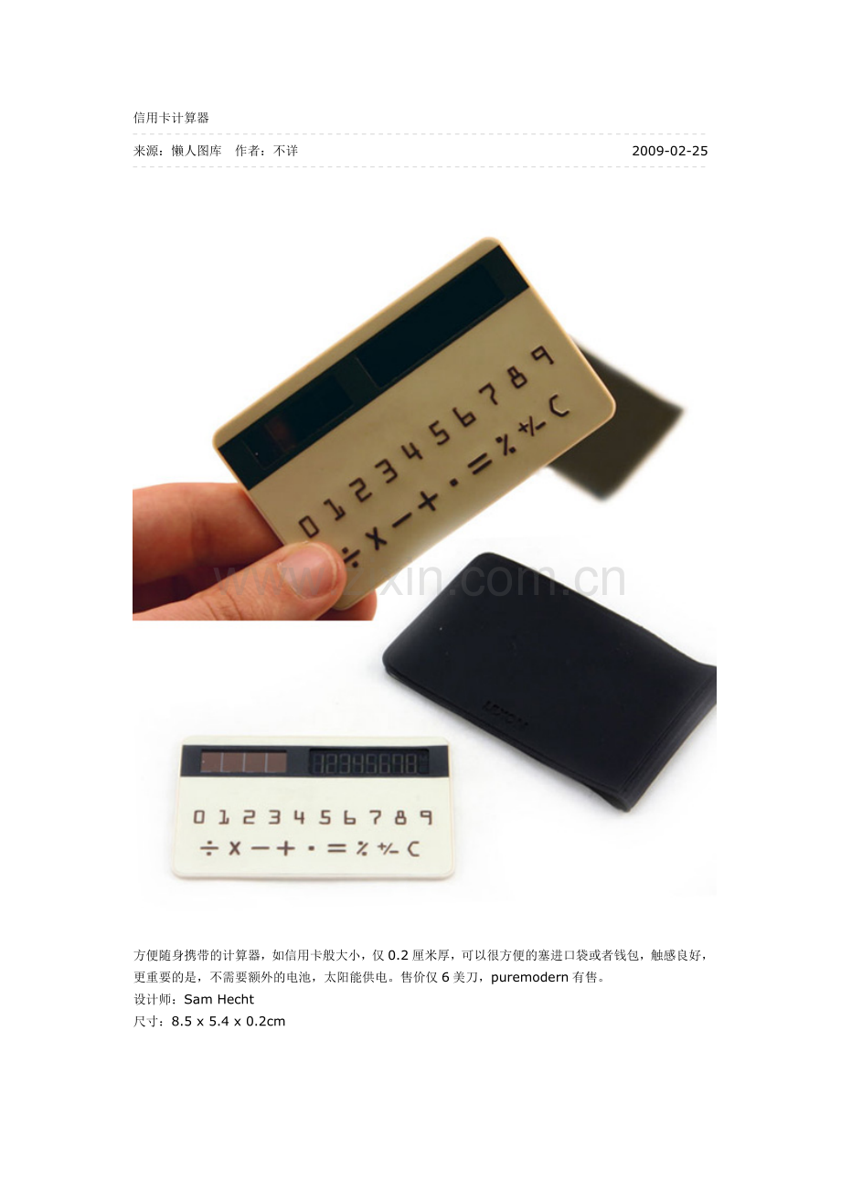 信用卡计算器 来源:懒人图库 作者:不详  2009-02-25 方便随身携带的计算器,如信用卡般大小,仅0.2厘米厚,可以很方便的塞进口袋或者钱包,触感良好,更重要的是,不需要额外的电池,太阳能供电。售价仅6美刀,puremodern有售。 设计师:Sam Hecht 尺寸:8.5 x 5.4 x 0.2cm