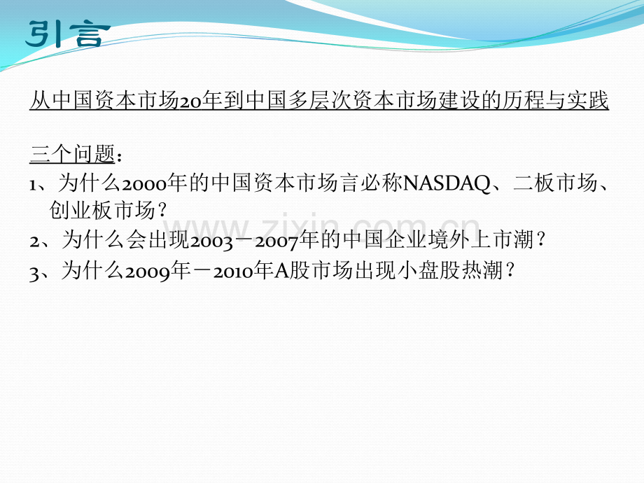 多层次资本市场体系与制度安排多层次资本市场体系与制度安排兼谈海外资本市场经验兼谈海外资本市场经验与教训与教训引言从中国资本市场20年到中国多层次资本市场建设的历程与实践三个问题:1、为什么2000年的中国资本市场言必称NASDAQ、二板市场、创业板市场?2、为什么会出现20032007年的中国企业境外上市潮?3、为什么2009年2010年A股市场出现小盘股热潮?2000年的中国股市创业板梦想p科网泡沫p香港交易所创业板的成立(1999年11月)p双高认证p“高新企业板”、“二板”还是“创业板”?20032007年的中国企业境外上市潮p境外上市的企业数量p都去了哪些市场?p什么特点?p过度包装(有人说对A股市场是好事)2003-20072003-2007年年中国企业境外上市数量中国企业境外上市数量p 2003-2007 2003-2007年是中国企业境外上市的高潮时期年是中国企业境外上市的高潮时期p 截至截至20072007年年3 3月月1010日共日共747747家中国企业在境外上市家中国企业在境外上市年份年份数量数量2003482004842005812006862007124合计合计423中国企业境外上市的地区分布中国企业境外上市的地区分布资本市场2006年2005年筹资额(US$M)IPO数量筹资额(US$M)IPO数量NASDAQ527.076718.847纽约证券交易所480.553395.701香港主板41,284.143919,012.7237香港创业板227.49674.748新加坡主板1,336.7924201.8320新加坡创业板11.55223.946东京证券交易所0.0000.000AIM130.42662.092合计43,997.998620,490.3281中国企业境外上市的行业分布中国企业境外上市的行业分布2009年2010年的A股市场小盘股热潮p金融危机后,中小板、创业板的扩张p小盘股:泡沫还是好故事?小盘股:泡沫还是好故事?小盘股:泡沫还是好故事?主要内容一、多层次资本市场概况二、我国多层次市场建设的背景与过程三、我国多层次市场的制度设计特点四、我国多层次市场运行情况及若干热点问题分析五、我国多层次市场的未来展望六、学习、实践与思考七、思考题和参考书目一、多层次资本市场概况多层次资本市场概括p什么是多层次资本市场p各国多层次市场基本情况 美国 日本 欧洲 韩国 香港 台湾美国资本市场体系美国全国性集中交易市场区域性集中交易市场全国性场外交易市场纽约证券交易所(NYSE)纳斯达克(NASDAQ)太平洋、中西部、辛辛那提、费城、波士顿交易所等柜台交易市场(OTCBB)粉单交易市场(Pink Sheets)纳斯达克全球精选市场纳斯达克全球市场纳斯达克资本市场英国资本市场体系英国全国性集中交易市场区域性集中交易市场全国性场外交易市场伦敦证券交易所伯明翰、曼彻斯特、利物浦、格拉斯哥、都柏林交易所等Off Exchange(OFEX)主板AIM韩国资本市场体系韩国主板市场 二板市场 第三市场韩国证券交易所科斯达克(KOSDAQ)KOTCBB香港资本市场体系香港香港联合交易所场外交易市场主板创业板(GEM)台湾资本市场体系台湾集中市场 柜台市场 盘商市场台湾证券交易所兴柜市场 几点启示p经济规模和经济发展阶段是基础p发审和上市制度适合高新技术企业的特点p有效的监管是关键p不能过早转板p行业的多元化2006年年1月试点月试点2009年年9月月30日日创业板首批创业板首批28家企业上市家企业上市2004年年5月月17日设立日设立打造深市蓝筹股市场打造深市蓝筹股市场中小企业中小企业“隐形冠军隐形冠军”的摇篮的摇篮创业创新的创业创新的“助推器助推器”上市资源上市资源“孵化器孵化器”与与“蓄水池蓄水池”主板市场主板市场 中小板市场中小板市场创业板市场创业板市场股份报价转让系统股份报价转让系统1990年年12月月1日设立日设立中国的多层次资本市场体系深交所的多层次市场体系二、我国多层次市场建设的背景与过程市场历程p主板:深圳证券交易所(1990年10月)上海证券交易所(1990年12月)p中小板:2004年5月p创业板:2009年9月p场外市场:从NET、STAQ到委托代办转让系统再到?为什么会形成这一具有中国特色的路径选择?创业板的背景与过程为什么要建为什么要建设创业板?设创业板?创业板建设创业板建设的时机是否的时机是否成熟?成熟?创业板建设创业板建设的过程怎样的过程怎样?纳斯达克的示范效应p美国软件行业上市公司中的93.6%、半导体行业上市公司中的84.8%、计算机及外围设备行业上市公司中的84.5%、通讯服务业上市公司中的82.6%、通讯设备行业上市公司中的81.7%都在纳斯达克上市p出现了微软、英特尔、Google、甲骨文、苹果电脑、戴尔等美国高科技的支柱企业p带动了全社会的创业投资和创业精神 为什么要建设创业板海外创业板的基本情况p截止2008年底,全球共有47家创业板市场在运行,分布于五大洲三十余个国家(地区),上市公司总数约9000家,总市值约2万亿美元 p全球GDP排名前10名的国家和地区,除了中国以外都设立了创业板市场 pGDP排名前20名的国家和地区中,仅有中国和墨西哥没有设立创业板市场为什么要建设创业板?海外创业板的发展态势p前赴后继,日益壮大2002年底共有44家,到2008年底,被关闭或合并的有12家,占27,同期新设15家p逐步摆脱低端市场的形象2004年,Jasdaq成为交易所市场2005年,Kosdaq成为统一的韩国交易所一部分2006年,纳斯达克升格为交易所p瞄准中国为什么要建设创业板?来自海外的尴尬:海外交易所尽揽中国新兴企业精华海外市场海外市场中国企业家数中国企业家数行业特点行业特点代表性企业代表性企业NasdaqNasdaq52家互联网、软件、通