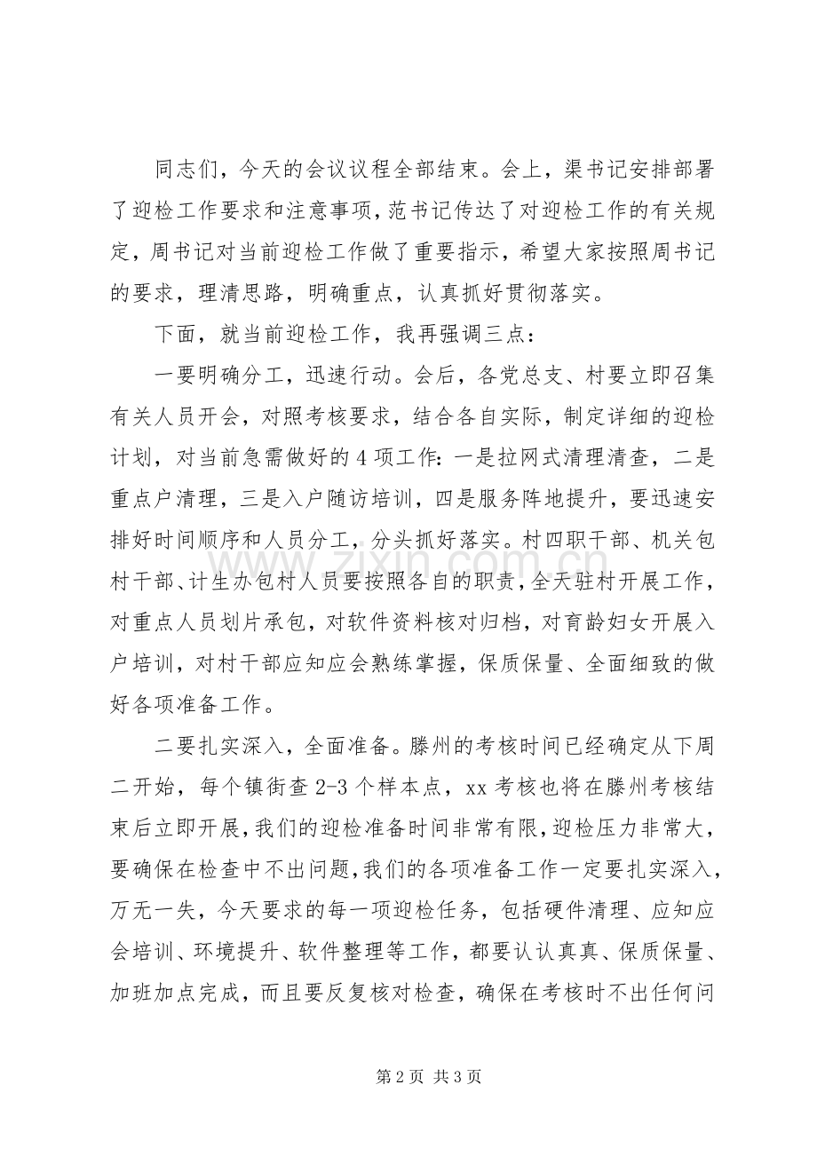 同志们,当前计划生育考核迎检工作时间紧迫,任务艰巨,全镇上下务必要统一思想,高度重视,突出重点,攻坚克难,扎实做好各项准备工作,确保考核万无一失,力争取得最好成绩,为全镇经济社会发展做出新的更大贡献。