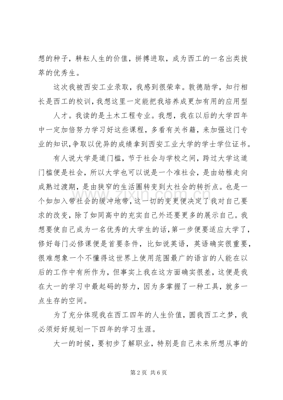 人才。我读的是土木工程专业。我想,我在以后的大学四年中一定加倍努力学习好这些课程,多看有关书籍,来加强这门专业的知识,争取以优异的成绩拿到西安工业大学的学士学位证书。