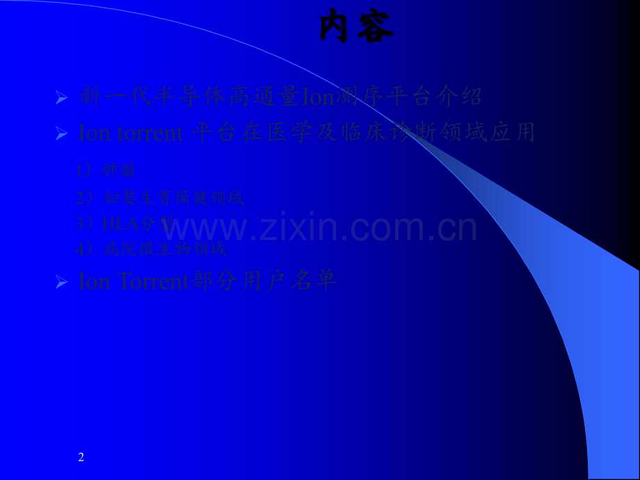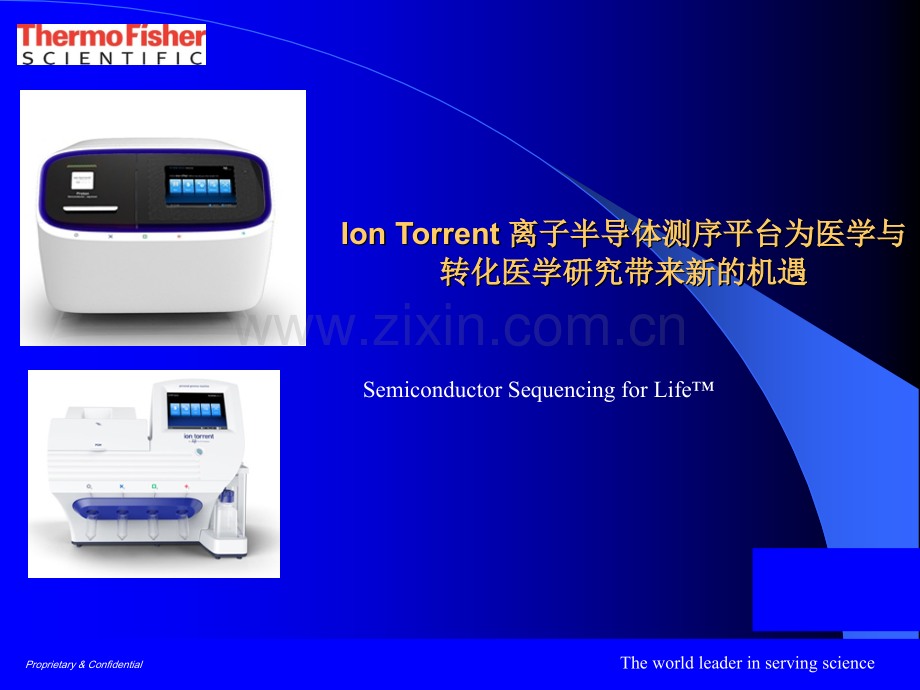TheworldleaderinservingscienceProprietary&ConfidentialSemiconductorSequencingforLifeIon Torrent Ion Torrent 离子半导体测序平台为医学与离子半导体测序平台为医学与离子半导体测序平台为医学与离子半导体测序平台为医学与转化医学研究带来新的机遇转化医学研究带来新的机遇转化医学研究带来新的机遇转化医学研究带来新的机遇新一代半导体高通量Ion测序平台介绍Iontorrent平台在医学及临床诊断领域应用1)肿瘤2)妇婴生育保健领域3)HLA分型4)病院微生物领域IonTorrent部分用户名单内容内容23新一代半导体高通量新一代半导体高通量新一代半导体高通量新一代半导体高通量IonIon测序平台介绍测序平台介绍测序平台介绍测序平台介绍Ion Semiconductor Sequencing:Ion Semiconductor Sequencing:Scalability,Simplicity,Speed,Benchtop Sequencing for All Scalability,Simplicity,Speed,Benchtop Sequencing for All PGM for Genes.Proton for Genomes.Sequencing for All.2011 Q12012 Q3IonPGMTMSequencerIonProtonTMSequencerIon Ion 测序技术平台测序技术平台测序技术平台测序技术平台First First Post Light Post Light sequencing technology sequencing technology Founded2007byJonathan RothbergPioneerednextgenesequencingFounded 454,CuraGen,RaindancePartofLifeTechnologieswithofficesinConnecticut,Massachusetts,andCaliforniaGlobalmanufacturingsitesAnnouncein2010AGBTLaunchedDecember 2010快速完成检测快速完成检测快速完成检测快速完成检测PGMChips:l314Chip:1.2Mwellsl316Chip:6.1Mwellsl318Chip:11MwellsRothberg J.M.et al Nature doi:10.1038/nature10242 SensorPlateSiliconSubstrateDrainSourceBulkdNTPpHQVSensingLayerH+64种dNTP依次流过Ion芯片DNA聚合反应产生的氢离子的直接检测每个碱基的检测只需要几秒扩展性高CMOS(互补金属氧化物半导体)技术40年的摩尔定律简单天然dNTP无激光光源非光学检测无拍照系统非荧光检测非酶级联放大检测速度快快速完成测序反应7芯片就是测序仪芯片就是测序仪芯片就是测序仪芯片就是测序仪Small GenomeTranscriptome100M1G10GSequenceOutputperRun100GExomeSmall to Large Gene Panels10MUnprecedented Scalability Unprecedented Scalability 10,000-Fold From Ion 314 to Ion PIII Chip10,000-Fold From Ion 314 to Ion PIII ChipIon 316Ion 314Ion 318Ion PIIHuman GenomeIon PI Ion PIIIFrom 1.2 Million Sensors to 1.2 Billion SensorsThe content provided herein may relate to products that have not been officially released and is subject to change without notice10Ion技术平台在各研究领域应用技术平台在各研究领域应用病源微生物领域:病源微生物领域:v 细菌、病毒等denovo全基因组测序v菌群宏基因组测序(16SrRNA)v耐药菌株筛选妇婴生育保健领域:妇婴生育保健领域:v新生儿遗传病筛查v无创产前诊断v胚胎移植前染色体/遗传病检测(试管婴儿)v线粒体DNA突变筛查肿瘤领域:早期诊断、个性化治疗、预后监督肿瘤领域:早期诊断、个性化治疗、预后监督Ion 测序平台应用于临床诊断及医学研究测序平台应用于临床诊断及医学研究HLA分型:分型:器官移植、个性化药物治疗1.Ion Ampliseq技术应用于肿瘤诊断及个性化治疗技术应用于肿瘤诊断及个性化治疗Ion Ampliseq技术技术v多重多重PCR靶向捕获技术靶向捕获技术,在一个反应管内可同时进行几千重甚至上万重PCRv起始DNA量最低仅需10ng,适合FFPE标本及其他微量标本v适合降解样本降解样本,采用150bp引物扩增设计vReadsontarget效率高(96%以上),覆盖均一性好+Construct LibraryPrepare TemplateRun SequenceAnalyze DataIon Ampliseq Panels-固定或定制试剂盒固定或定制试剂盒v DNA-基因突变筛查基因突变筛查:Cancer Hotspot Panel v2:50个肿瘤相关基因,个肿瘤相关基因,207个扩增子个扩增子 Comprehensive Cancer Panel:409个肿瘤相关基因,个肿瘤相关基因,16000个扩增子个扩增子 Ion Ampliseq Exome:全外显子组:全外显子组 Custom Panels:定制客户感兴趣的肿瘤基因:定制客户感兴趣的肿瘤基因 Community Panels:结肠癌:结肠癌/肺癌、乳腺癌肺癌、乳腺癌/卵巢癌,白血病,心血管病等卵巢癌,白血病,心血管病等v RNA-基因表达量筛查:基因表达量筛查:RNA Cancer Panel:50个肿瘤相关基因个肿瘤相关基因 RNA Apoptosis Panel:267个凋亡相关基因个凋亡相关基因 Custom RNA Panels:定制客户感兴趣的肿瘤基因:定制客户感兴趣的肿瘤基因(1 1 1 1)肿瘤热点突变试剂盒)肿瘤热点突变试剂盒)肿瘤热点突变试剂盒)肿瘤热点突变试剂盒:Ion AmpliSeq Cancer Hotspot Panel Ion AmpliSeq Cancer Hotspot Panel v2v250 个肿瘤基因,个肿瘤基因,207 扩增子,扩增子,2855 个热点突变(个热点突变(COSMIC数据库)数据库),一天完成检测一天完成检测KRASBRAFEGFRTP53PIK3CACSF1RJAK2NRASPTPN11ERBB2SRCFGFR3NPM1CDKN2ARETHNF1ASMAD4GNASPDGFRAMPLABL1PTENFLT3STK11SMARCB1KITMETNOTCH1FGFR2RB1JAK3VHLKDRSMOEZH2HRASAKT1ALKMLH1FBXW7ERBB4GNA11,GNAQATMCDH1IDH1CTNNB1APCFGFR1IDH2 晚晚期直肠癌患者的石蜡切片样本期直肠癌患者的石蜡切片样本,在,在配套服务器上分析时间约配套服务器上分析时间约10分分钟钟 PGM检测到的突变,经毛细管电泳测序验证,结果一致检测到的突变,经毛细管电泳测序验证,结果一致 黄黄色标注的是在色标注的是在COSMIC Database里找到的和肿瘤相关的突变信里找到的和肿瘤相关的突变信息:息:KRAS:直:直肠肠癌常见突癌常见突变,如果患变,如果患者发生此突变一般需要进行放射性化疗,单者发生此突变一般需要进行放射性化疗,单抗药抗药物治疗效果不佳;物治疗效果不佳;TP53:此突变预:此突变预示该患者的预后效果会较示该患者的预后效果会较差;差;APC:此高:此高频突变频突变常出常出现现在晚期癌症