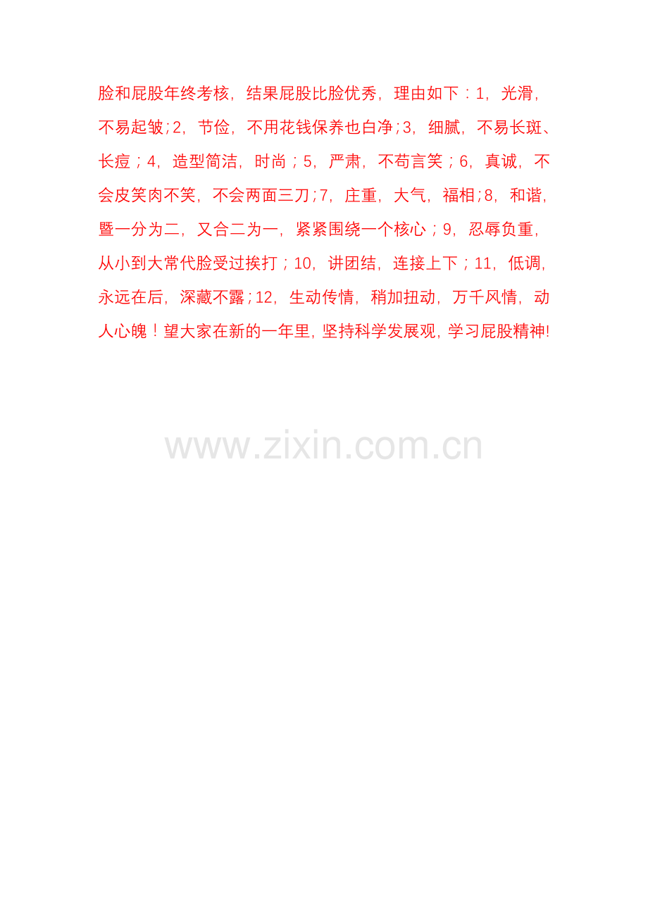 脸和屁股年终考核,结果屁股比脸优秀,理由如下:1,光滑,不易起皱;2,节俭,不用花钱保养也白净;3,细腻,不易长斑、长痘;4,造型简洁,时尚;5,严肃,不苟言笑;6,真诚,不会皮笑肉不笑,不会两面三刀;7,庄重,大气,福相;8,和谐,暨一分为二,又合二为一,紧紧围绕一个核心;9,忍辱负重,从小到大常代脸受过挨打;10,讲团结,连接上下;11,低调,永远在后,深藏不露;12,生动传情,稍加扭动,万千风情,动人心魄!望大家在新的一年里,坚持科学发展观,学习屁股精神!
