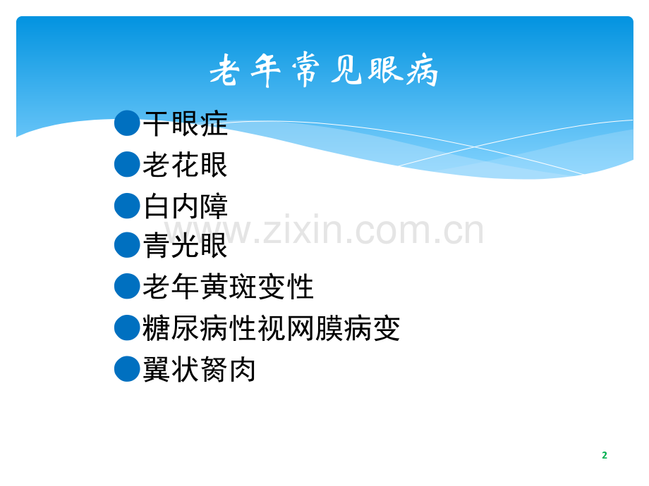 老年常见眼病基层医疗现状老年常见眼病基层医疗现状及发展前景及发展前景延庆区医院(北医三院延庆医院)延庆区医院(北医三院延庆医院)延庆区医院(北医三院延庆医院)延庆区医院(北医三院延庆医院)眼科眼科眼科眼科 杨海燕杨海燕杨海燕杨海燕2老年常见眼病干眼症老花眼白内障青光眼老年黄斑变性翼状胬肉糖尿病性视网膜病变32017年门诊就诊量:约门诊就诊量:约5400054000余人次余人次6060岁以上老年人约占岁以上老年人约占60%60%约约3240032400人次人次门诊老年常见病门诊老年常见病约占老年病人约占老年病人(%)约(人次)约(人次)干眼症(自诉)大于80%25920老花眼(自诉)1-2%400-500白内障(视力下降)大于80%25920青光眼(有症状或可疑性)大于1%350老年性黄斑病变小于1%300糖尿病性视网膜病变大于2%650翼状胬肉大于1%3204疾病疾病入院病人数入院病人数老年人占(老年人占(%)约(人次)约(人次)白内障550 90%495 (ECCE+IOL 80人)100%80 (PHACO+IOL 470人)88%415青光眼3096%28翼状胬肉7092%65眼底病2755%15眼科入院量:眼科入院量:700700余人次余人次6060岁以上老年人约占岁以上老年人约占85%85%约约600600人次人次2017年5一、干眼症干眼症干眼症是指任何原因造成的泪液质或量异常或动力学异常,导致泪膜稳定性下降,并伴有眼部不适和(或)眼表组织病变特征的多种疾病的总称。又称角又称角结膜干燥症结膜干燥症。6临床临床分类:分类:泪液生成不足型泪液生成不足型蒸发过强型蒸发过强型分类病因分类:病因分类:水样液缺乏性干眼症水样液缺乏性干眼症黏蛋白缺乏性干眼症黏蛋白缺乏性干眼症脂质缺乏性干眼症脂质缺乏性干眼症泪液流体动力学异常所致干眼症泪液流体动力学异常所致干眼症7老年人主要病因8检查方法泪液基础分泌、泪泪液基础分泌、泪膜稳定性、角膜点膜稳定性、角膜点状染色、泪液渗透状染色、泪液渗透压、乳铁蛋白检测压、乳铁蛋白检测等等正常正常10-15mm10-15mm,10mm10mm低分泌,低分泌,5mm5mm为干眼症,为干眼症,5min5min。泪膜破裂时间(泪膜破裂时间(BUTBUT):):10s10s为泪膜不稳定。为泪膜不稳定。9治疗睑板腺功能异常蒸发过强102017干眼症门诊诊疗现状干眼症干眼症占老年患者占老年患者(%)约(人次)约(人次)治疗治疗干眼症状(自诉)80%2592098%,人工泪液(玻璃酸钠、聚乙烯醇)明确诊断约(自诉患者)60%15552病因治疗+人工泪液门诊就诊量:约门诊就诊量:约5400054000余人次余人次6060岁以上老年人约占岁以上老年人约占60%60%约约3240032400人次人次11 二.老花眼(老视)看近处久时疲劳感重看近处细小的东西模糊不影响看远视力12发病机制年龄增加造成晶体调节年龄增加造成晶体调节力下降力下降100%100%的人都会花眼的人都会花眼-近视眼也不例外近视眼也不例外!13配镜是最好治疗手段普通老花镜普通老花镜双光老花镜双光老花镜医学验光三个标准:医学验光三个标准:看得清楚;看得舒看得清楚;看得舒 服;看得持久。服;看得持久。我们眼科现有视光我们眼科现有视光中心中心需要特别提醒老年人,需要特别提醒老年人,对镜片的要求不仅是对镜片的要求不仅是能看见,还要保护我能看见,还要保护我们的眼睛尤其是黄斑。们的眼睛尤其是黄斑。142017老花眼门诊诊疗现状老花眼老花眼占老年患者(占老年患者(%)约(人次)约(人次)大于60岁患者几乎100%32400因病就诊1-2%400-500门诊就诊量:约门诊就诊量:约5400054000余人次余人次6060岁以上老年人约占岁以上老年人约占60%60%约约3240032400人次人次分析原因分析原因:1:1、患者自行买眼镜或者眼镜店配镜、患者自行买眼镜或者眼镜店配镜 2 2、本地老年人文化程度较低,对近距离阅读、本地老年人文化程度较低,对近距离阅读 需求较少。需求较少。15三、白内障三、白内障 白内障白内障是由于晶状体混浊引起视力下降的一类常见的眼部疾病。白内障虽然可以致盲,但是通过手术治疗是可以复明的。16核性分类及临床表现1、视物模糊 2、视物重影3、眼前有影子 4、光线越强视力越差5、有近视度数的变化囊下型172017白内障诊疗现状门诊就诊量:约门诊就诊量:约5400054000余人次余人次6060岁以上老年人约占岁以上老年人约占60%60%约约3240032400人次人次白内障白内障占老年患者占老年患者(%)约(人次)约(人次)视力低于视力低于0.30.3(人次)(人次)治疗治疗门诊诊断白内障80%25920约2000早期保守;未成熟期、成熟期、后囊下型、核性部分保守、部分选择手术手术(手术(550550例)例)90%90%(入院)(入院)495495占白内障手术需求的(占白内障手术需求的(24.5%24.5%)ECCE+IOL 80例100%80成熟期(残联扶贫患者)PHACO+IOL 470例88%415三院专家18四、青光眼是一组以特征性是一组以特征性视神经萎缩视神经萎缩和和视野缺损视野缺损为共同特征为共同特征的的疾病,疾病,病理性眼压增高病理性眼压增高为其主要危险因素。为其主要危险因素。同时原发性青光眼还是眼科最重要的同时原发性青光眼还是眼科最重要的心身疾病心身疾病。眼压:眼球内容物作用于眼球内壁的压力。眼压:眼球内容物作用于眼球内壁的压力。正常范围正常范围1 1 1 11-21mmHg1-21mmHg1-21mmHg1-21mmHg24h24h24h24h内眼压的变化内眼压的变化内眼压的变化内眼压的变化 mmHgmmHgmmHgmmHg双眼的差值双眼的差值双眼的差值双眼的差值 mmHgmmHgmmHgmmHg19老年人常见青光眼种类:老年人常见青光眼种类:闭角型青光眼 原发性原发性:开角型角