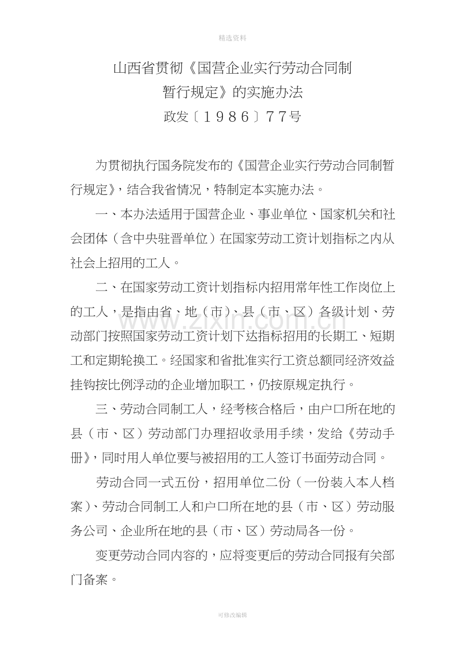 山西省贯彻《国营企业实行劳动合同制