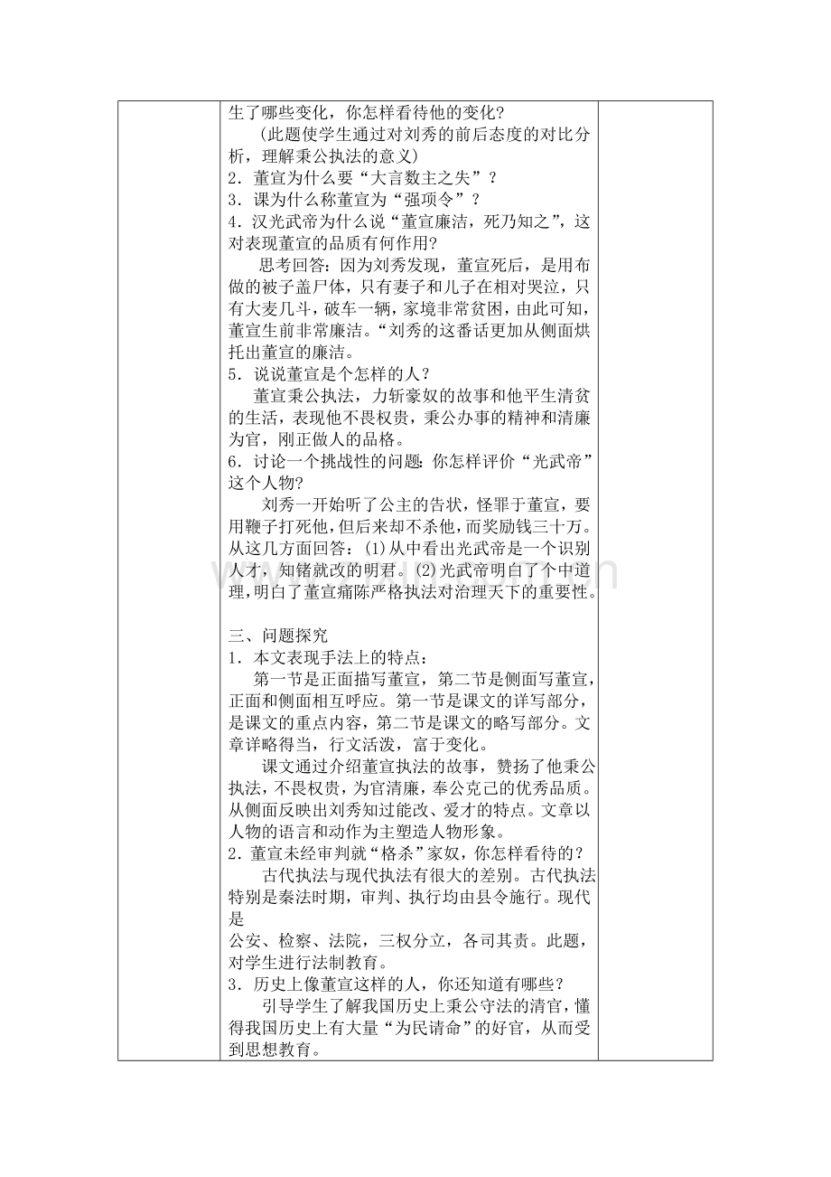 课文通过介绍董宣执法的故事,赞扬了他秉公执法,不畏权贵,为官清廉,奉公克己的优秀品质。从侧面反映出刘秀知过能改、爱才的特点。文章以人物的语言和动作为主塑造人物形象。