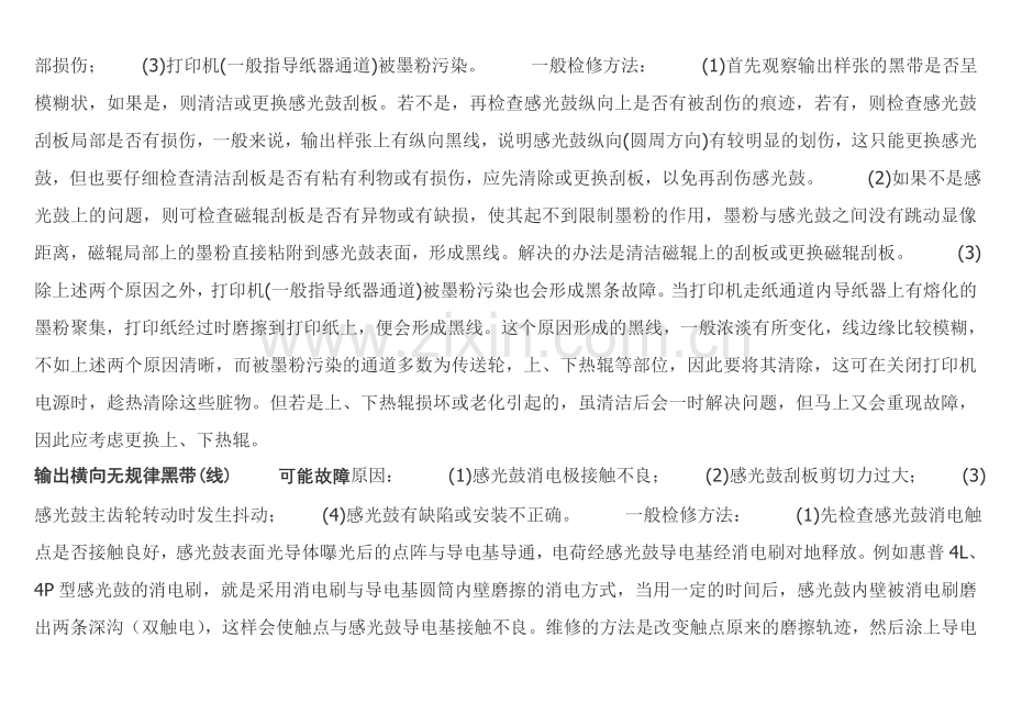 输出横向无规律黑带(线) 可能故障原因: (1)感光鼓消电极接触不良; (2)感光鼓刮板剪切力过大; (3)感光鼓主齿轮转动时发生抖动; (4)感光鼓有缺陷或安装不正确。 一般检修方法: (1)先检查感光鼓消电触点是否接触良好,感光鼓表面光导体曝光后的点阵与导电基导通,电荷经感光鼓导电基经消电刷对地释放。例如惠普4L、4P型感光鼓的消电刷,就是采用消电刷与导电基圆筒内壁磨擦的消电方式,当用一定的时间后,感光鼓内壁被消电刷磨出两条深沟(双触电),这样会使触点与感光鼓导电基接触不良。维修的方法是改变触点原来的磨擦轨迹,然后涂上导电润滑脂增加导电率即可。 (2)再检查感光鼓刮板是否润滑(是否剪切力过大)。清洁刮板与感光鼓之间有一个剪切角,对感光鼓的剪切力很大。为了使感光鼓与刮板之间有良好的清洁能力,并且还需有良好的润滑而不损伤感光鼓,在刮板刃部涂有一层润滑粉。当使用日久润滑粉摩擦消失或清洁时将润滑粉擦掉,则刮板对感光鼓就会形成很大剪切阻力,使感光鼓运转不畅,产生抖动现象(这一般多发生在再生硒鼓上),就会使感光鼓动转不畅,出现故障。因此要特别注意,在清洁或更换感光鼓时不能把刮板上润滑粉去掉。要消除这个故障,只有更换刮板。 (3)打印机中有很多传动齿轮,当打印机使用一定时间后,往往会出现传动齿轮之间无润滑,磨损过度的问题,使齿轮间咬合间隙过大,引起传动不稳产生抖动现象,这也是造成横向黑线故障的一个重要原因。这时要先调整感光鼓啮合的主传动齿轮等,在齿轮上可适当加些润滑膏或润滑油,若磨损较厉害,无法调整,则应更换打印机与感光鼓啮合的主传动齿轮,才能消除故障。 (4)出现横向黑线条的还有一个原因是感光鼓有缺陷或安装不正确。当感光鼓有缺陷时,打印页面上出现的横向黑线条或污迹多是具有规律性的,这时可取出硒鼓仔细检查,若感光鼓确有问题,应更换感光鼓。若感光鼓没有问题,则可能是由于感光鼓安装不正确所造成的,当感光鼓安装不正确时,会导致其与打印纸的接触不正常,出现打印不均和黑条等现象。这时,应打开打印机盒盖,取出感光鼓,进行重新正确的安装。
