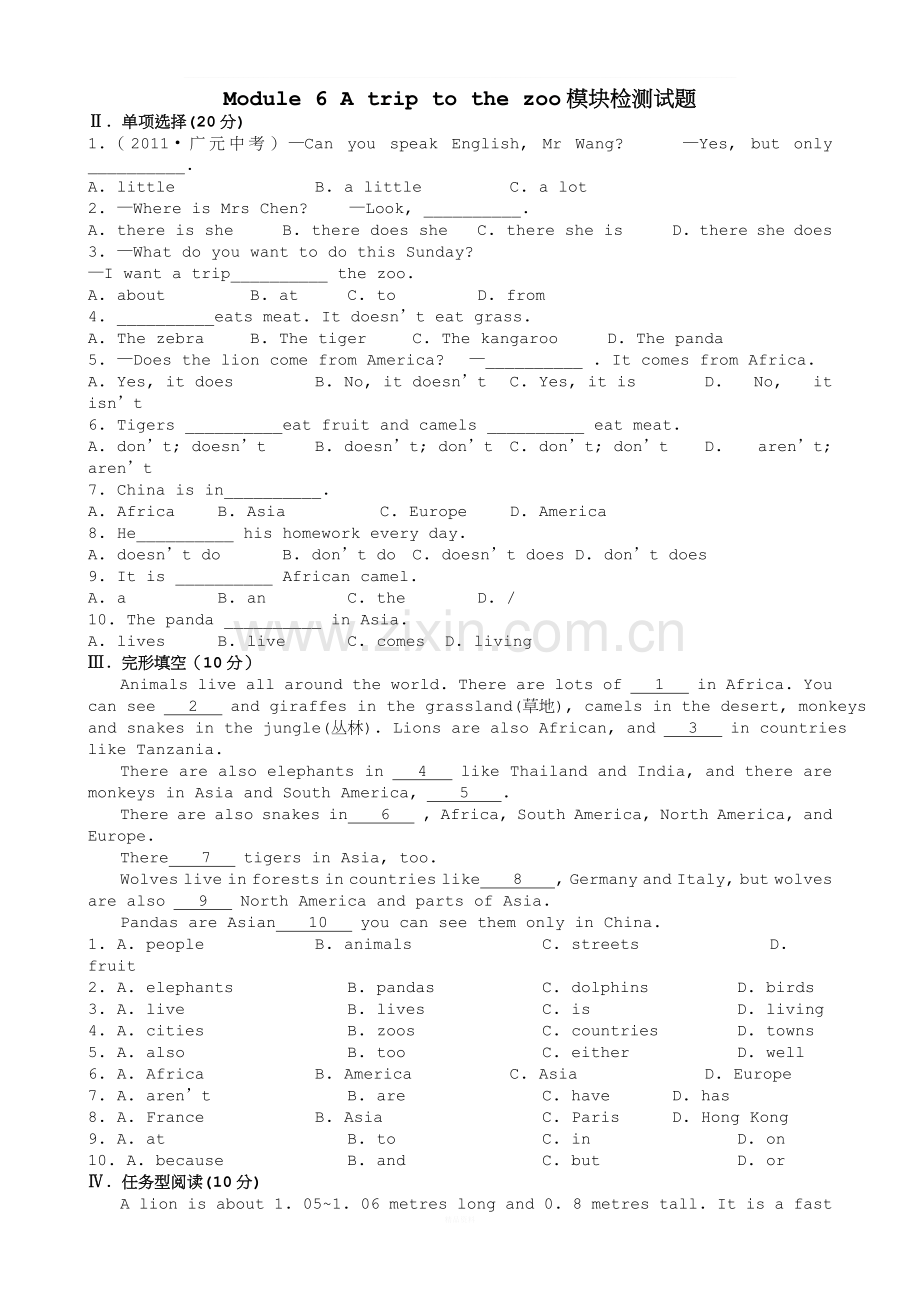 Module 6 A trip to the zoo模块检测试题