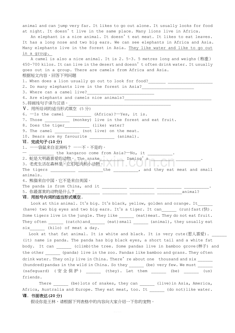 Ⅵ.答案: 1. Does; doesn’t 2. is; favourite animal 3. live in;forest