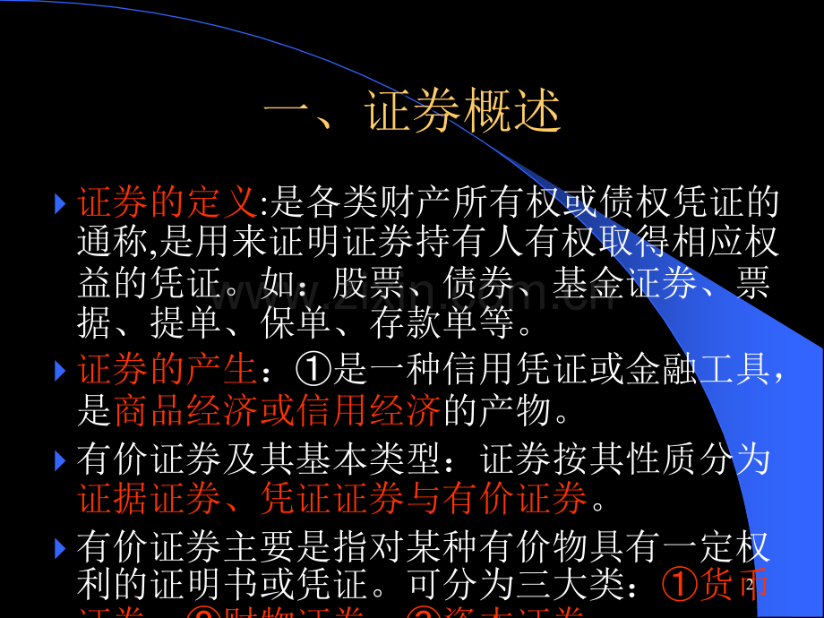 l证券概述l债券l股票l证券投资基金l金融衍生工具1第2章证券市场投资工具证券的定义:是各类财产所有权或债权凭证的通称,是用来证明证券持有人有权取得相应权益的凭证。如:股票、债券、基金证券、票据、提单、保单、存款单等。证券的产生:是一种信用凭证或金融工具,是商品经济或信用经济的产物。有价证券及其基本类型:证券按其性质分为证据证券、凭证证券与有价证券。有价证券主要是指对某种有价物具有一定权利的证明书或凭证。可分为三大类:货币证券;财物证券;资本证券。有价证券不是劳动产品,自身没有价值。2一、证券概述l按发行主体分为:政府证券、金融证券与公司证券。l按所体现内容不同分为:货币证券、资本证券与货物证券。l按是否上市可分为:上市证券与非上市证券。3有价证券的分类4l也称政府债券,是指政府为筹措财政资金或建设资金我,凭借其信用,采用信用方式,按照一定程序向投资者出具一种债权债务凭证。主要包括中央政府债券与地方政府债券。政府债券发称国债。5政府证券l是指商业银行及非银行金融机构为筹措信贷资金而向投资者发行的承诺支付一定利息并到期偿还本金的一种有价证券。l主要有:金融债券、大额可转让定期存单等。6金融证券l是公司为筹措资金而发行的有价证券。l主要有股票、公司债券等。l股票:是股份公司依照公司法的规定,为筹措公司资本,公开发行的用以证明股东身份和权益的凭证。它本身没有价值,是一种独立于实际资本之外的虚拟资本。l公司债券:是股份有限公司或其他类型的股份制企业为筹措资金而发行的并承诺在一定时期内还本付息的债权凭证。7公司证券l指可以用来代替货币使用的有价证券,是商业信用的工具。l主要有:期票、汇票、支票、本票等。l期票:由债务人向债权人开出的,在约定期限支付款项的债务证书。8货币证券l汇票:是由出票人签发的,委托付款人在见票划或者在指定日期无条件支付确定的金额给收款人或者持票人的票据。l支票:由出票人签发的,委托办理支票存款业务的银行或其他金融机构在见票时无条件支付确定的金额给收款人或者持票人的票据。l本票:由出票人签发的,承诺自己在见票时无条件支付确定的金额给收款人或持票人的票据。9l是有价证券的主要形式,是把资本投入到企业或把资本贷给企业和国家的一种证书。l主要包括:股权证券、债权证券。l狭义的有价证券通常是指资本证券。l资本证券的价格总额总是大于实际资本额。10资本证券l是对货物有提取权的证明,它证明证券持有人可以凭单提取单据上所列明的货物。l主要有:栈单、运货证书及提货单等。11货物证券l又称挂牌证券,指经证券主管机关批准,并向证券交易所注册登记,独得资格在交易所内进行公开买卖的有价证券。12上市证券l也称非挂牌证券、场外证券。它是指未在证券交易所挂牌,由公司自行发行或推销的股票或债券。13非上市证券l定义:是一种有价证券,是社会各类经济主体为筹措资金而向债券投资者出具的并且承诺按一定利率定期支付利息和到期偿还本金的债权债务凭证。l票面要素:票面价值、票面金额。l债券的发行价格:溢价、折价与平价发行三种。l债券的交易价格:市场交易价格l债券的期限:短期、中期与长期三种债券。14二、债券的定义l债务人对资金需求的时限;l未来市场利率的变化趋势;l证券交易市场怕发达程度;l债券的利率;15影响债券偿还期限的因素l银行利率水平;l发行者的资信状况;l债券的偿还期限;l资本市场的债券供求状况。16影响债券利率的主要因素l按发行主体分:政府债券、金融债券、公司债券与国际债券。l按偿还期限分:短期、中期与长期三种债券。l按计息的方式分:附息债券、贴现债券、单利债券与累进利率债券。l按债券的利率浮动与否分:固定利率债券与浮动利率债券。l按是否记名分:记名债券与不记名债券。l按有无抵押担保分:信用债券担保债券。l按债券形态分:实物债券、凭证式债券与记账式债券。17债券的类型:l偿还性l流动性l安全性l收益性l注意:债券的上述特性之间有一定的矛盾。18债券的基本特征:l定义:是指政府为筹措财政资金,凭其信誉按照一定程序向投资者出具的承诺在一定时期支付利息和到期偿还本金的一种格式化的债权债务凭证。l特点:自愿性、安全性、流动性、免税待遇、收益稳定等。19公债:l定义:是股份公司或企业发行的有价证券,是公司筹措长期资金而发行的一种债务契约,承诺在未来的特定日期偿还本金并按照事先规定的利率支付利息。l公司债券的特征:风险性较大、收益率较高、债券持有者比股票持有者有优先索取利息和优先要求补偿的权利、对于部份公司债券来说,发行者与持有者之间相互给予一定的选择权。20公司债券:l定义:是由银行或非银行金融机构为筹措资金而发行的债务凭证。l特征:与公司债券相比有较高的安全性;与银行存款相比有较高有盈利性。21金融债券:l定义:是一国政府、金融机构、工商企业或国际性组织为筹措中长期资金而在国外金融市场上发行的以外国货币为面值的债券。l特点:资金来源广泛;期限长、数额大;资金的安全性较高。22国际债券 l股票:是股份公司依照公司法的规定,为筹措公司资本,公开发行的用以证明股东身份和权益的凭证。23三、股票的定义:l债转股