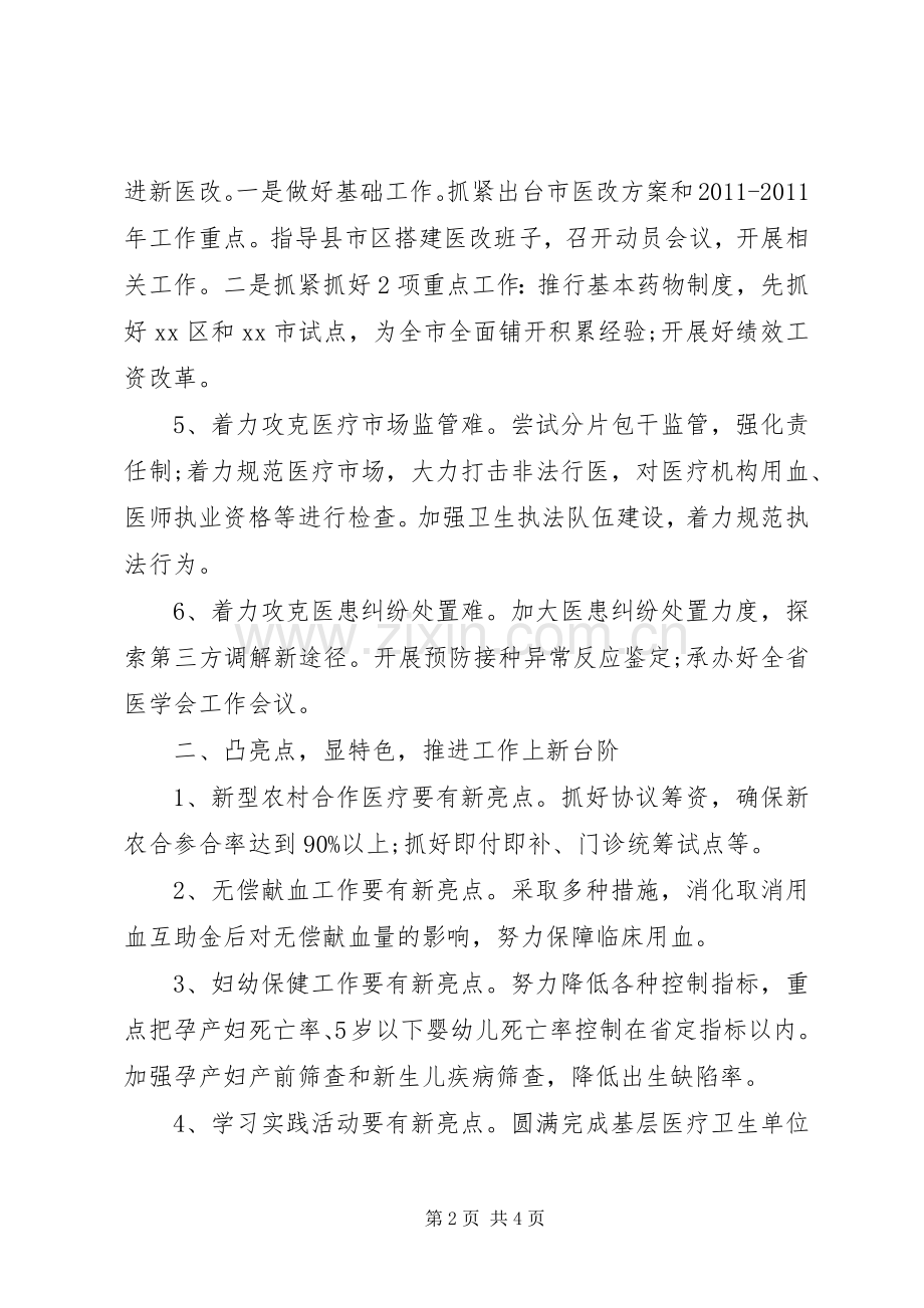 4、着力攻克医改难点。由点及面,由易到难,逐步稳妥推进新医改。一是做好基础工作。抓紧出台市医改方案和2011-2011年工作重点。指导县市区搭建医改班子,召开动员会议,开展相关工作。二是抓紧抓好2项重点工作:推行基本药物制度,先抓好xx区和xx市试点,为全市全面铺开积累经验;开展好绩效工资改革。