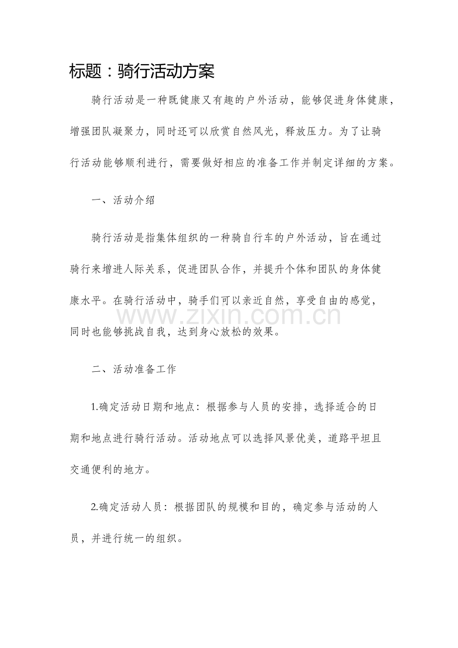 总之,骑行活动是一种健康、有趣且有益身心的户外活动。通过制定详细的方案,并加强组织和准备工作,可以确保活动的顺利进行,达到团队和个体的目标。参与骑行活动的人员不仅可以享受健康的乐趣,还能够加强团队的凝聚力,建立友谊,留下美好的回忆。