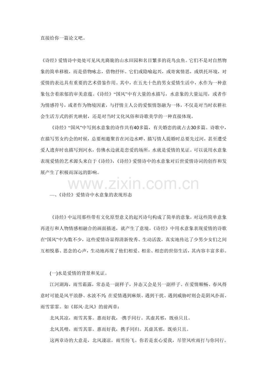 《诗经》“国风”中写到水意象的诗作共有40多篇,有关婚恋的就占去30多篇。诗歌中,在描写男女约会的时候,总要相邀聚首在河边水畔,描写情人提婚时总要先过河,甚至遭受爱人遗弃时也描写到河水,仿佛水边就是恋爱的场所,水就是爱情的见证。可以说用水意象表现爱情的艺术源头来自于《诗经》,《诗经》爱情诗中的水意象对后世爱情诗词的创作和发展产生了积极而深远的影响。