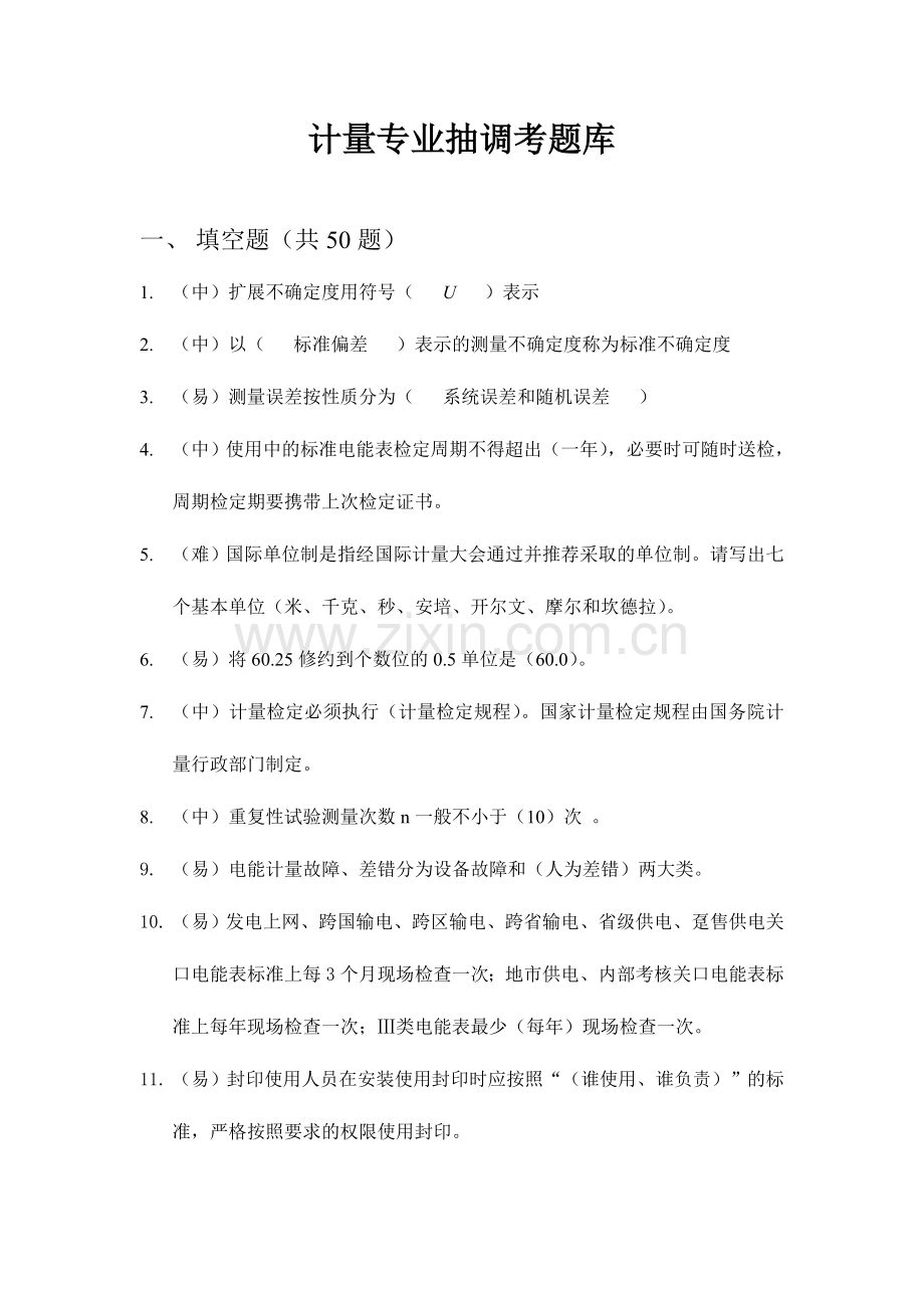 计量专业抽调考题库