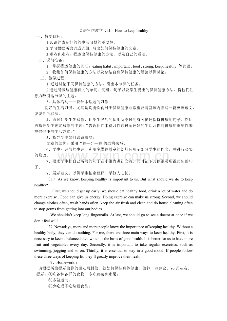本课的设计使学生学会了如何谈论保持身体健康,提高了学生学习兴趣,拓宽了学生的知识面,提供了一定的语言实践,锻炼了学生运用语言的能力。在今后的教学中要增加其他不同类型的写作训练,以提高学生的写作能力。只要我们思想上重视,训练方法得当,定能达成《课程标准》中的要求,从而为学生进一步学好英语打下扎实的基础,使学生在中考中取得满意的成绩。