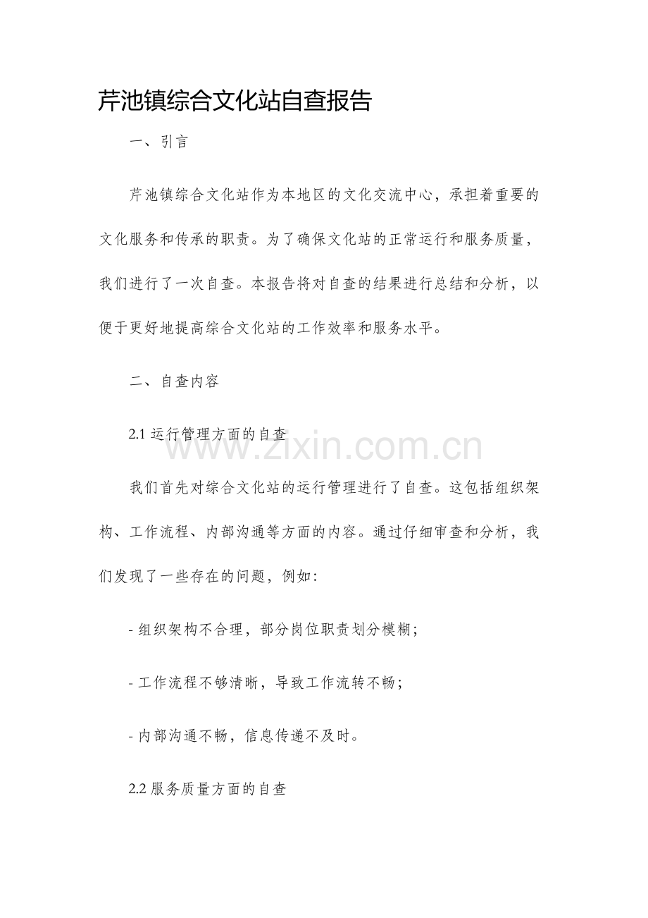 通过本次自查,我们对芹池镇综合文化站的运行管理、服务质量和设施设备进行了全面的审查和分析。我们发现了存在的问题,并制定了相应的改进措施。相信在全体员工的努力下,综合文化站将能够持续提高服务水平,为社区居民提供更加优质的文化服务。