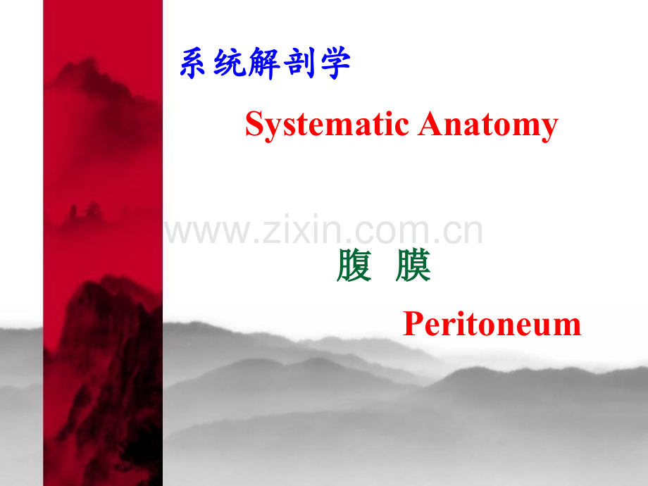 系统解剖学系统解剖学Systematic AnatomyPeritoneum腹腹 膜膜腹腹 膜膜一一.概述概述二二.腹膜与腹盆腔脏器的关系腹膜与腹盆腔脏器的关系三三.腹膜形成的结构腹膜形成的结构PeritoneumPeritoneum腹腹 腔腔 (Abdominal CavityAbdominal Cavity)脏腹膜脏腹膜 (Visceral PeritoneumVisceral Peritoneum)壁腹膜壁腹膜 (Parietal PeritoneumParietal Peritoneum)腹腹 膜膜 (PeritoneumPeritoneum)一一.概述概述腹膜腔腹膜腔 (Peritoneal CavityPeritoneal Cavity)网膜孔网膜孔 (Omental ForamenOmental Foramen)大腹膜腔大腹膜腔小腹膜腔小腹膜腔即即网膜囊网膜囊 (Omental BursaOmental Bursa)男性封闭,女性间接与外界相通男性封闭,女性间接与外界相通 腹腔与腹膜腔的区别:腹腔与腹膜腔的区别:腹腔:指膈以下、骨盆上口以上,位于腹前壁和腹后壁之间的体腔。腹腔:指膈以下、骨盆上口以上,位于腹前壁和腹后壁之间的体腔。腹膜腔:套在腹腔内,位于脏腹膜和壁腹膜之间的潜在腔隙,腔内仅含少腹膜腔:套在腹腔内,位于脏腹膜和壁腹膜之间的潜在腔隙,腔内仅含少量浆液。量浆液。脏器位于腹腔之内、位于腹膜腔之外;脏器位于腹腔之内、位于腹膜腔之外;腹腔为脏器和腹膜腔所占据。腹腔为脏器和腹膜腔所占据。1.1.内位器官内位器官3.3.外位器官外位器官2.2.间位器官间位器官二二.腹膜与腹盆腔脏器的关系腹膜与腹盆腔脏器的关系 根据脏器被覆腹膜程度和范围大小,可分根据脏器被覆腹膜程度和范围大小,可分为为3 3类:类:了解脏器与腹膜的关系,对于指导临床操了解脏器与腹膜的关系,对于指导临床操作有重要意义。作有重要意义。膀胱穿刺膀胱穿刺子宫经腹膜腔外手术子宫经腹膜腔外手术试问胃、肾手术分别是否必须通过腹膜腔?试问胃、肾手术分别是否必须通过腹膜腔?1.1.网膜网膜 (OmentaOmenta)2.2.系膜系膜 (MesenteriesMesenteries)3.3.韧带韧带 (LigamentLigament)4.4.皱襞皱襞 (FoldsFolds)隐窝隐窝 (FossaFossa)三三.腹膜形成的结构腹膜形成的结构 壁腹膜与脏腹膜之间,或者脏腹膜之间互相折返移行,其移行部分形成许多壁腹膜与脏腹膜之间,或者脏腹膜之间互相折返移行,其移行部分形成许多结构:结构:陷凹陷凹 (PouchPouch)1.1.网膜网膜 (OmentaOmenta)与胃小弯和胃大弯相连的双层腹膜与胃小弯和胃大弯相连的双层腹膜皱襞,包括:皱襞,包括:小网膜小网膜大网膜大网膜 (Greater OmentumGreater Omentum)(Lesser OmentumLesser Omentum)小网膜小网膜(Lesser OmentumLesser Omentum)肝胃韧带肝胃韧带肝十二指肠韧带肝十二指肠韧带大网膜大网膜 (Greater OmentumGreater Omentum)胃结肠韧带胃结肠韧带横结肠系膜横结肠系膜网膜囊网膜囊(Omental BursaOmental Bursa)网膜孔网膜孔 (WinslowWinslow孔孔)2.2.系膜系膜 (MesenteriesMesenteries)壁、脏腹膜相互延续移行,将脏器系连固定于腹盆壁的双层腹膜,壁、脏腹膜相互延续移行,将脏器系连固定于腹盆壁的双层腹膜,其内出入有血管、神经及淋巴管和淋巴结等。其内出入有血管、神经及淋巴管和淋巴结等。肠系膜肠系膜横结肠系膜横结肠系膜乙状结肠系膜乙状结肠系膜阑尾系膜阑尾系膜3.3.韧带韧带 (LigamentLigament)连接腹盆壁与脏器之间或相邻脏器之间的腹膜结构。连接腹盆壁与脏器之间或相邻脏器之间的腹膜结构。镰状韧带镰状韧带右三角韧带右三角韧带冠状韧带冠状韧带左三角韧带左三角韧带肝裸区肝裸区肝肝的的韧韧带带胃脾韧带胃脾韧带脾结肠韧带脾结肠韧带膈脾韧带膈脾韧带脾肾韧带脾肾韧带脾脾的的韧韧带带脐正中襞脐正中襞脐尿管脐尿管脐内侧襞脐内侧襞脐动脉脐动脉脐外侧襞脐外侧襞腹壁下血管腹壁下血管膀胱上窝膀胱上窝腹股沟内侧窝腹股沟内侧窝腹股沟外侧窝腹股沟外侧窝4.4.皱襞皱襞 (FoldsFolds)隐窝隐窝 (FossaFossa)陷凹陷凹 (PouchPouch)肝肾隐窝肝肾隐窝直肠膀胱陷凹直肠膀胱陷凹直肠子宫陷凹直肠子宫陷凹膀胱子宫陷凹膀胱子宫陷凹腹腹 膜膜5m45s【学习内容与要求学习内容与要求】1.1.掌握腹膜的位置、分布和结构特点。掌握腹膜的位置、分布和结构特点。2.2.掌握腹膜形成的结构。掌握腹膜形成的结构。【复习思考题复习思考题】1.何谓腹膜腔?与腹腔有何区别?女性腹膜腔如何何谓腹膜腔?与腹腔有何区别?女性腹膜腔如何 与外界相通?与外界相通?2.试述网膜囊的位置及其结构特点。试述网膜囊的位置及其结构特点。3.试述女性盆腔的腹膜陷凹及其临床意义。试述女性盆腔的腹膜陷凹及其临床意义。