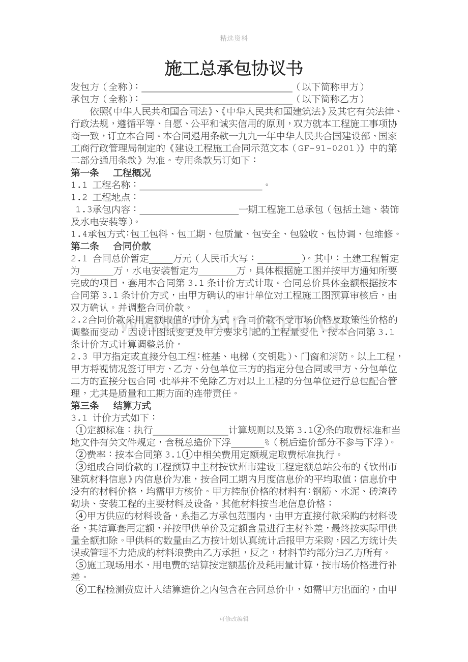 依照《中华人民共和国合同法》、《中华人民共和国建筑法》及其它有关法律、行政法规,遵循平等、自愿、公平和诚实信用的原则,双方就本工程施工事项协商一致,订立本合同。本合同退用条款一九九一年中华人民共合国建设部、国家工商行政管理局制定的《建设工程施工合同示范文本(GF-91-0201)》中的第二部分通用条款》为准。专用条款另订如下: