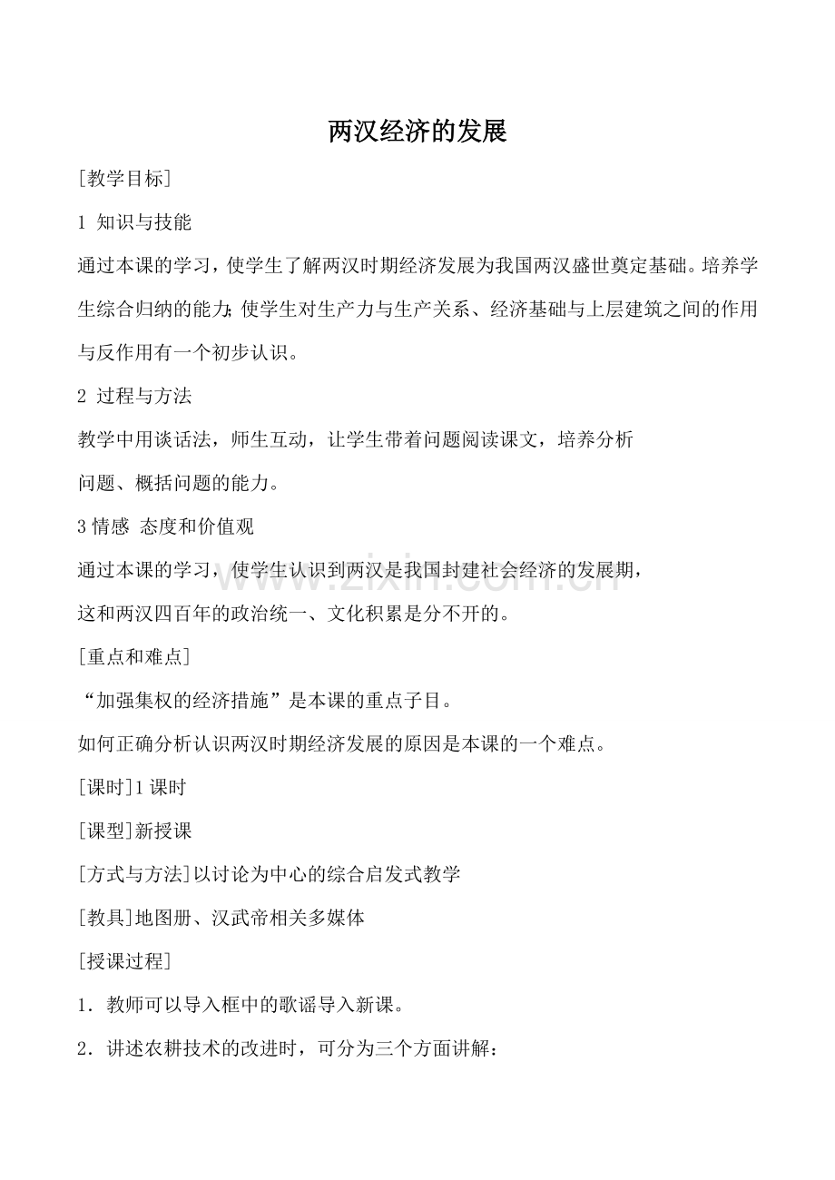 通过本课的学习,使学生了解两汉时期经济发展为我国两汉盛世奠定基础。培养学生综合归纳的能力;使学生对生产力与生产关系、经济基础与上层建筑之间的作用与反作用有一个初步认识。
