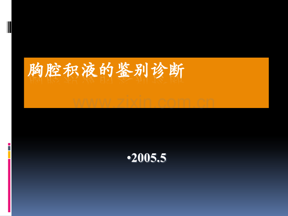 胸腔积液的鉴别诊断胸腔积液的鉴别诊断2005.52概念胸膜腔内液体产生和吸收速率一致,液体总量小于15ml。当全身或局部病变导致胸膜腔内液体形成过多或吸收过缓,胸腔中液体大为增加,临床出现胸腔积液(胸液)。3胸腔积液转运新机制示意图4胸腔积液的发生机制壁层胸膜毛细血管在胸腔积液的形成中起主要作用,胸液从胸壁体循环毛细血管滤过到胸壁间质,随后进入胸膜腔。大部胸液(75%)通过壁层胸膜淋巴管引流。5胸腔积液的发生机制胸液滤过速度从肺尖到肺底呈逐渐下降趋势,而淋巴管引流量则在肺底区域最大。由于其滤过和吸收部位不同,胸液可在胸膜腔内循环。6胸腔积液的发生机制当各种原因使液体滤过速度超过淋巴管最大的引流量时即出现胸腔积液。7胸腔积液的发生机制胸腔积液的发生机制1 1 微循环静水压增高微循环静水压增高 充血性心力衰竭充血性心力衰竭2 2 微循环胶体渗透压下降微循环胶体渗透压下降 严重低蛋白血症严重低蛋白血症 3 3 胸腔内压力减低胸腔内压力减低 完全的肺塌陷完全的肺塌陷 4 4 微循环渗透性改变微循环渗透性改变 肺炎肺炎5 5 胸壁淋巴回流受阻胸壁淋巴回流受阻 恶性肿瘤恶性肿瘤6 6 腹腔积液流入腹腔积液流入 肝硬化腹水肝硬化腹水7 7 其它其它 外伤、食管破裂、外伤、食管破裂、胰腺炎、阿米巴等胰腺炎、阿米巴等8临床表现胸痛、呼吸困难或咳嗽等症状,但都不特异。根据不同病因,病人还可呈现原发病的特异临床表现。9诊断明确是否存在胸腔积液;渗出液还是漏出液明确胸液的病因。10明确是否存在胸腔积液病史:胸痛、呼吸困难或咳嗽等症状查体:叩浊,呼吸音减低,患侧胸腔饱满,肋间隙增宽、平直,肺野叩实,语颤和呼吸音消失等。辅助检查(胸片、胸部CT、B超、MRI、PET)11胸液鉴别的方法胸液的外观(气味、颜色、透明度)。常规、生化胸液LDH胸液淀粉酶胸液腺苷脱氨酶(ADA)胸液透明质酸酸性磷酸酶。12胸液鉴别的方法胸液免疫学检查:1).癌胚抗原CEA。2).抗PPD-IgG抗体测定3).T淋巴细胞亚群分析。13胸液鉴别的方法 胸液脱落细胞学检查:胸液染色体检查:出现10%超二倍体,恶性胸液的确诊率可达81%。多聚酶链反应(PCR):结核杆菌14胸液鉴别的方法侵入性检查:闭式胸膜活检 纤维支气管镜 胸腔镜 开胸胸膜活检15渗出液与漏出液的鉴别16渗出液与漏出液的鉴别17区别漏出液和渗出液的指标区别漏出液和渗出液的指标Light氏标准氏标准:符合以下一个或一个以上者为渗符合以下一个或一个以上者为渗出液:出液:蛋白定量:胸腔积液蛋白定量:胸腔积液/血浆比值血浆比值 0.5 LDH:胸腔积液胸腔积液/血清比值血清比值 0.6 胸腔积液中的胸腔积液中的 LDH 大于正常血清大于正常血清 LDH 的的2/3上限(胸腔积液上限(胸腔积液 LDH 200IU/L)18区别漏出液和渗出液的指标区别漏出液和渗出液的指标目前诊断渗出液的新标准有:目前诊断渗出液的新标准有:胸腔积液中的胆固醇水平大于胸腔积液中的胆固醇水平大于60mg%(胸水(胸水/血清血清0.3)。)。白蛋白:白蛋白:血清血清胸腔积液差值胸腔积液差值 12g/L19漏出液病因漏出液病因充血性心力衰竭充血性心力衰竭肝硬化肝硬化 肾病综合征肾病综合征腹膜透析腹膜透析胸膜淀粉样变胸膜淀粉样变上腔静脉阻塞综合征上腔静脉阻塞综合征 缩窄性心包炎缩窄性心包炎肺不张肺不张粘液性水肿粘液性水肿肺栓塞肺栓塞尿液胸尿液胸(Urinothorax)麦格(麦格(meigs)综合征)综合征20渗出液病因(渗出液病因(1 1)恶性胸腔积液恶性胸腔积液肺癌肺癌 淋巴瘤淋巴瘤间皮瘤间皮瘤 胸膜转移瘤胸膜转移瘤感染感染 肺炎旁胸腔积液肺炎旁胸腔积液结核性胸膜炎结核性胸膜炎霉菌性胸膜炎霉菌性胸膜炎病毒性胸膜炎病毒性胸膜炎寄生虫性胸膜炎寄生虫性胸膜炎腹腔脓肿腹腔脓肿21胶原血管疾病胶原血管疾病红斑狼疮红斑狼疮 类风湿性关节炎类风湿性关节炎Wegener Wegener 肉芽肿肉芽肿Churg-Strauss Churg-Strauss 综合征综合征干燥综合征干燥综合征免疫母细胞淋巴结病免疫母细胞淋巴结病非感染性胃肠道疾病非感染性胃肠道疾病 胰腺炎胰腺炎 食道破裂食道破裂 腹部手术腹部手术渗出液病因(渗出液病因(2 2)22淋巴疾病淋巴疾病乳糜胸乳糜胸淋巴管肌瘤病淋巴管肌瘤病黄指甲综合征黄指甲综合征其它类其它类肺栓塞肺栓塞石棉肺石棉肺放射治疗放射治疗麦格(麦格(meigs)综合征)综合征血胸血胸冠脉搭桥术后冠脉搭桥术后结节病结节病渗出液病因(渗出液病因(3 3)23药物诱发的胸腔积液药物诱发的胸腔积液药物诱发性狼疮药物诱发性狼疮乙胺碘肤酮乙胺碘肤酮博来霉素博来霉素丝裂霉素丝裂霉素米诺地尔米诺地尔(Minoxidil)美西麦角美西麦角(Methysergide)丹曲洛林(丹曲洛林(Dantrolene)Dantrolene)IL-2IL-2渗出液病因(渗出液病因(4 4)24渗出性胸腔积液的鉴别诊断葡萄糖葡萄糖 60 mg/dL60 mg/dL 肺炎旁胸腔积液肺炎旁胸腔积液 类风湿性关节炎类风湿性关节炎 恶性肿瘤恶性肿瘤 结核性胸膜炎结核性胸膜炎 肺吸虫病肺吸虫病25pH 7.2pH 正常值上限正常值上限 食道破裂食道破裂 胰腺炎胰腺炎 恶性肿瘤恶性肿瘤渗出性胸腔积液的鉴别诊断27红细胞红细胞 如红细胞比积如红细胞比积 1 100,000/mm 100,000/mm 肿瘤肿瘤 结核结核 创伤创伤 肺栓塞肺栓塞 肺丝虫病肺丝虫病 肺炎肺炎 如红细胞比积如红细胞比积 50为血胸为血胸渗出性胸腔