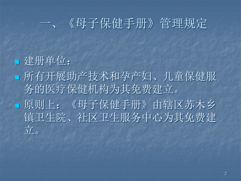 母子保健手册与孕产妇、儿童保健管理工作的要求1 1一、母子保健手册管理规定n n建册单位:n n所有开展助产技术和孕产妇、儿童保健服务的医疗保健机构为其免费建立。n n原则上:母子保健手册由辖区苏木乡镇卫生院、社区卫生服务中心为其免费建立。2 2一、母子保健手册管理规定n n建册对象:n n自治区境内的早孕期妇女和新生儿,包括流动人口和常驻人口。3 3一、母子保健手册管理规定n n建册内容:建册日期、建册单位、联系电话、建册编号(分别是孕妇和新生儿的健康档案编号,此项由辖区医疗单位填写)、孕妇基本情况、产前胎儿筛查情况、产期检查随访服务情况、分娩情况、产后访视情况、产后42天健康检查情况、新生儿疾病筛查情况、新生儿家庭访视情况、3岁以下儿童生长发育监测情况和7岁以内健康体检情况等。4 4一、母子保健手册管理规定n n第一次产前随访服务要求:第一次产前随访服务要求:n n时间:孕足时间:孕足1212周前周前n n服务对象:孕妇服务对象:孕妇n n服务机构:苏木乡镇卫生院和社区卫生服务中心服务机构:苏木乡镇卫生院和社区卫生服务中心n n服务内容:服务内容:n n1 1、为孕产妇进行健康状况评估:询问既往史、家族、为孕产妇进行健康状况评估:询问既往史、家族史等,观察体态、精神等,进行一般体检、史等,观察体态、精神等,进行一般体检、妇科检查妇科检查和血常规,有条件的地区进行血型、尿常规、肝功能、和血常规,有条件的地区进行血型、尿常规、肝功能、阴道分泌物、梅毒血清学试验、阴道分泌物、梅毒血清学试验、HIVHIV抗体检测等实验抗体检测等实验室检查。室检查。5 5一、母子保健手册管理规定n n2、为其提供孕早期个人卫生、心里和营养保健指导,特别要强调避免致畸因素和疾病对胚胎的不良影响,同时进行产前筛查和产前诊断的宣传告知。n n3、根据检查结果填写第一次随访服务记录表,对具有危险因素和可能有妊娠禁忌症及严重并发症的孕妇,及时转诊上级医疗保健机构,并在2周内随访转诊结果。6 6一、母子保健手册管理规定n n第第2 2、3 3次产前随访服务要求:次产前随访服务要求:n n时间:孕时间:孕16201620周、周、21242124周周n n服务对象:孕妇、胎儿服务对象:孕妇、胎儿n n服务机构:苏木乡镇卫生院、社区卫生服务中心服务机构:苏木乡镇卫生院、社区卫生服务中心n n服务内容:服务内容:n n1 1、孕妇健康状况评估:通过询问、观察、一般体格、孕妇健康状况评估:通过询问、观察、一般体格检查、检查、产科检查产科检查、实验室检查,对孕妇健康状况和胎、实验室检查,对孕妇健康状况和胎儿生长发育状况进行评估,筛查出需要做产期诊断和儿生长发育状况进行评估,筛查出需要做产期诊断和需要转诊的孕妇。需要转诊的孕妇。n n2 2、对未发现异常的孕妇,应进行孕中期的个人卫生、对未发现异常的孕妇,应进行孕中期的个人卫生、心里、运动和营养指导,同时进行预防出生缺陷的产心里、运动和营养指导,同时进行预防出生缺陷的产前筛查和产前诊断的宣传告知。前筛查和产前诊断的宣传告知。7 7一、母子保健手册管理规定n n3、给予自我监护方法指导、分娩准备教育和母乳喂养指导,落实孕妇在24周后到有助产资质的医疗保健机构继续进行产前检查和住院分娩。n n4、发现异常的孕妇,及时转至上级医疗保健机构,出现危急征象的孕妇,要立即组织人员转诊护送。8 8一、母子保健手册管理规定n n第第4 4、5 5次产前随访服务要求:次产前随访服务要求:n n时间:时间:25362536周、周、37403740周周n n服务对象:孕妇和胎儿服务对象:孕妇和胎儿n n服务机构:重点为有助产资质的医疗保健机构服务机构:重点为有助产资质的医疗保健机构n n服务内容:服务内容:n n1 1、询问前次产前检查之后有无特殊情况出现,特别、询问前次产前检查之后有无特殊情况出现,特别要关注孕期并发症和合并症的表现。要关注孕期并发症和合并症的表现。n n2 2、测量体重和血压,检查有无水肿及其他异常,建、测量体重和血压,检查有无水肿及其他异常,建议复查血常规和尿常规。(妊娠高血压疾病发病率议复查血常规和尿常规。(妊娠高血压疾病发病率10%10%)9 9一、母子保健手册管理规定n n3、复查胎位,听胎心率,测功底高度、腹围,并注意胎儿大小与孕周是否相符。n n4、对孕妇进行孕晚期保健教育,并督促做好自我监测。1010一、母子保健手册管理规定n n产后访视要求:产后访视要求:n n时间:孕产妇出院后时间:孕产妇出院后3737天内天内n n服务对象:产妇和新生儿服务对象:产妇和新生儿n n服务机构:苏木乡镇卫生院(嘎查村卫生室)、社区服务机构:苏木乡镇卫生院(嘎查村卫生室)、社区卫生服务中心到产妇家中卫生服务中心到产妇家中n n服务内容:服务内容:n n1 1、通过观察、询问、检查,了解产妇一般情况、乳、通过观察、询问、检查,了解产妇一般情况、乳房、子宫、出血和恶露、会阴或腹部伤口恢复情况,房、子宫、出血和恶露、会阴或腹部伤口恢复情况,同时检查新生儿的基本情况。同时检查新生儿的基本情况。n n2 2、对康复正常及出现母乳喂养、产后便秘、痔疮、对康复正常及出现母乳喂养、产后便秘、痔疮、会阴伤口等问题的产妇要进行产褥期保健指导和相关会阴伤口等问题的产妇要进行产褥期保健指导和相关问题处