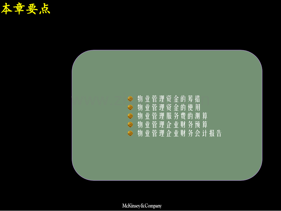 物业管理实务物业管理实务 第八章 物业管理经费与财务管理本章本章要点要点物业管理资金的筹措物业管理资金的使用物业管理服务费的测算物业管理企业财务预算物业管理企业财务会计报告学习目的与要求学习目的与要求1了解物业管理资金的来源物业管理服务费测算的意义物业管理服务收费的构成财务预算概述财务会计报表的编制要求2掌握物业管理资金的主要用途物业管理企业财务预算控制的内容和程序资产负债表、利润表和利润分配表、现金流量表的概念、作用和结构物业管理费使用情况公示3 3重点掌握物业管理资金的使用原则物业管理服务费测算的主要定额物业管理处的财务预算物业管理企业的财务预算物业管理资金的筹措物业管理资金的筹措物业管理资金物业管理企业资本金的筹措物业管理经费的筹措物业管理资金的含义物业管理资金的含义是指物业管理企业所拥有的各种财产物资的货币表现,包括货币本身物业管理资金分类物业管理资金分类 资本金资本金:物业管理企业设立所需资金物业管理企业创立所必需的资金,称为资本金(即注册资金)物业管理经费物业管理经费:是提供物业管理服务所需资金补偿物业管理企业在提供物业管理服务活动过程中活劳动和物化劳动的消耗,称为物业管理经费物业管理企业资本金的筹措物业管理企业资本金的筹措资本金和法定资本金资本资本金和金和法定法定资本资本金金资本金:资本金:是指企业在登记注册时填报的投资者投入企业的资金总额,即企业的实收资本(股份制企业称股本)法定资本金或法定最低资本金法定资本金或法定最低资本金:是指国家规定的开办企业必须具备的最低限额资本金 注册资本金的规定注册资本金的规定 根据建设部1999年11月4日公布的物业管理企业资质管理试行办法规定:物业管理企业注册资本一级资质:500万元人民币以上二级资质:300万元人民币以上三级资质:50万元人民币以上 可见,要创立一个持续正常营业的物业管理企业,必须筹集50万元以上人民币的资本金物物业业管管理理企企业业资资本本金金的的筹筹措措不同组织形式的物业管理企业,其资本金的筹措方式和渠道不同现有物业管理企业基本上为有限责任公司,可由国家单一投资设立,也可以由250个股东共同出资设立,股东可以是国家、法人、自然人、外商国内现存物业管理有限公司大多数是以开发商为主的法人资金和自然人(内部职工)或外商共同出资组建物业管理经费按其来源可分为四种:物业维修基金物业管理服务费物业经营收入国家财政补贴物业管理经费的筹措物业管理经费的筹措物业维修基金物业维修基金物业维修基金又称代管基金,是物业管理企业接受业主管理委员会或物业产权人、使用人委托代管的专项用于房屋共用部分,共用设备和公用设施维修、更新的专项基金不同物业种类维修基金的筹措不同物业种类维修基金的筹措商品住宅维修基金的筹措:商品住宅维修基金的筹措:购房者应当按购房款2%3%的比例向售房单位缴交维修基金。售房单位代为收取的维修基金属全体业主共同所有,不计入住宅销售收入不同物业种类维修基金的筹措不同物业种类维修基金的筹措公有住房售后的维修基金筹措:公有住房售后的维修基金筹措:售房单位按一定比例从售房款中提取,原则上多层住宅不低于售房款的20%,高层住宅不低于售房款的30%,该部分基金属售房单位所有购房者按购房款2%的比例向售房单位缴交维修基金,售房单位代为收取的维修基金属全体业主共司所有,不计入住宅销售收入不同物业种类维修基金的筹措不同物业种类维修基金的筹措专项维修资金:购房者按住宅建筑面积40元/M2(非住宅建筑面积50元/M2)的标准交纳首期专项维修资金。不足购房款2%的部分,由购房者按业主大会决定的方案交纳新规定:新规定:(200320031111)不同物业种类维修基金的筹措不同物业种类维修基金的筹措物业管理用房、经营用房的维修基金筹措:物业管理用房、经营用房的维修基金筹措:住宅小区的管理用房、经营用房,以及共用设施设备,均属于住宅小区的全体业主共有由业主提供给物业管理企业使用或委托物业管理企业经营,并支付使用费,经业主委员会确认之后转为该类房屋的维修基金物业管理企业负有维护和管理责任,但因其不是物业管理企业固定资产,物业管理企业不能对其计提折旧不同物业种类维修基金的筹措不同物业种类维修基金的筹措公共配套设施大修理资金来源:公共配套设施大修理资金来源:物业管理企业使用业主委员会或物业产权人、使用人提供的管理用房、经营用房和共用设施设备,应按照国家法律、法规的规定或者双方签订的合同,协议支付有关费用(如租赁费、承包费)物业管理企业支付的管理用房、经营用房、共用设施设备有偿使用费,经业主委员会或物业产权人、使用人认可后转作管理用房、经营用房的房屋共用部分维修基金和共用设施设备维修基金物业管理服务费物业管理服务费是业主或(非业主使用人)与物业管理企业在物业管理服务合同中约定的,由业主(使用人)向物业管理企业缴纳的物业管理费用物业管理服务费是保证日常物业管理工作正常运转的主要资金来源物业管理服务费物业管理服务费常规性的公共服务费用针对性的专项服务费用委托性的特约服务费用物业管