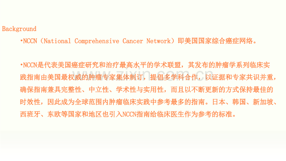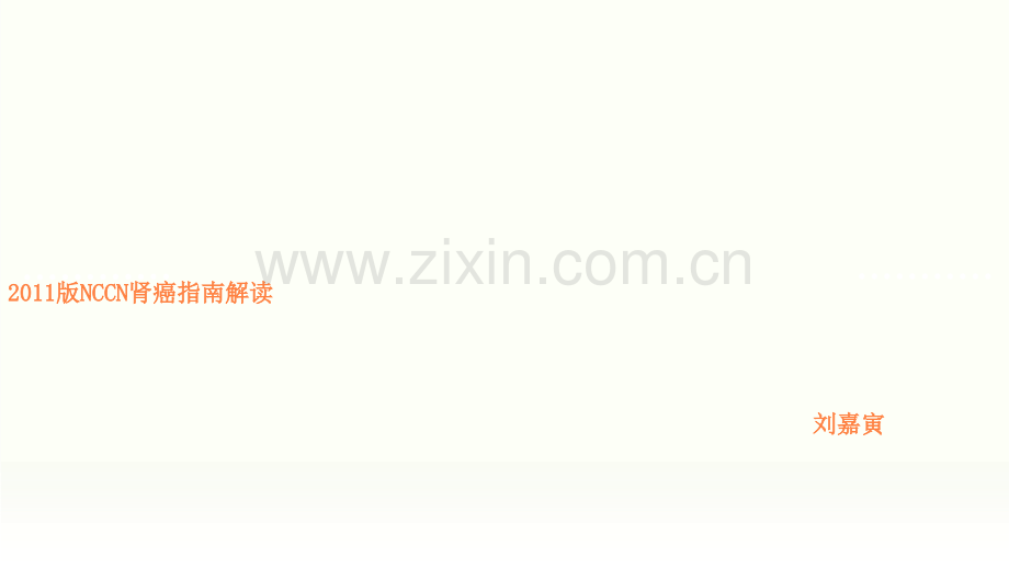 20112011版版NCCNNCCN肾癌指南解读肾癌指南解读刘嘉寅刘嘉寅BackgroundBackgroundNCCNNCCN(National Comprehensive Cancer NetworkNational Comprehensive Cancer Network)即美国国家综合癌症网络。)即美国国家综合癌症网络。NCCNNCCN是代表美国癌症研究和治疗最高水平的学术联盟,其发布的肿瘤学系列临床实是代表美国癌症研究和治疗最高水平的学术联盟,其发布的肿瘤学系列临床实践指南由美国最权威的肿瘤专家集体制订,提倡多学科合作,以证据和专家共识并重,践指南由美国最权威的肿瘤专家集体制订,提倡多学科合作,以证据和专家共识并重,确保指南兼具完整性、中立性、学术性与实用性,而且以不断更新的方式保持最佳的确保指南兼具完整性、中立性、学术性与实用性,而且以不断更新的方式保持最佳的时效性,因此成为全球范围内肿瘤临床实践中参考最多的指南。日本、韩国、新加坡、时效性,因此成为全球范围内肿瘤临床实践中参考最多的指南。日本、韩国、新加坡、西班牙、东欧等国家和地区也引入西班牙、东欧等国家和地区也引入NCCNNCCN指南给临床医生作为参考的标准。指南给临床医生作为参考的标准。BankgroundBankgroundNCCNNCCN指南包括指南包括3 3大部分:大部分:各类恶性肿瘤诊治指南、预防;各类恶性肿瘤诊治指南、预防;早期诊断指南;早期诊断指南;支持治疗指南支持治疗指南 QuestionQuestionbankgroundbankground20112011NCCNNCCN肾癌指南更新肾癌指南更新年年岁岁花相似年年岁岁花相似岁岁年年人不同岁岁年年人不同ContentsContents诊断流程、分期及预后诊断流程、分期及预后1 1 手术治疗手术治疗2 2术后辅助术后辅助3 3转移性或不可切除肾癌治疗转移性或不可切除肾癌治疗4 4ContentsContents 诊断流程、分期及预后诊断流程、分期及预后1 1 手术治疗手术治疗2 2 术后辅助术后辅助3 3 转移性或不可切除肾癌治疗转移性或不可切除肾癌治疗4 41 1、诊断流程(重要)、诊断流程(重要)病史采集病史采集体格检查体格检查实验室检查实验室检查腹盆腔腹盆腔CTCT及及MRIMRI有临床指征考虑行脑部有临床指征考虑行脑部MRIMRI或骨或骨ECTECT考虑针吸活检考虑针吸活检 2 2、分期、分期 新版指南更新亮点新版指南更新亮点 更加细致更加细致20092009年年AJCCAJCC肾癌最新分期肾癌最新分期 2 2、分期、分期 T2 T2期进一步分为期进一步分为T2a(T2a(肿瘤最大径肿瘤最大径7-10cm)7-10cm)与与T2bT2b(肿瘤最大径(肿瘤最大径10cm10cm)肾上腺受累由肾上腺受累由T3aT3a期变为期变为T4T4期与期与M M期期肾静脉瘤栓由肾静脉瘤栓由T3bT3b降为降为T3aT3a淋巴结转移由淋巴结转移由N0-2N0-2期简化为期简化为N0N0期(无淋巴结转移)和期(无淋巴结转移)和N1N1期(有淋巴结转移)期(有淋巴结转移)肾脏区域淋巴结:肾门淋巴结、下腔静脉周围淋巴结、腹主动脉周围淋巴结集合肾脏区域淋巴结:肾门淋巴结、下腔静脉周围淋巴结、腹主动脉周围淋巴结集合 3 3、预后因素、预后因素 (六大要素)(六大要素)LDHLDH高于正常值上限的高于正常值上限的1.51.5倍倍血红蛋白低于正常值下限血红蛋白低于正常值下限校正血清钙水平高于校正血清钙水平高于10mg/dl10mg/dl确诊至开始系统治疗的时间间隔小于确诊至开始系统治疗的时间间隔小于1 1年年KPSKPS评分评分7070转移器官数目转移器官数目个个ContentsContents 诊断流程、分期及预后诊断流程、分期及预后1 1 手术治疗手术治疗2 2 术后辅助术后辅助3 3 转移性或不可切除肾癌治疗转移性或不可切除肾癌治疗4 4手术治疗仍是肾癌治疗主要手段手术治疗仍是肾癌治疗主要手段1 1、手术治疗推荐进一步细化、手术治疗推荐进一步细化 临床诊断为临床诊断为 A A期患者,指南推荐进行保留肾单位手术(期患者,指南推荐进行保留肾单位手术(NSSNSS)对于肿瘤位于肾中部等无法行对于肿瘤位于肾中部等无法行NSSNSS,考虑根治性肾切除术(,考虑根治性肾切除术(RNRN)B B期标准推荐期标准推荐NSSNSS或或RNRN、期患者一致推荐期患者一致推荐RNRN 备注:备注:1.1.研究显示:对于肾脏小肿瘤选择密切随访。待肿瘤进展时再行手术是一种合研究显示:对于肾脏小肿瘤选择密切随访。待肿瘤进展时再行手术是一种合理治疗策略理治疗策略2.2.对于预期生存期较短或伴有多种合并症导致手术风险较大的局限性肾肿瘤患对于预期生存期较短或伴有多种合并症导致手术风险较大的局限性肾肿瘤患者,应首选密切观察。者,应首选密切观察。2 2、总的手术原则增加、总的手术原则增加更新了更新了NSSNSS适应症:单侧肾脏小肿瘤,双侧肾脏肿瘤、家族遗传性肾细胞癌等适应症:单侧肾脏小肿瘤,双侧肾脏肿瘤、家族遗传性肾细胞癌等等等ContentsContents 诊断流程、分期及预后诊断流程、分期及预后1 1 手术治疗手术治疗2 2 术后辅助术后辅助3 3 转移性或不可切除肾癌治疗转移性或不可切除肾癌治疗4 4 迄今为止迄今为止 ,对于肾切除术后患者包括(原发灶及孤立转移灶完全切除术后)达,对于肾切除术后患者包括(原发灶及孤立转移灶完全切除术后)达到无瘤状态的患者,辅助治疗的地位仍未确定。而观察仍是这些患者的标准术到无瘤状态的患者,辅助治疗的地位仍未确定。而观察仍是这些患者的标准术后选择。后选择。ContentsContents 诊断流程、分期及预后诊断流程、分期及预后1 1 手术治疗手术治疗2 2 3 3 转移性或不可切除肾癌治疗转移性或不可