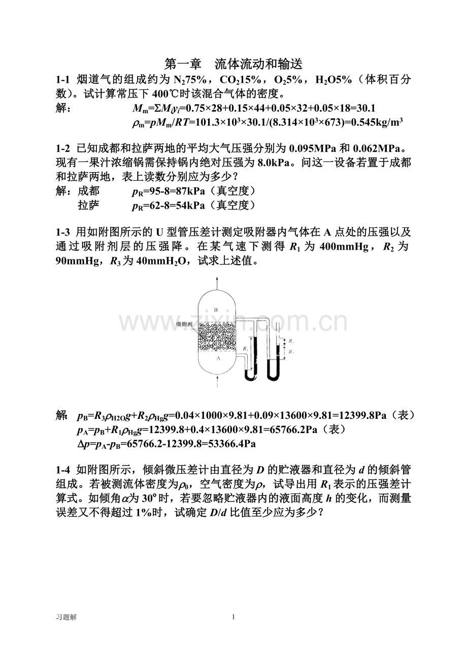 1-1 烟道气的组成约为N275%,CO215%,O25%,H2O5%(体积百分数)。试计算常压下400℃时该混合气体的密度。