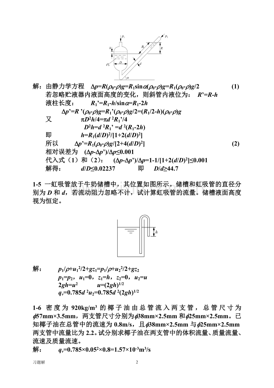 1-4 如附图所示,倾斜微压差计由直径为D的贮液器和直径为d的倾斜管组成。若被测流体密度为r0,空气密度为r,试导出用R1表示的压强差计算式。如倾角a为30º时,若要忽略贮液器内的液面高度h的变化,而测量误差又不得超过1%时,试确定D/d比值至少应为多少?