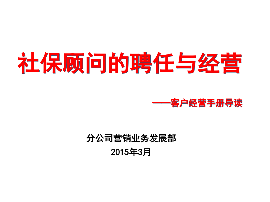 单击此处编辑母版标题样式,单击此处编辑母版文本样式,第二级,第三级,第四级,第五级,2015/3/25,#,单击此处编辑母版标题样式,单击此处编辑母版文本样式,第二级,第三级,第四级,第五级,2015/3/25,#,分公司,营销业务发展部,201,5,年3月,社,保顾问,的聘任与经营,客户经营手册导读,微,博:,要避免落入业绩零增长陷阱的关键是什么?尤其要弄清楚哪些是根本性的,是问题之源;哪些是表象性的,是问题之果。,对我们而言,,如果不在两件要事上认真扎实,不在两件要事上养成习惯,不在两件要事上攻克难关,那么就不会有三,大人力,真正的改善。到那时,零增长,就是我们的,命。,新增,留存,收入,客户,经营,客户经营为什么重要?,产能提升因素分析:,以同业为,例,某机构,本级,11,月份,1,月份,对比,在册,/,开单,16,人,/8,人,16,人,/16,人,/,保费,8.8,万,62.3,万,7.2,倍,开单人均产能,1.1,万,3.9,万,3.5,倍,2013年1月某同业本部,100,%,开单,且人均产能3.9万,较,2012,年,11,月总保费提升,7.2,倍,人均产能提升,3.5,倍。,他山之石可以攻玉,产能提升因素分析:,以,同业,为,例,某机构,本级,1,月份,社保顾问聘任量,62,人,聘任营销员数量,10,人,聘任营销员占比,66.6%,社保顾问转介绍保费,57,万,聘任营销员人均产能,5.7,万,产能提升的背后,是“影子部队”在冲锋陷阵!,2013,年,1,月,,某本,级共有,10,人累计聘请,62,位保险顾问,该,10,位业务员人均标保,57843,元,是另外,6,人人均保费的,7.7,倍,。,营销员聘请顾问占比及累计聘请数,有、无社保顾问产能对比,相差,6.7,倍,如何做好社保顾问,的经营,社会保险顾问三大平台(,体系,),第,6,页,礼品递送,开发平台,社会保险顾问聘任,一个目标,一次筛选,一次聘任,一次启动,一次表彰,积累平台,茶话会,一场活动,销售平台,个人品牌酒会,一场酒会,社会保险顾问体系解决的两个问题,是持续获得转介绍名单的问题;,新人空有资源却技能不足的问题。,思考一:如何,做好社保顾问的开发平台?,1,、启动,BM,TM,PTM/LC,聘任、经营,社保顾问,统一骨干思想,树立典范,普通客户,满意客户,忠诚客户,客户,分级体系,只有交易,没有交情,只有交情,没有推荐,既有交情,又有推荐,营销员通过深度客户经营,使得客户,不仅自己重复购买,并不断,推荐,亲近人购买。,营销员通过服务使客户满意,并,不断为自己和家人,加保,。,营销员与客户仅完成,一次交易,。,2、训练:客户分层,2、训练:列名单、画架构,二早,小组主管帮助每位组员列出自己的客户名单和架构图,.,客户,客户,客户,客户,客户,客户,客户,客户,客户,客户,客户,客户,客户,客户,客户,客户,客户,客户,客户,客户,客户,.,客户,客户,客户,客户,客户,架构图,列名单架构,图,寻找最,适合社,保,顾问,备注,:名单是泛举,可以是各式关系,客户经营第一步,:,选择名单,亲友会,的,成功,不断,告诉,我们,:成功,的关键在,事前筛选客户,!客户质量决定签单量,1、签过大单的客户(签大单),2,、为人热情的客户(签多单),3,、曾帮助转介绍,4,、企图心强,为人好,标 准,案例:,某,社,保顾问唐姐,是位公益红娘,,为人极为热情,,一共,为,某,经理,签单19件,而且这些客户马上会有孩子。平安的业务员,再打通,哪些医院护工,都没用,这些客户已经刀枪不入。”,2、训练:筛选准社保顾问,3、行动:开拓与追踪,井深没有长挖掘,哪来客户如涌泉,社保顾问是你叫了她就来,来了就转介绍的吗?所以与其叫邀约社保顾问,不如说是开拓社保顾问,开拓好了,不请自来。,认定准社保顾问,经常联系,不断见面,坚持送实用、小礼品(公司礼品logo)。,主管帮助伙伴圈定准社保顾问后,要,每周追踪,拜访、见面、送礼的次数、规格,二早集体讨论点评开拓情况。,1,、是邀约还是开拓?,3、追踪拜访、邀约成果,2、开拓准社保顾问的方法,4、聘任仪式:邀约与准备,聘任三部曲:开拓、邀约、仪式,参加,聘任仪式,邀约,开拓,1,2,3,聘任仪式,模式一:,业务员请客+职场聘任(省钱),模式二:,酒店聘任(酒会,模式,档次),会前准备:,1、,人的准备,:主管,、机构总会前,与业务员伙伴、准社保顾问进行沟通,了解准保险顾问的基本情况(包括年龄,家庭背景,人际关系,社会地位及工作经历)。使其明白保险顾问的权利与义务、奖励政策。,2、,物料准备,3、,人员安排,:主持人、领导发言、颁奖人、工作人员。,4、,流程安排,:,公司行业介绍(包含社保顾问政策),保险的意义与功用,表彰已有社保顾问(典范发言),启动方案与,积分奖励宣,导,聘任新社保顾问(目标宣誓),新任社保顾问代表发言,有奖竞猜(关于方案内容竞猜),游戏环节(暗示、时刻提醒参与社保顾问),4、聘任仪式:会中启动,1、营销员:与自己的社保顾问坐在一起,便于参与活动。,2、会中强调社保顾问启动方案,并现场订目标。(,承诺是一笔未还的债,),给客户做方案:“好报”才有,好人。,案例,:,某,顾问,已为,平安业务员介绍,10张单子。顾问说,“平安业务员说帮她介绍客户,成功后有好处,但都没有兑现!,”,【,舍得是一种能力,】,启动方案原则:,1、所有方案与外勤统一,2、费用不超过保费5,%,3,、每月可以套接总、分公司方案,。,4、聘任仪式:社保顾问积分系统,1、社会保险顾问排名采用积分制,积分获得方式如下表:,积分项目,标准,积分,提供建议,提供建议并采纳,10/条,介绍新人,介绍新人参加公司活动,10/人,引进新人,推荐新人并被我司录取,50/人,推荐客户,成功推荐新客户,30/人,2、作为下次聘任表彰