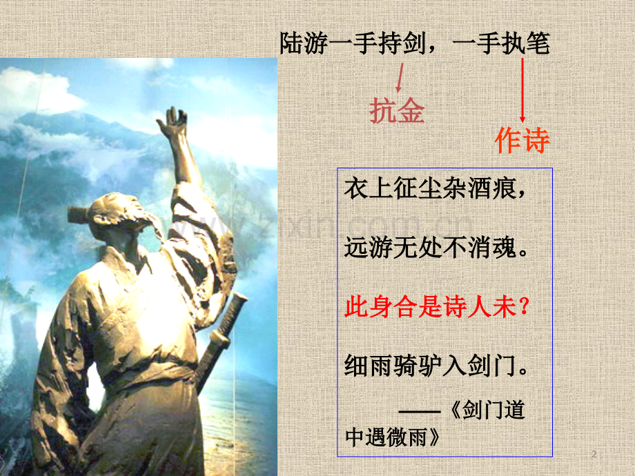 过小孤山大孤山过小孤山大孤山陆游陆游1陆游一手持剑,一手执笔陆游一手持剑,一手执笔抗金抗金作诗作诗衣上征尘杂酒痕,衣上征尘杂酒痕,远游无处不消魂。远游无处不消魂。此身合是诗人未?此身合是诗人未?细雨骑驴入剑门。细雨骑驴入剑门。剑门道剑门道中遇微雨中遇微雨 2陆游与梅花陆游与梅花 陆游号放翁,一生酷爱梅花陆游号放翁,一生酷爱梅花,咏梅之诗多至百余首,且认,咏梅之诗多至百余首,且认为只有节义之士,脱俗之笔才为只有节义之士,脱俗之笔才配得上题咏梅花。他在配得上题咏梅花。他在梅花梅花绝句十首绝句十首中说到:子欲作梅中说到:子欲作梅诗,当造幽绝境。笔端有纤尘,诗,当造幽绝境。笔端有纤尘,只恐梅未肯。陆游爱梅之甚,只恐梅未肯。陆游爱梅之甚,到了痴迷的程度,竟盼望能分到了痴迷的程度,竟盼望能分身而遍赏天下之梅:何方可化身而遍赏天下之梅:何方可化身千亿,一树梅花一放翁。身千亿,一树梅花一放翁。3写作背景:写作背景:陆游主张抗金,恢复中原,被罢陆游主张抗金,恢复中原,被罢官。至官。至11691169年,起用为夔州通判,由年,起用为夔州通判,由故乡山阴(今浙江绍兴)出发赴任。故乡山阴(今浙江绍兴)出发赴任。一路沿长江一路沿长江逆流逆流而上,历尽两岸奇山而上,历尽两岸奇山异景。途中作者以异景。途中作者以日记日记纪行,集成纪行,集成日日记体游记记体游记入蜀记入蜀记,以记其胜。,以记其胜。过小孤山大孤山过小孤山大孤山是作者是作者路过路过小孤小孤山和大孤山山和大孤山时所写的两则日记。时所写的两则日记。4 小孤山山周里许,高达一百余米。山上竹木郁小孤山山周里许,高达一百余米。山上竹木郁郁葱葱,山下江水滔滔滚滚。海潮至郁葱葱,山下江水滔滔滚滚。海潮至 此,不复而此,不复而 上,故有上,故有“海海 门第一关门第一关”之之 称。称。写作背景二写作背景二5 大孤山,其状如鞋,俗称鞋山。民间传说大孤山,其状如鞋,俗称鞋山。民间传说此名为玉女大姑在云中落下的秀鞋变化而成,此名为玉女大姑在云中落下的秀鞋变化而成,因而又名大姑山。因而又名大姑山。是两百万年前第四是两百万年前第四纪冰川时期形成的纪冰川时期形成的小岛。大禹曾在此小岛。大禹曾在此山岩刻石记功,唐山岩刻石记功,唐时建有大姑庙。时建有大姑庙。写作背景三写作背景三6矶矶 j燧燧 su窦窦 du潦潦 lo巉巉 ch n上干云霄上干云霄 gn榭榭 xi鹘鹘 h抟抟 tu n蠡蠡 l葭葭 ji赪赪 chng湓湓 pn汲汲 j7小孤山:小孤山:位位于于安安徽徽省省宿宿松松县县境境内内长长江江中中,每每年年汛汛期期时时四四面面环环水水,孤孤峰峰如如柱柱,兀兀立立大大江江,有有“长江绝岛长江绝岛”、“长江天柱长江天柱”之称。之称。8 迎迎山山而而上上胜胜迹迹迭迭(di(di)出出,启启秀秀寺寺、一一天天门门等等十十余余处处景景点点,每每一一景景点点都都有有其其雅雅观观和和民民间间传传说说,并并镌镌有有历历代代名名人人的的匾匾额额和雅士墨客之碑文。和雅士墨客之碑文。9小姑,乃民间传说中一位纯情小姑,乃民间传说中一位纯情美丽的少女,她与彭郎相爱,美丽的少女,她与彭郎相爱,但终难成眷属,于是投江殉情,但终难成眷属,于是投江殉情,死后化作秀姿超然的小孤山,死后化作秀姿超然的小孤山,又名又名“小姑山小姑山”。彭郎因悲于。彭郎因悲于小姑之死,遂化作石矶,立于小姑之死,遂化作石矶,立于江边,即江边,即“彭浪矶彭浪矶”,亦名,亦名“彭郎矶彭郎矶”。10大孤山:大孤山:在在鄱鄱p p阳阳湖湖上上,其其状状如如鞋鞋,俗俗称称鞋鞋山山。民民间间传传说说此此名名为为玉玉女女大大姑姑在在云云中中落落下下的的绣绣鞋鞋变变化化而而成成,因因而而又名大姑山。又名大姑山。11大孤山大孤山12理清作者的行踪理清作者的行踪过烽火矶过烽火矶过彭浪矶、小孤山过彭浪矶、小孤山遂行泛彭蠡口遂行泛彭蠡口始见庐山及始见庐山及大孤山大孤山晚抵江州,泊湓浦晚抵江州,泊湓浦 13 八月一日,过烽火矶八月一日,过烽火矶。南朝自武昌至京口,。南朝自武昌至京口,列置烽燧,此山当列置烽燧,此山当是是其其一也。自舟中望山,突一也。自舟中望山,突兀而已。及抛江过其下,兀而已。及抛江过其下,嵌嵌岩岩窦窦穴,怪奇万状,穴,怪奇万状,色泽莹润,亦与它石迥色泽莹润,亦与它石迥异。又有一石,不附山,异。又有一石,不附山,杰然特杰然特起,高百余尺,起,高百余尺,丹藤翠蔓丹藤翠蔓,罗络其上,罗络其上,如宝装屏风。如宝装屏风。是是日风静,日风静,舟行舟行颇迟颇迟,又秋深,又秋深潦缩潦缩,故得尽见,杜老所谓故得尽见,杜老所谓“幸有舟楫迟,得尽所历幸有舟楫迟,得尽所历妙妙”也。也。八月一日,(船)经过烽火矶。八月一日,(船)经过烽火矶。南朝以来,从武昌(今鄂城)南朝以来,从武昌(今鄂城)到京口,都设置了很多(报警到京口,都设置了很多(报警的)烽火台,这座山应该的)烽火台,这座山应该是是其其中之一。从船上看山,只是见中之一。从船上看山,只是见到高耸(的山峰)罢了。等到到高耸(的山峰)罢了。等到抛锚停船后,(我)走过山下,抛锚停船后,(我)走过山下,(看到)裂缝的岩石和各式洞(看到)裂缝的岩石和各式洞穴,奇形怪状,色彩光亮润泽,穴,奇形怪状,色彩光亮润泽,也和别的石头不大