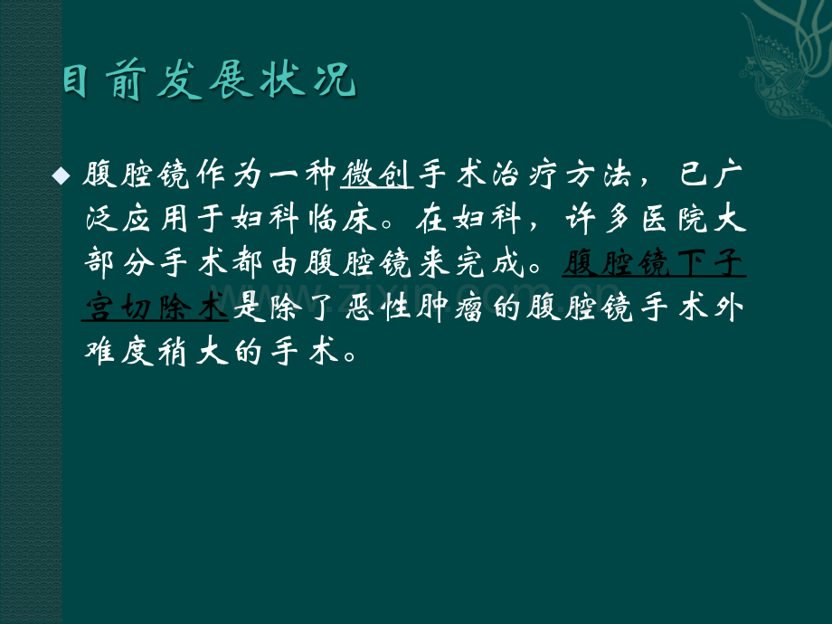 腹腔镜下子宫切除术 目前发展状况u腹腔镜作为一种微创手术治疗方法,已广泛应用于妇科临床。在妇科,许多医院大部分手术都由腹腔镜来完成。腹腔镜下子宫切除术是除了恶性肿瘤的腹腔镜手术外难度稍大的手术。优势特点 腹腔镜手术 开腹手术术后伤口疼痛 轻微 剧痛腹部美观 3-4个小记号 10cm疤痕住院天数 5天 8天回复工作 7-10天 28-42天盆腔粘连少于经腹手术、保持了盆底组织结构和盆腔粘连少于经腹手术、保持了盆底组织结构和功能的完整性。功能的完整性。手术适应症u1.子宫多发性肌瘤、子宫腺肌症u2.子宫肌瘤合并子宫内膜良性病变(功血)或不典型增生u4.子宫肌瘤合并宫颈良性病变或癌前病变手术禁忌症u子宫的大小:较适当的子宫大小为12-14周以内。u粘连的程度:若致密粘连包裹重要脏器(如输尿管、肠管),造成分离困难,则选择开腹手术更安全。腹腔镜下子宫全切除术u在腹腔镜下切断子宫周围的血管、韧带及阴道壁等组织u切除后的子宫自阴道取出u腹腔镜下缝合阴道残端手术方式u1.腹腔镜下子宫次全切除术(LSH)u2.腹腔镜下辅助阴式子宫切除术(LAVH)u3.腹腔镜下全子宫切除术(TSH)u4.腹腔镜下筋膜内子宫切除术(CISH)手术方式分类目前,腹腔镜子宫切除术已趋于成熟,国际上有很多腹腔镜切除子宫的分类方法,现尚未统一标准,按照应用腹腔镜的目的及子宫切除的方式可分为:腹腔镜辅助的阴式子宫切除术(laparoscopic assisted vaginal hysterectomy,LAVH)是指阴式子宫切除术中经阴道完成困难的步骤在腹腔镜下完成。腹腔镜全子宫切除术(total laparoscopic hysterectomy,TLH)是指切除子宫的所有步骤均在腹腔镜下完成。子宫自盆腔游离后可经阴道取出,或经碎块后自腹部取出。阴道残端的缝合既可在腹腔镜下完成,也可经阴道完成。腹腔镜次全子宫切除术(laparoscopic subtotal or supracervical hysterectomy,LSH)是指在腹腔镜下切除子宫体,保留子宫颈的手术。腹腔镜筋膜内子宫切除术(laparoscopic intrafascial hysterectomy,LIH)是指游离子宫体后,宫颈峡部以下的操作在子宫颈筋膜内进行的子宫切除术。手术准备及配合术前准备:心理护理术前一天手术室护士到病房探视病人,对病人进行术前指导及心理护理,了解病人心理反应及健康需求。有针对性简单介绍女性生殖系统的解剖和生理功能,以及该手术的优点及可能发生的并发症,帮助病人正确客观地认识腹腔镜手术的安全性及风险性,让病人解除紧张恐惧心理,主动积极配合手术。准备腹腔镜器械,气腹穿剌针、单极钩、单极铲、双极电凝、无损伤钳、分离钳、剪刀、大小戳克(10mm、5mm)一套、持针器、举宫器、0内镜,吸引器、冲洗管,CO2气腹管、单极线、双极线、超声刀等,还需准备常规开腹手术器械。巡回护士配合巡回护士提前进入手术间调好室内温湿度,检查腹腔镜各仪器性能是否良好,调节手术灯。病人入室仔细核对后,为其建立静脉通道。麻醉诱导后为病人取膀胱截石位,双腿弯曲固定于腿托支架上,腿托托住小腿,注意避免神经、血管受压,腿托高度以病人仰卧曲髋时高度相等,双腿分开程度约8090,病人双肩用肩托加海棉垫固定,因术中需取头低脚高位,以防下滑。将电凝器负极板稳妥固定于患者肌肉丰厚处,身体各部位不得与任何金属接触,防止灼伤病人皮肤。手术开始后,配合洗手护士将各管道、导线、光纤准确接于相应主机系统上,调节好各仪器工作参数,并严密观察病情及手术进行情况。洗手护士配合洗手护士提前1520分钟洗手,整理好器械桌。协助医生消毒铺敷,与巡回护士连接各管道及导线,并清点器械纱布数目。建立气腹传递手术刀及气腹针,于病人脐部作10mm切口,气腹针穿刺进腹后,注入CO2气体,进立气腹后,用10mm戳克沿切口穿刺进腹作为观察孔置入内镜,在内镜直视下根据手术操作需要置3个5mm戳克(左侧两个,右侧一个)作为辅助操作孔。举宫器于阴道置入子宫,协助切除子宫。洗手护士根据手术步骤依次传递腔镜器械,先断其子宫各韧带及血管,如有出血,可用双极电凝止血。断完韧带和血管后,将子宫自阴道取出,之后用1/0可吸线,持针器缝扎宫颈残端(也可经阴道用1/0可吸线缝扎宫颈残端)。生理盐水冲洗创面进行彻底止血,手术结束关闭气腹机停止充气,并排尽腹内CO2气体,清点器械纱布后用皮针缝合穿刺孔,贴上敷贴,术中切下标本交由巡回护士妥善保管。相关手术步骤1.用双极电凝凝断圆韧带、输卵管、卵巢及固有韧带注意:u短时间接触多次电凝,减少热辐射u不要凝固过深致使碳化,易脱痂后出血u电凝带稍宽,防止子宫收缩后血管扩张出血2、处理阔韧带辨认子宫血管电凝切断阔韧带,暴露子宫动电凝切断阔韧带,暴露子宫动脉上行支脉上行支u切断阔韧带前叶至反折腹膜切断阔韧带前叶至反折腹膜u电凝切断阔韧带后叶至骶韧电凝切断阔韧带后叶至骶韧带附着处带附着处u尽量电凝切断子宫血管周围尽量电凝切断子宫血管周围的结缔组织,游离出子宫动脉的结缔组织,游离出子宫动脉3、打开子宫膀胱反折腹膜剪开膀胱腹膜反折,分离反折腹膜和子宫剪开膀胱腹膜反折,分离反折腹膜和子宫峡部之间间隙峡部之间间隙u分离过程中尽量减少出血,如有渗血及分离过程中尽量减少出血,如有渗血及时电凝止血,可用吸引器下推膀胱时电凝止血,可用吸引器下推膀胱u分离膀胱与子宫、宫颈与阴道上端连接分离膀胱与子宫、宫颈与阴