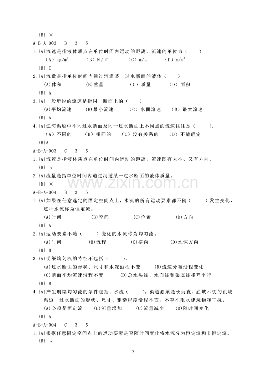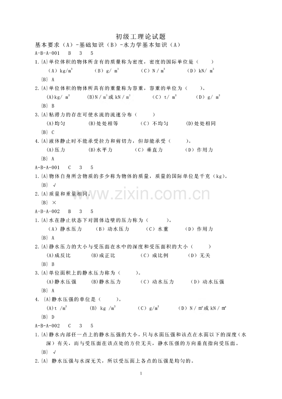 初级工理论试题基本要求(A)-基础知识(B)-水力学基本知识(A)A-B-A-001 B 3 5L A单位体积的物体所含有的质量称为密度,密度的国际单位是()(A)kg/m3(B)g/m3(C)N/m3(D)kN/m3B A2.A单位体积的物体所具有的重量称为容重,容重的单位为()。(A)kg/m3(B)N/或 kN/(C)t/m3(D)g/m3B B3.A粘滞力的存在可使水流的流速分布()(A)均匀处处相等(C)不均匀(D)处处相同B C4.A液体静止时不能承受拉力和剪切力,但却能承受()0(A)压力(B)水平力(C)垂直力(D)作用力B AA-B-A-001 C 3 51.A物体自身所含物质的多少称为物体的质量,质量的国际单位是千克(kg)。B V2.A质量和重量相同。B XA-B-A-002 B 3 51.A水在静止状态下对固体边壁的压力称为()0(A)静水压力(B)动水压力(C)水重(D)作用力B A2.A静水压力的大小与受压面在水中的深度和受压面积的大小()(A)成反比(B)成正比B B3.A单位面积上的静水压力称为(A)静水压强(B)静水压力 B A4.A静水压强的单位是()。(A)t/m3(B)kg/m3B D(C)成比例)o(C)动水压力(D)无关(D)动水压强(C)g/m3(D)N/或 kN/m2A-B-A-002 C 3 5L A静水内部任一点上的静水压强的大小,只与水面压强和该点在水面以下的深度(水 深)有关,而与受压面在该点处的方位无关,静水压强的方向垂直指向受压面。B V2.A静水压强与水深无关,所以受压面上各点的压强是均匀的。1B XA-B-A-003 B 3 5L A流速是指液体质点在单位时间内运动的距离,流速的单位为()(A)kg/m3(B)N/m2(C)m/s(D)m/s2B C2.A流量是指单位时间内通过河道某一过水断面的液体()(A)体积(B)重量(C)质量(D)面积B A3.A一般所说的流速是指同一断面上的()(A)平均流速(B)最小流速(C)水面流速(D)最大流速B A4.A江河渠道中不同过水断面及同一过水断面上不同点的流速往往是()。(A)不同的(B)相同的(C)没有关系的(D)不能确定BAA-B-A-003 C 3 51.A流速是指液体质点在单位时间内运动的距离,流速既有大小、又有方向。B V2.A流量是指单位时间内通过河道某一过水断面的液体质量。B XA-B-A-004 B 3 51.A如果在任意选定的固定空间点上,水流的所有运动要素都不随()发生变化,这种水流称为恒定流。(A)时间(B)空间(C)位置(D)方向B A2.A运动要素不随()变化的水流称为均匀流。(A)时间(B)流程(C)横向(D)水深方向B B3.A明渠均匀流的特征不包括()。(A)过水断面的形状、尺寸和水深沿程不变(B)流速分布沿程变化(C)断面平均流速沿程不变(D)总水头线、水面线和渠底线相互平行B B4.A产生明渠均匀流的条件包括:水流(),渠道必须是长而直、底坡不变的正坡渠道,过水断面的形状、尺寸、粗糙程度沿程不变,不存在阻水建筑物和干扰。(A)必须是恒定流(B)流量增加(C)流量减少(D)随时间变化B AA-B-A-004 C 3 5L A根据任意固定空间点上的运动要素是否随时间变化将水流分为恒定流和非恒定流。B V22.A根据液体运动要素是否随流程变化将水流分为均匀流与非均匀流。B V基本要求(A)-基础知识(B)-土力学基本知识(B)A-B-B-001 B 3 5B C1.A土是由岩石经过长期风化、剥蚀、搬运、沉积而成的()0(D)凝固体(A)胶结体B C(B)化合体(C)散粒体2.A 土由固体、液体和气体三相组成,固相构成土的(),对土的性质起着决定性作用。(A)支架(B)骨架(C)框架(D)空格B B3.A若土骨架孔隙中同时存在水和气体则为()0(A)饱和土(B)湿土(C)干土(D)粘土B4.A若土骨架孔隙中全由气体充填则为()o(A)饱和土(B)湿土(C)干土(D)粘土A-B-B-001 C 3 51.A土的固相主要是矿物颗粒,矿物颗粒分为原生矿物和次生矿物,原生矿物为岩石受 物理风化作用而生成的颗粒,次生矿物为岩石受化学风化作用而生成的颗粒。B V2.A固相(土颗粒)构成土的骨架,土骨架孔隙中被水或气体所充填,水或气体对土的 性质起着决定性作用。B XA-B-B-002 B 3 51.A天然状态下,土体中所含水的重量与干土重量之比称为()o(A)最优含水量(B)最大含水量(C)最小含水量(D)天然含水量B D2.A单位体积土体所具有的质量称为()。(A)土的密度(B)比重(C)容重(D)重量B A3.A单位体积土体中土粒所具有的质量称为()。(A)颗粒重量(B)比重(C)土的干密度(D)干容重B C4.A单位体积干土所受到的重力(重量)称为()。(A)干容重(B)颗粒重量(C)干密度(D)比重B AA-B-B-002 C 3 531.A干密度和干容重的单位不同、数值大小不同,都能反映土的密实情况。B V2.A干密度和干容重都能反映土的密实情况,土越密实,干密度或干容重越大,所以干 密度和干容重是一个概念。B XA-B-B-003 B 3 51.A随着含水率的增高,粘性土可能呈现固态、半固态、()和流动状态。(A)坚硬(B)较硬(C)稀软(D)可塑状态B D2.A粘性土从一个稠度状态过渡到另一个稠度状态时的分界含水率称为()。(A)天然含水率(B)最优含水率(C)界限含水率(D)最大含水率B C3.A粘性土的界限含水率有固态与半固态的缩限、半固态与塑态的()、塑态与流态的液限。(A)缩限 液限(C)塑性(D)塑限B D4.A液限与塑限之差称为粘性土的塑性指数,塑性指数越大,粘土的()越好。(A)硬度(B)塑性(C)密度(D)脆性B BA-B-B-003 C 3 51.A塑性指数越大,粘土的塑性变化范围越大、土的塑性越好、粘性越大。B V2.A粘性土所呈现的固态、半固态、可塑状态和流动状态与含水率无关。B XA-B-B-004 B 3 51.A密实的砂土结构稳定、强度较高、压缩性较小,疏松的砂土()o(A)强度较高(B)压缩性小(C)孔隙比小(D)易产生流砂或震动液化B D2.A可用孔隙比判别无粘性土的密实状态,孔隙比越小土越()。(A)疏松(B)密实(C)易压缩(D)强度低B B3.A可用相对密实度判别无粘性土的密实状态,相对密实度是将()孔隙比与最疏松状态的孔隙比和最密实状态的孔