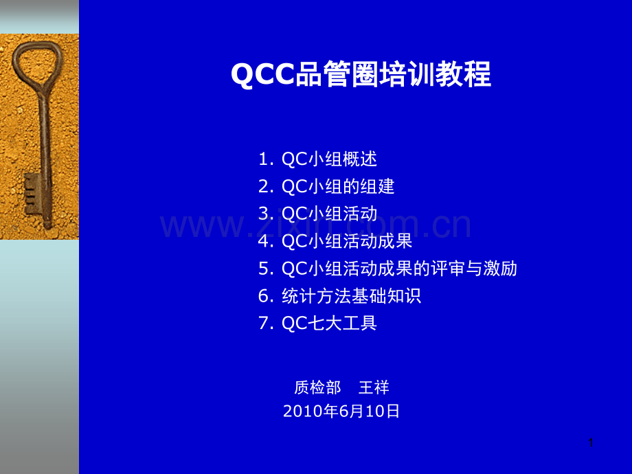 QCC品管圈培训教程品管圈培训教程1.QC小组概述2.QC小组的组建 3.QC小组活动 4.QC小组活动成果 5.QC小组活动成果的评审与激励6.统计方法基础知识 7.QC七大工具质检部 王祥2010年6月10日1第一章第一章 QCQC小组概述小组概述第一节第一节 质量与质量管理质量与质量管理第二节第二节 QCQC小组的要领与分类小组的要领与分类 第三节第三节 QCQC小组活动的宗旨和作用小组活动的宗旨和作用 2/1262第一节第一节 质量与质量管理质量与质量管理一 质量的概念GB/T1900-2000 idt ISO9000:2000给出质量的定义是:一组固有特性满足要求的程度。3/1263二 质量管理 质量管理的发展,按照解决质量问题所依据的手段和方式来划分,大致经历了三个阶段:第一个阶段是质量检验阶段;第二个阶段是统计质量控制阶段;第三个阶段是全面质量管理阶段,大约是从50年代末、60年代初期至今。GB/T 1900-2000 idt ISO9000:2000质量管理体系基础和术语中写道:质量管理(QM)是在质量方面指挥和控制组织的协调的活动。4/1264全面质量管理的特点:(1)以顾客为中心;(2)全员参加的质量管理;(3)全过程的质量管理;(4)运用多种科学方法的质量管理;(5)强调持续改进。5/1265三 开展全面质量管理与实施ISO9000族标准的关系两者是静态和动态、基础和发展的关系。6/1266第二节第二节 QCQC小组的概念与分类小组的概念与分类一一 QCQC小组的概念小组的概念 在生产或工作岗位上从事各种劳动的职工,在生产或工作岗位上从事各种劳动的职工,围绕企业的经营战略、方针目标和现场存在的问围绕企业的经营战略、方针目标和现场存在的问题,以改进质量、降低消耗、提高人的素质和经题,以改进质量、降低消耗、提高人的素质和经济效益为目的组织起来,运用质量管理的理论和济效益为目的组织起来,运用质量管理的理论和方法开展活动的小组。方法开展活动的小组。7/1267二二 QCQC小组的性质和特点小组的性质和特点(一)(一)QCQC小组的性质小组的性质 QC QC小组是企业中群众性质量管理小组是企业中群众性质量管理活动的一种有效的组织形式,是职工活动的一种有效的组织形式,是职工参加企业民主管理的经验同现代科学参加企业民主管理的经验同现代科学管理方法相结合的产物。管理方法相结合的产物。QCQC小组同企小组同企业中的行政班组、传统的技术革新小业中的行政班组、传统的技术革新小组有所不同。组有所不同。8/1268(二)(二)QCQC小组的特点小组的特点1 1明显的自主性明显的自主性2 2广泛的群众性广泛的群众性3 3高度的民主性高度的民主性4 4严密的科学性严密的科学性9/1269三三 QCQC小组的分类小组的分类(一)现场型(一)现场型QCQC小组小组(二)服务型(二)服务型QCQC小组小组(三)(三)“攻关型攻关型”QCQC小组小组(四)管理型(四)管理型QCQC小组小组10/12610第三节第三节 QCQC小组活动的宗旨和作用小组活动的宗旨和作用 一 QC小组活动的宗旨(一)提高职工素质,激发职工的积极性和创造性(二)改进质量,降低消耗,提高经济效益(三)建立文明的、心情舒畅的生产、服务、工作现场11/12611日本企业普遍开展的“5S”活动,是:整理(SEIRI):将现场需要的东西与不需要的东西分开,把不必要的东西处理掉。整顿(SEITON):把要用的东西,根据使用频度分别放置,使常用的东西能及时、准确地取出,保持必要时马上能使用的状态和谁都能了解的状态。清扫(SEISO):去除现场的脏物、垃圾、污点,经常清扫、检查,形成制度,采取根治污物的对策。12/12612清洁(SEIKETSU):企业、现场、岗位、设备时时保持干净状态,保持环境卫生。素养(SHITSUKE):要加强修养,美化身心,做到心灵美、行为美。人人养成良好的习惯,自学遵守和执行各种规章制度和标准。13/12613二 QC小组活动的作用(1)有利于开发智力资源,发掘人的潜能,提高人的素质;(2)有利于预防质量问题和改进质量;(3)有利于实现全员参加管理;(4)有利于改善人与人之间的关系,增强人的团结协作精神;(5)有利于改善和加强管理工作,提高管理水平;(6)有助于提高职工的科学思维能力、组织协调能力、分析与解决问题的能力,从而使职工岗位成才;(7)有利于提高顾客的满意程度。14/12614第二章第二章 QCQC小组的组建小组的组建第一节 组建QC小组的原则第二节 QC小组的成员及对其要求第三节 QC小组组建程序与注册登记 15/12615一、自愿参加、上下结合二、实事求是,灵活多样第一节 组建QC小组的原则16/12616第二节 QC小组的成员及对其要求一 QC小组组长的职责及对其要求(1)抓好QC小组的质量教育;(一)QC小组组长的职责(2)制定小组活动计划,按计划组织好小组活动;(3)做好QC小组的日常管理工作。17/12617(二)对QC小组组长的要求(1)是推行全面质量管理的热心人;(2)业务知识较丰富;(3)具有一定的组织能力。18/12618二、对QC小组组员的要求(1)应根据QC小组活动计划安排按时参加活动,在活动中积极发挥自己的聪明才智和特长;(2)按时完成小组分配的任务。19/12619第三节 QC小组组建程序与注册登记 一、QC小组组建程序(一)自下而上的组建程序(二)自上而下的组建程序(三)上下结合的组建程序20/12620二、QC小组的人数 小组人数一般以310人为宜。21/12621三、QC小组的注册登记 注册登记表由企业QC小组活动主管部门负责发放、登记编号和统一保管。QC小组的注册登记每年进行一次。22/12622第三章第三章 QCQC小组活动小组活动第一节 Q