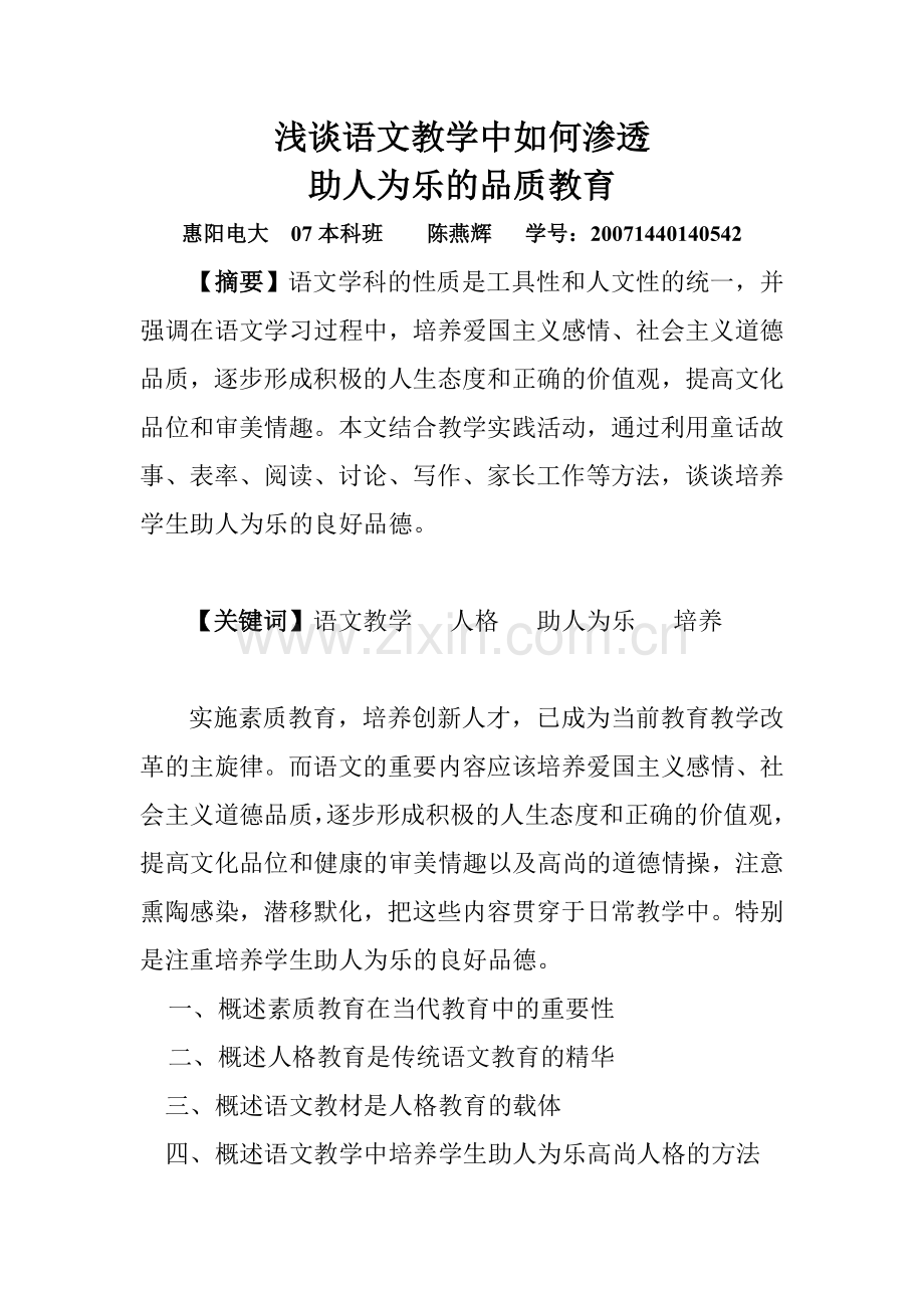 实施素质教育,培养创新人才,已成为当前教育教学改革的主旋律。而语文的重要内容应该培养爱国主义感情、社会主义道德品质,逐步形成积极的人生态度和正确的价值观,提高文化品位和健康的审美情趣以及高尚的道德情操,注意熏陶感染,潜移默化,把这些内容贯穿于日常教学中。特别是注重培养学生助人为乐的良好品德。