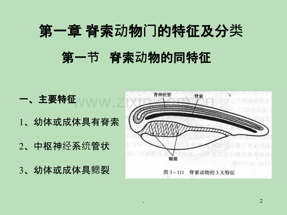 脊椎脊椎动物物生 物 奥赛 辅 导宇文延青1.第一章第一章 脊索脊索动物物门的特征及分的特征及分类 第一第一节 脊索脊索动物的同特征物的同特征 一、主要特征一、主要特征1、幼体或成体具有脊索2、中枢神经系统管状3、幼体或成体具鳃裂2.二、次要特征 1 1、肛后尾、肛后尾(利于水中运(利于水中运(利于水中运(利于水中运动动)2 2、心、心脏位于消化道腹面位于消化道腹面 3、闭管式循环(尾索动物除外)4、内骨骼 5、后口 6、分节的肌节3.三、脊索与无脊椎动物的主要区别脊索脊索脊索脊索 背神背神背神背神经经管管管管 咽咽咽咽鳃鳃裂裂裂裂肛后尾肛后尾心心脏位于消化道腹面位于消化道腹面肌肉含肌酸(肌肉含肌酸(无脊椎无脊椎无脊椎无脊椎动动物一般物一般物一般物一般为为精氨酸,精氨酸,精氨酸,精氨酸,棘皮和半棘皮和半棘皮和半棘皮和半索索索索动动物物物物为为精氨酸精氨酸精氨酸精氨酸+肌酸肌酸肌酸肌酸)4.第二节 脊索动物门的分类 现存4万多种,分为2大类群,3个亚门。尾索尾索动物物亚门 头索索动物物亚门 脊椎脊椎动物物 有有头类 脊椎脊椎动物物亚门原索原索动物物 无无头类无真正的无真正的头和和脑脊索脊索渐被脊柱取代,被脊柱取代,脑和感官集中于前端,和感官集中于前端,形成明形成明显头部部。5.6.第二章第二章 皮肤及其衍生物皮肤及其衍生物一、皮肤的一、皮肤的结构和机能构和机能1 皮肤的机能皮肤的机能 保保护、感、感觉、分泌、分泌、调节体温、排泄、体温、排泄、储藏养料、呼吸、运藏养料、呼吸、运动 7.2 结构构表皮:外胚表皮:外胚层真皮:中胚真皮:中胚层衍生物衍生物表皮衍生物表皮衍生物真皮衍生物真皮衍生物外骨骼:角外骨骼:角质鳞、羽、毛、喙、爪、羽、毛、喙、爪、蹄、指(趾)甲、虚角蹄、指(趾)甲、虚角腺体:皮脂腺、粘液腺、汗腺、乳腺、臭腺腺体:皮脂腺、粘液腺、汗腺、乳腺、臭腺骨骨质鳞、鳍条、骨板、条、骨板、实角角8.二、各二、各纲比比较1 文昌文昌鱼 表皮为单层柱状上皮,内有单细胞腺和感觉细胞,外有一层表皮分泌的角质层。真皮由胶状结缔组织组成2 圆口口类 表皮由多层上皮细胞组成,最表层的细胞也是具有核的活细胞,细胞间有单细胞腺。真皮为有规则排列的结缔组织,内含胶元纤维和弹性纤维9.3 鱼类 表皮和真皮都为多层细胞组成,以单细胞腺体为主,包含少数多细胞腺,腺体多为黏液腺。有四种类型的鳞片:盾鳞(来源于表皮和真皮)、硬鳞(源于真皮)、圆鳞和栉鳞(源于真皮)4 两栖两栖类 仅表皮的12层细胞开始角质化,但细胞核仍存在。真皮厚而致密,内有大量多细胞黏液腺,皮下层有大的淋巴间隙和丰富的毛细血管网10.5 爬行爬行类 表皮明显分为角质层和生发层,角质层有了特化的角质鳞;蜕皮现象明显,表皮衍生物出现了爪。真皮较薄,有些种类还有真皮骨板6 鸟类 表皮薄而柔软,有羽的地方,角质层很薄;在无羽的腿、脚部有角质鳞,鸟类的皮肤衍生物主要为羽。真皮薄,没有真皮衍生物,只具尾脂腺11.7 哺乳哺乳类 皮肤厚而坚韧,真皮非常发达,皮下组织也很发达。毛为哺乳动物所特有,为表皮衍生物。另外还有爪、蹄、甲、角等表皮衍生物。皮肤腺非常发达,来源于表皮的生长层,多细胞腺,包括皮脂腺、汗腺、乳腺和臭腺。鹿角是真皮衍生物12.三、三、变化化趋势1 表皮表皮 由由单层细胞(文昌胞(文昌鱼)到多)到多层细胞(胞(圆口口类以上);以上);由不角由不角质化(化(圆口口类、鱼类)经过轻微角微角质化(两栖化(两栖 类)过渡到高度角渡到高度角质化化2 真皮真皮 由薄(无羊膜由薄(无羊膜类)到厚(羊膜)到厚(羊膜类,鸟类除外)除外)3 外骨骼外骨骼 由水栖由水栖鱼类的骨的骨质鳞到羊膜到羊膜类的角的角质鳞4 腺体腺体 由由单细胞腺到多胞腺到多细胞腺胞腺13.第三章第三章 骨骼系骨骼系统一、机能一、机能 供肌肉附着、支持、保供肌肉附着、支持、保护、造血、造血 协助助维持持钙磷代磷代谢平衡平衡二、二、结构构 骨膜、骨密骨膜、骨密质、骨松、骨松质、骨髓腔、骨髓腔三、硬骨的来源三、硬骨的来源 软骨原骨骨原骨 膜原骨膜原骨14.四、组成中中轴骨骼骨骼附肢骨骼附肢骨骼头骨骨脊柱脊柱 椎体椎体类型型肋骨肋骨胸骨胸骨带骨骨肢骨肢骨肩肩带腰腰带前(上)肢骨前(上)肢骨后(下)肢骨后(下)肢骨鳍骨骨双凹型椎体双凹型椎体(鱼类、有尾两栖、有尾两栖类、少数爬行、少数爬行类)前凹型椎体前凹型椎体(多数无尾(多数无尾类、多数爬行、多数爬行类、和、和鸟类的第一的第一颈椎)椎)后凹型椎体后凹型椎体(多数(多数蝾螈和一部分无尾螈和一部分无尾类)马鞍型椎体鞍型椎体(鸟类颈椎)椎)双平型椎体双平型椎体(哺乳(哺乳类)15.1 头 骨骨 包括包括脑颅和咽和咽颅。(1)咽)咽颅软骨骨鱼:由七:由七对软骨弓骨弓组成。成。颌弓:弓:1对,形成上下,形成上下颌。(由。(由2对4块软骨构成)骨构成)腭方腭方软骨:在背面左右骨:在背面左右2块,形成上,形成上颌。麦氏麦氏软骨:在腹部左右骨:在腹部左右2块,形成下形成下颌。舌弓:舌弓:1对。支持舌部。支持舌部。(由(由3对6块软骨构成)骨构成)基舌基舌软骨骨 组成成 角角鳃软骨骨 舌舌颌软骨骨鳃弓:弓:5对。支持。支持鳃。16.硬骨硬骨鱼咽咽颅颌弓弓上上颌前前颌骨骨颌骨骨下下颌齿骨骨