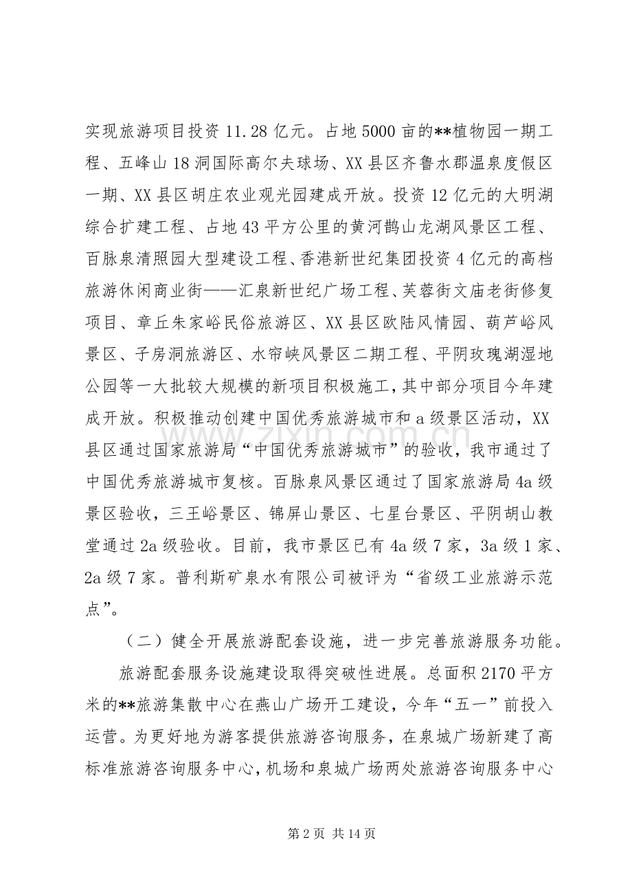 20xx年是深入落实科学发展观、扎实推进社会主义和谐社会建设的重要一年,是我市旅游业发展的重要战略提升期,面临着新的发展机遇和挑战。我们将继续深入贯彻全省旅游发展大会精神,积极响应国家旅游局提出的“中国和谐城乡游”主题,整合我市旅游资源,促进全市旅游业又好又快地发展。20xx年全市旅游工作的指导思想是:以邓小平理论和“三个代表”重要思想为指导,全面贯彻十六届六中全会精神,深入落实科学发展观,以“泉城和谐城乡游”为主题,以提升“泉水之都”旅游品牌为核心,以深入开发旅游资源为重点,进一步完善旅游服务设施,提高旅游产业素质,加强国内外市场促销,加强旅游市场治理,开拓创新,求真务实,努力构建泉城和谐旅游。20xx年计划指标是:全年接待旅游者20xx万人(次),实现旅游总收入177亿元,同比分别增长16%和21%,其中接待入境旅游者16万人次,旅游创汇6330万美元,同比分别增长17.6%和19%。为实现上述目标,重点抓好以下工作: