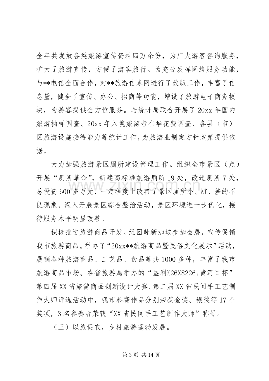 20xx年是实施“十一五”规划的重要一年,全市旅游系统坚持科学发展观,认真贯彻落实全省旅游发展大会精神,遵照市政府“发展大旅游,开拓大市场,构筑大产业”的总体思路,重点开发大项目,开展大活动,开拓大市场,积极推进旅游业和谐发展。我局被评为“全省旅游系统先进集体”,标志着各项工作提高到了新的水平。20xx年全市接待旅游者1720.6万人次,比去年增长17.6%,实现旅游总收入146.3亿元,比去年增长19.9%,其中,接待入境旅游者13.6万人次,比去年增长13.1%,实现旅游外汇收入5317.9万美元,比去年27.9%,超额完成了年度工作计划。