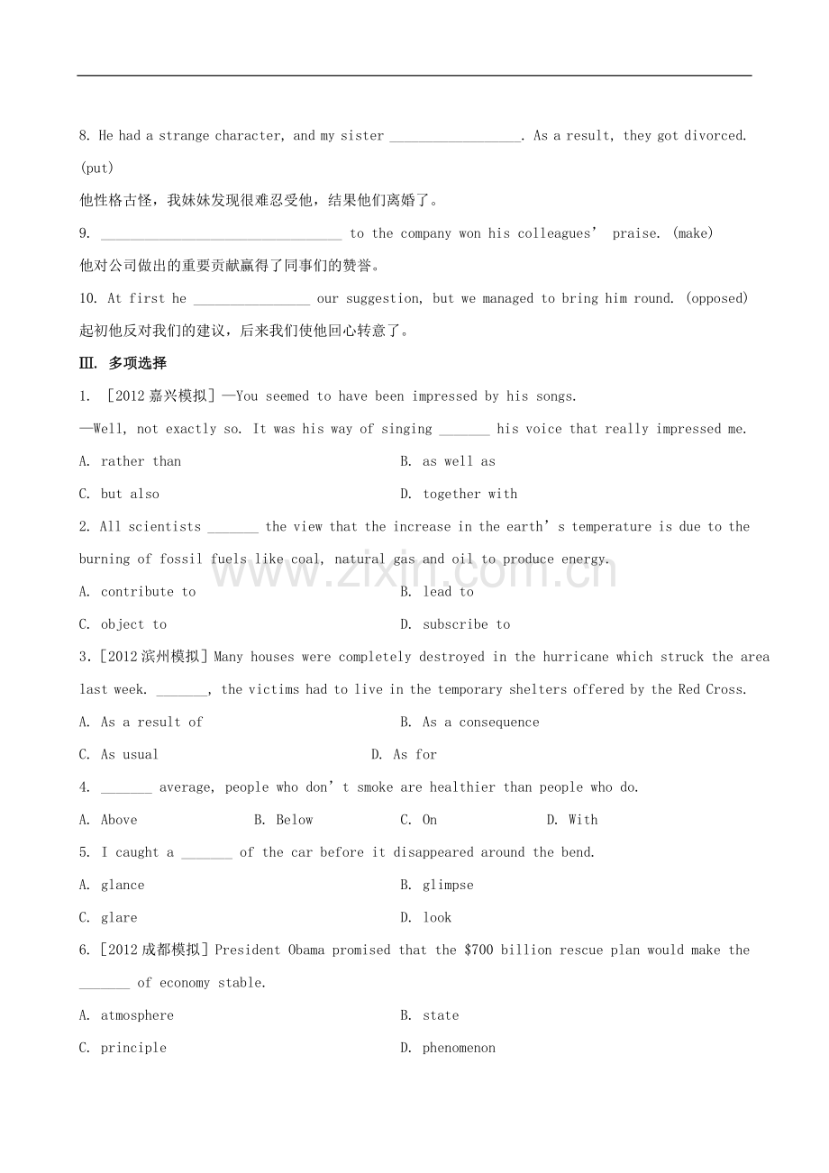 Ⅲ. 1.【解析】选A。考查连接词的意义。答句句意:噢,并不完全是这样。是他的演唱方式而不是他的歌声使我印象深刻。由句意可知A为正确选项;as well as,together with两项虽然结构上也对,但不符合not exactly so的语境。