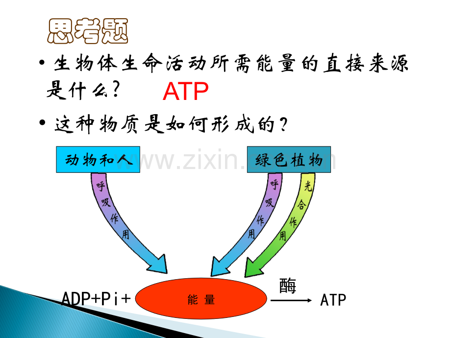 生物体生命活动所需能量的直接来源 是什么?这种物质是如何形成的?动物和人绿色植物能 量ADP+Pi+ATP酶思考题ATP 的主要来源 细胞呼吸1 1 1 1说出线粒体的结构和功能。说出线粒体的结构和功能。说出线粒体的结构和功能。说出线粒体的结构和功能。2 2 2 2说明有氧呼吸和无氧呼吸的异同。说明有氧呼吸和无氧呼吸的异同。说明有氧呼吸和无氧呼吸的异同。说明有氧呼吸和无氧呼吸的异同。3 3 3 3说明细胞呼吸的原理,并探讨其在说明细胞呼吸的原理,并探讨其在说明细胞呼吸的原理,并探讨其在说明细胞呼吸的原理,并探讨其在 生产和生活中的应用。生产和生活中的应用。生产和生活中的应用。生产和生活中的应用。4.4.4.4.进行酵母菌细胞呼吸方式的探究。进行酵母菌细胞呼吸方式的探究。进行酵母菌细胞呼吸方式的探究。进行酵母菌细胞呼吸方式的探究。学习目标 概念:有机物在活细胞内氧化分解为二氧化碳和水或分解为一些不彻底的氧化产物,并且伴随着能量释放的过程。实质:生物氧化 特征:1、温和条件下逐步进行2、需酶的作用3、能量分段释放一、细胞呼吸讨论讨论、酒的主要成分是酒精。它是酵母菌 在什么条件下产生的呢?、我们吃的面包和馒头为什么比较 松软?这与酵母菌有什么关系?酵母菌发挥这种作用需要什么条件呢?探究:酵母菌细胞呼吸的方式酵母菌:单细胞真菌营养方式:异养探究活动探究酵母菌细胞呼吸的方式探究酵母菌细胞呼吸的方式一、实验原理1、酵母菌是一种单细胞真菌,在有氧和无氧的条件下都可以生存,属于兼性厌氧菌。2、CO2的检测方法(1)CO2使澄清石灰水变浑浊(2)CO2使溴麝香草酚蓝水溶液由蓝变绿再变黄3、酒精的检测橙色的重铬酸钾溶液在酸性条件下与酒精发生反应,变成灰绿色。二、作出假设 酵母菌在有氧情况下进行有氧呼吸,产生CO2,在无氧情况下进行无氧呼吸,产生CO2和酒精。三、设计实验1、配制酵母菌培养液(等量原则)置于A、B锥形瓶2、组装有氧呼吸和无氧呼吸装置图,放置在25-35 的环境 下培养8-10小时。3、检测CO2的产生4、检测酒精的产生(1)取2支试管编号(2)各取A、B锥形瓶酵母菌培养液的滤液2毫升,注入试管(3)分别滴加0.5毫升重铬酸钾-浓硫酸溶液,轻轻振荡、混匀四、实验结果预测1、酵母菌在有氧和无氧情况下均产生了CO2,能使澄清石灰水变浑浊。2、酵母菌在有氧情况下,没有酒精生成,不能使重铬酸钾溶液发生显色反应;在无氧情况下,生成了酒精,使重铬酸钾溶液发生灰绿色显色反应。条件澄清石灰水/出现的时间 重铬酸钾重铬酸钾-浓硫酸溶液浓硫酸溶液有氧无氧观察、记录实验结论酵母菌在有氧和无氧条件下都能进行细胞呼吸。在有氧条件下,通过细胞呼吸产生大量的CO2和H2O;在无氧条件下,通过细胞呼吸产生酒精和少量的CO2。问题探讨1、呼吸作用和物质的燃烧有什么共同点?2、呼吸作用能像燃料在体外燃烧那么剧烈吗?3、无氧条件下,细胞能进行呼吸作用释放能量吗?“呼吸”和“呼吸作用”有什么区别?“呼吸”是指生物体或细胞吸入氧气和呼出二氧化碳的过程,而“呼吸作用”是指细胞内有机物分解释放能量的过程。思考 “呼吸”是“呼吸作用”的前提和基础,没有呼吸过程吸入的氧气,就不能进行呼吸作用;而“呼吸作用”是“呼吸”的继续。“呼吸”和“呼吸作用”有什么联系?思考细胞内 +糖 类+水 CO2能 量呼吸作用(本质)高等动物的呼吸现象和呼吸作用O2O2呼吸(现象)呼吸器官血液循环血液循环呼吸器官CO2气体运输+二、细胞呼吸的类型有氧呼吸无氧呼吸细胞呼吸二、有 氧 呼 吸阅读教材有氧呼吸的有关内容,思考下列问题:1、生物体的能源物质有哪些?主要的能源物质是什么?最常利用的能源物质是什么?2、有氧呼吸发生的场所在哪里?5min5min3、有氧呼吸分为三个阶段,每一阶段分别生成了什么物质?最终的产物是什么?4、哪些阶段生成H?哪些阶段释放能量?释放能量最多的是哪一阶段?葡萄糖酶少量能量酶丙酮酸H O2 CO2H2O 少量能量大量能量酶HH2O 5、是不是每个阶段都需要的参与呢?6、有氧呼吸的概念是什么?有氧呼吸的主要场所电镜下线粒体的显微结构线粒体的结构示意图线粒体第一个阶段:细胞质基质中第二个阶段:线粒体基质中第三个阶段:线粒体内膜上有氧呼吸的过程酶酶有氧呼吸三个阶段都释放能量,那么这些能量释放出来以后,有哪些去路?二、有 氧 呼 吸1mol葡萄糖2870kJ有氧呼吸热能散失ATP(1161kJ)有氧呼吸的能量去路:二、有 氧 呼 吸是指细胞在氧的参与下,通过多种酶的催化作用,把葡萄糖等有机物彻底氧化分解,产生出二氧化碳和水,释放大量能量,生成许多ATP的过程。概念:二、有 氧 呼 吸C6H12O6+6H2O+6O26CO2+12H2O+能量酶有氧呼吸各个阶段的比较:项目项目阶段阶段场所场所反应物反应物生成物生成物能量能量细胞质基质线粒体线粒体葡萄糖H、O2CO2、HH2O少量能量少量能量大量能量第一阶段第二阶段第三阶段丙酮酸、H2O丙酮酸、H刘翔在训练时常会在第二天早上肌肉发酸,为什么?三、无 氧 呼 吸、无氧呼吸的过程(两个阶段)第一阶段:与有氧呼吸第一阶段完全相同。第二阶段:丙酮酸2C2H5OH+2CO2(酵母菌,高等植物)(酒精)(细胞质基质)酶(细胞质基质)2C3H6O3(人和高等动物,马铃薯块茎,甜菜块根)酶(乳酸)三、无 氧 呼 吸C6H12O6酶2C2H5OH+2CO2+少量能量 (酒精)C6H12O6酶2C3H6O3+少量能量(乳酸)