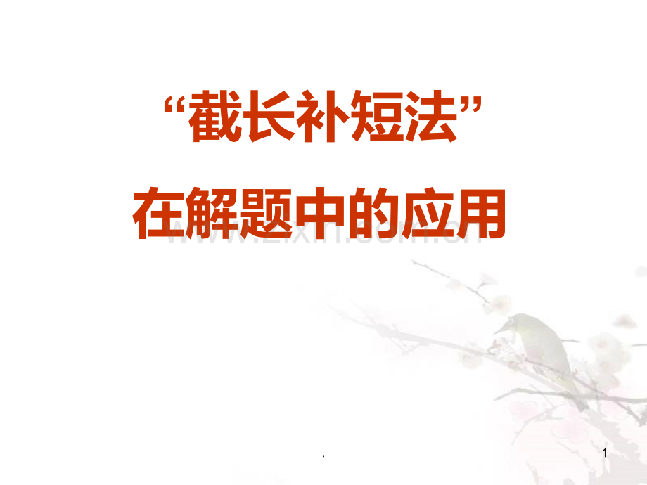 “截长补短法”在解题中的应用1.在 ABC中,ACB=90,AC=BC,直线MN经过点C,且AD MN于D,BE MN于E。求证:DE=AD+BE证明:213 1+3=90.1+2=90.2=3.ADC=CEB ADCCEB AD=CE,CD=BE DE=AD+BE ACB=90,BE MN,AD MN,ADC=CEB=90.在 ADC和 CEB中,AC=BC 2=3 DE=CE+CD2.例题讲解1.在 ABC中,B2 C,AD平分 BAC.求证:AB+BD=ACABCDE证明:在AC上截取A E=AB,连结D E AD平分 BAC 1 2,在 ABD和 AED中 1 2A B=AEA D=AD ABD AED BD=DE,B 3 3=4+C B2 C 3=2 C 2 C=4+C DE=CE BD=CE AE+EC=AC AB+BD=AC1234 C 4截长法3.例题讲解在 ABC中,B2 C,AD平分BAC.求证:AB+BD=ACABCDE在AB的延长线截取B E=BD,连结D E.证明:补短法在射线 AB截取B E=BD,连结D E.4.截长法与补短法,具体做法是在某条线段上截取一条线段与特定线段相等,或是将某条线段延长使之与特定线段相等,再利用三角形全等的有关性质加以说明这种作法,适合于证明线段的和、差、倍、分等类的题目5.2.2.如图,在 ABCABC中,ABC=60,ADABC=60,AD、CECE分别平分BACBAC、ACB,ACB,求证:AC=AE+CDAC=AE+CDACEBOD在AC上取CF=CD,连OF证 AEOAFO得 CODCOF,AOC=120 AOE=DOC=60=FOCF例题讲解6.如图,AD BC,AE,BE分别平分 DAB,CBA,CD经过点E,求证:ABAD+BC练习7.在等边 ABC的两边AB、AC所在直线上分别有两点M、N,D为 ABC外一点,且 MDN=60,BDC=120,BD=DC.探究:当M、N分别在直线AB、AC上移动时,BM、NC、MN之间的数量关系.如图1,当点M、N边AB、AC上,且DM=DN时,BM、NC、MN之间的数量关系是 ABCDMN思考题8.在等边 ABC的两边AB、AC所在直线上分别有两点M、N,D为 ABC外一点,且 MDN=60,BDC=120,BD=DC.探究:当M、N分别在直线AB、AC上移动时,BM、NC、MN之间的数量关系.如图2,点M、N边AB、AC上,且当DMDN时,猜想(I)的结论还成立吗?ABCDMN写出你的猜想并加以证明;9.如图3,点M、N分别在边AB、CA的延长线上时,猜想(I)的结论还成立吗?若不成立,又有怎样的数量关系?写出你的猜想并加以证明.ABCDMN10.著名的数学家,莫斯科大学教授雅洁卡提出:“解题就是把要解的题转化为已经解过的题”。许多题目我们都解过,怎样转化呢?加油吧!11.