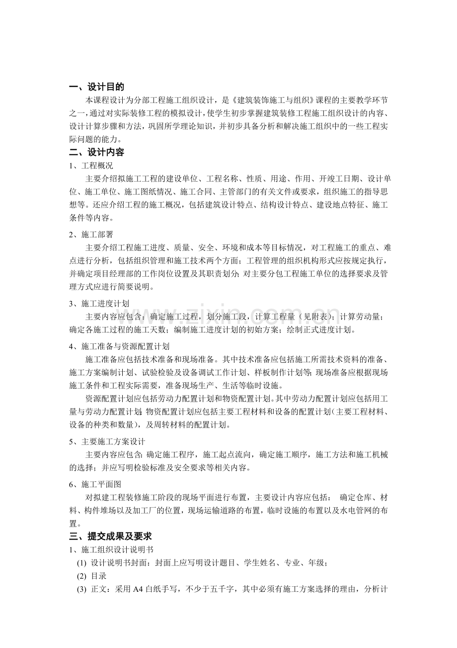 本课程设计为分部工程施工组织设计,是《建筑装饰施工与组织》课程的主要教学环节之一,通过对实际装修工程的模拟设计,使学生初步掌握建筑装修工程施工组织设计的内容、设计计算步骤和方法,巩固所学理论知识,并初步具备分析和解决施工组织中的一些工程实际问题的能力。
