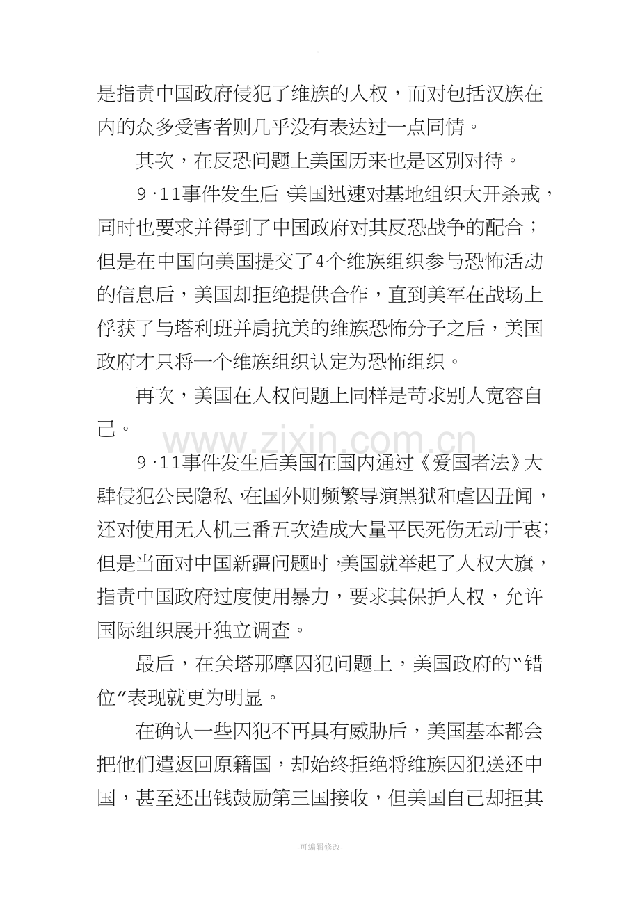 9·11事件发生后美国在国内通过《爱国者法》大肆侵犯公民隐私,在国外则频繁导演黑狱和虐囚丑闻,还对使用无人机三番五次造成大量平民死伤无动于衷;但是当面对中国新疆问题时,美国就举起了人权大旗,指责中国政府过度使用暴力,要求其保护人权,允许国际组织展开独立调查。