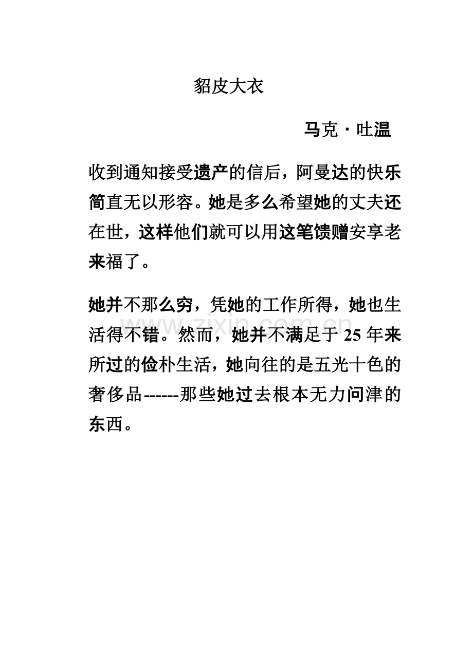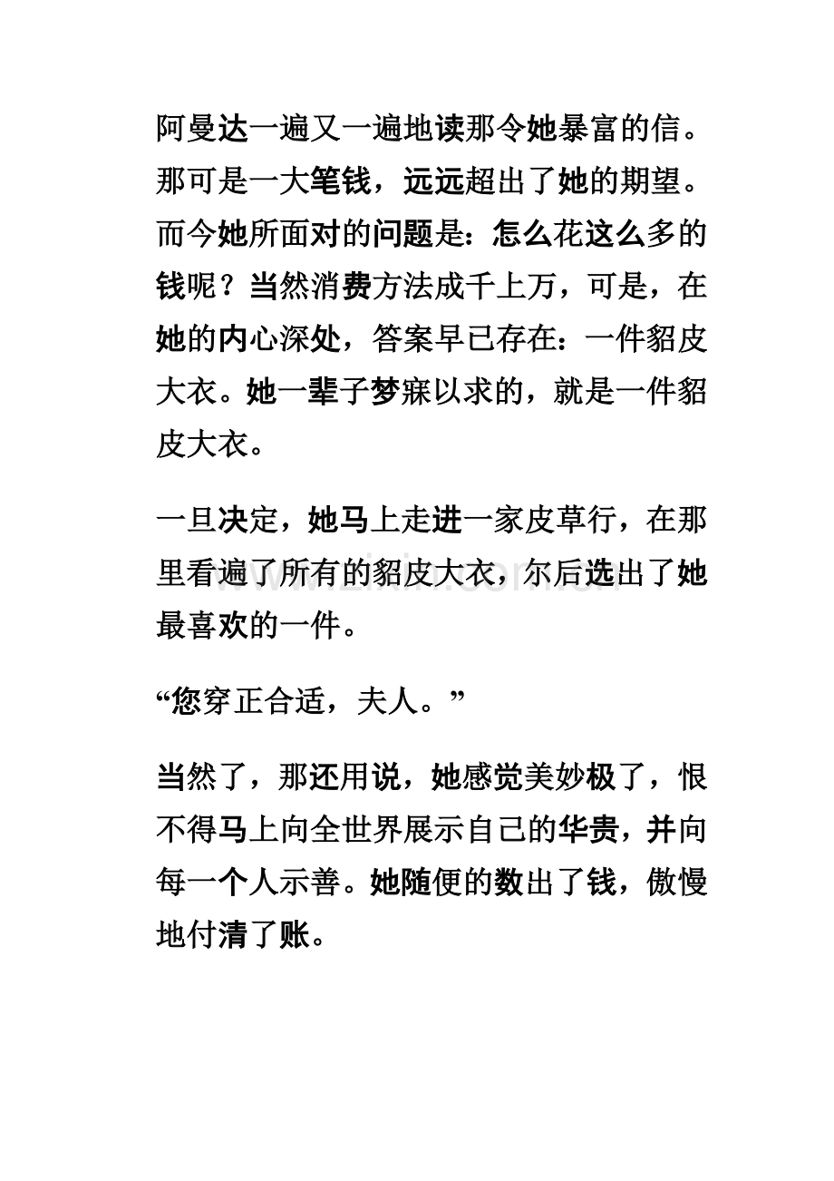 C、“她惊奇地发现自己对貂皮大衣已经恨之入骨了”表明阿曼达对奢侈品有了重新的认识,让她认识到财富的罪恶。